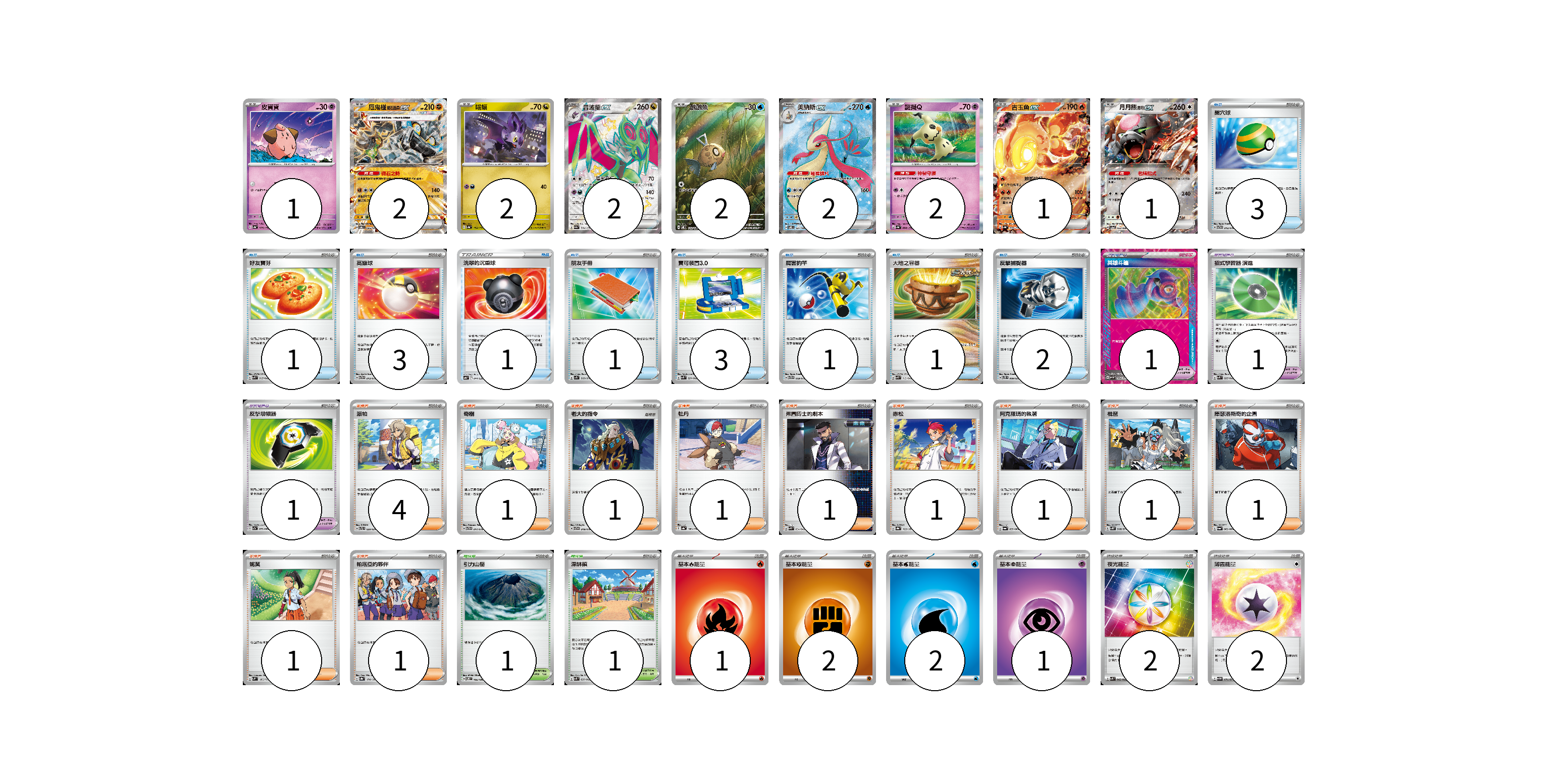 牌組構築方案 以此牌組為基礎新構築牌組 顯示卡面 顯示列表 寶可夢卡(15) 1 2 2 2 2 2 2 1 1 寶可夢道具(3) 1 1 1 物品卡(16) 3 1 3 1 1 3 1 1 2 支援者卡(14) 4 1 1 1 1 1 1 1 1 1 1 競技場卡(2) 1 1 能量卡(10) 1 2 2 1 2 2 寶可夢卡(15) 卡牌名稱 張數 卡牌名稱 張數 皮寶寶 SV4a 077/190 01 厄鬼椪 礎石面具ex SV6 065/101 02 嗡蝠 SV4a 134/190 02 音波龍ex SV4a 334/190 02 醜醜魚 SV8 110/106 02 美納斯ex SV8 121/106 02 謎擬Q SV4a 088/190 02 古玉魚ex SV4a 035/190 01 月月熊 赫月 ex SV5a 052/066 01 寶可夢道具(3) 卡牌名稱 張數 卡牌名稱 張數 英雄斗篷 SV5M 064/071 01 招式學習器 演進 SVK 025/042 01 反擊增幅器 SV7a 059/064 01 物品卡(16) 卡牌名稱 張數 卡牌名稱 張數 巢穴球 SVTG 012/019 03 好友寶芬 SVK 015/042 01 高級球 SVTG 013/019 03 洗翠的沉重球 SVB 014/028 01 朋友手冊 SV1S 069/078 01 寶可裝置3.0 SVK 021/042 03 厲害釣竿 SVTG 009/019 01 大地之容器 SVK 012/042 01 反擊捕捉器 SVTS 009/022 02 支援者卡(14) 卡牌名稱 張數 卡牌名稱 張數 派帕 SVTL 020/021 04 奇樹 SVTG 017/019 01 老大的指令 SVTG 019/019 01 牡丹 SV4a 182/190 01 弗圖博士的劇本 SVK 034/042 01 赤松 SV8a 163/187 01 阿克羅瑪的執著 SV6a 059/064 01 枇琶 SV5K 068/071 01 庫瑟洛斯奇的企圖 SV6a 062/064 01 妮莫 SVM 161/175 01 帕底亞的夥伴 SV8a 174/187 01 競技場卡(2) 卡牌名稱 張數 卡牌名稱 張數 引力山岳 SV8 106/106 01 深缽鎮 SVK 039/042 01 能量卡(10) 卡牌名稱 張數 卡牌名稱 張數 基本火能量 sv-p FIR 01 基本鬥能量 sv-p FIG 02 基本水能量 sv-p WAT 02 基本超能量 sv-p PSY 01 夜光能量 SVK 042/042 02 薄霧能量 SV5M 071/071 02 以此牌組為基礎新構築牌組 牌組編碼 DsquvZ-rHQhmn-MWAFBD copy 列印牌組單 牌組編碼已複製 分享至SNS