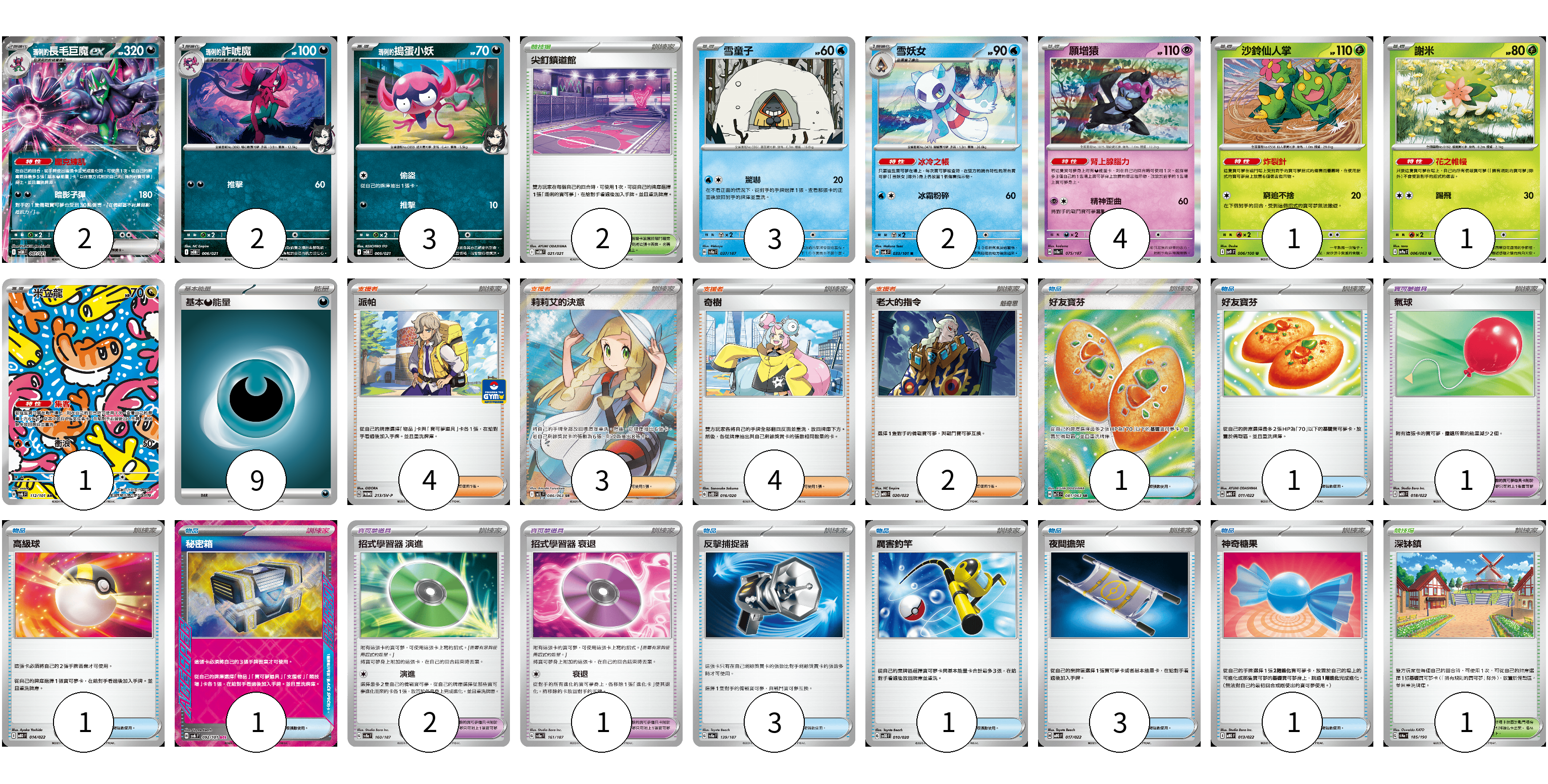 牌組構築方案 以此牌組為基礎新構築牌組 顯示卡面 顯示列表 寶可夢卡(19) 2 2 3 3 2 4 1 1 1 寶可夢道具(4) 1 2 1 物品卡(12) 1 1 1 1 3 1 3 1 支援者卡(13) 4 3 4 2 競技場卡(3) 2 1 能量卡(9) 9 寶可夢卡(19) 卡牌名稱 張數 卡牌名稱 張數 <瑪俐的>長毛巨魔ex SVOM 007/021 02 <瑪俐的>詐唬魔 SVOM 006/021 02 <瑪俐的>搗蛋小妖 SVOM 005/021 03 雪童子 SV8a 037/187 03 雪妖女 SV6 033/101 02 願增猿 SV8a 075/187 04 沙鈴仙人掌 SV9 006/100 01 謝米 SV9a 006/063 01 米立龍 SV6 112/101 01 寶可夢道具(4) 卡牌名稱 張數 卡牌名稱 張數 氣球 MBD 018/022 01 招式學習器 演進 SV8a 160/187 02 招式學習器 衰退 SV8a 161/187 01 物品卡(12) 卡牌名稱 張數 卡牌名稱 張數 好友寶芬 M1S 081/063 01 好友寶芬 MBG 011/022 01 高級球 MBD 014/022 01 秘密箱 SV6 092/101 01 反擊捕捉器 SV8a 139/187 03 厲害釣竿 SVOD 010/020 01 夜間擔架 MBG 017/022 03 神奇糖果 MBG 013/022 01 支援者卡(13) 卡牌名稱 張數 卡牌名稱 張數 派帕 SV-P 213/SV-P 04 莉莉艾的決意 M1L 086/063 03 奇樹 SVOD 016/020 04 老大的指令 MBD 020/022 02 競技場卡(3) 卡牌名稱 張數 卡牌名稱 張數 尖釘鎮道館 SVOM 021/021 02 深缽鎮 SV4a 185/190 01 能量卡(9) 卡牌名稱 張數 卡牌名稱 張數 基本惡能量 sv-p DAR 09 以此牌組為基礎新構築牌組 牌組編碼 DtARMp-BwEuvm-vqMvmw copy 列印牌組單 牌組編碼已複製 分享至SNS