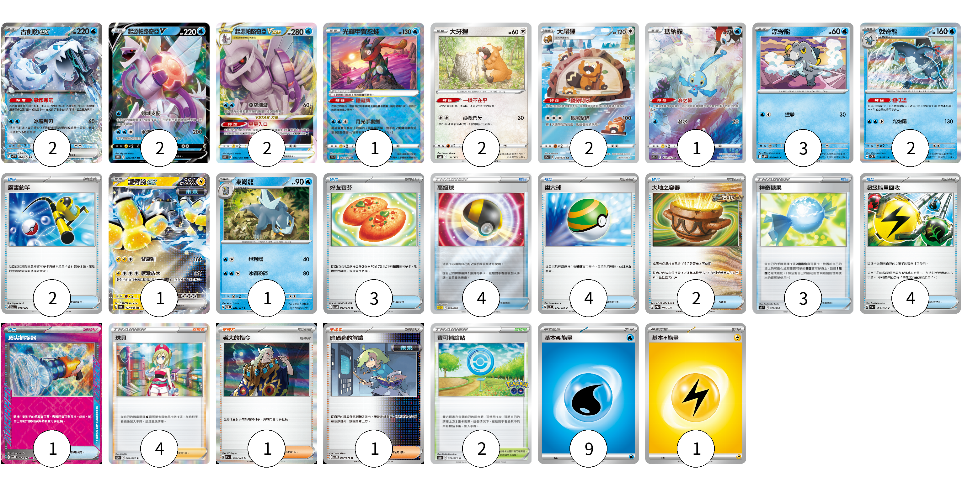 牌組構築方案 以此牌組為基礎新構築牌組 顯示卡面 顯示列表 寶可夢卡(21) 2 2 2 1 2 2 1 3 2 2 1 1 物品卡(21) 3 4 4 2 3 4 1 支援者卡(6) 4 1 1 競技場卡(2) 2 能量卡(10) 9 1 寶可夢卡(21) 卡牌名稱 張數 卡牌名稱 張數 古劍豹ex SV2P 028/071 02 起源帕路奇亞V S10P 022/067 02 起源帕路奇亞VSTAR S10P 023/067 02 光輝甲賀忍蛙 S9a 026/067 01 大牙狸 S12a 121/172 02 大尾狸 S12a 200/172 02 瑪納霏 S12a 178/172 01 涼脊龍 SV2P 024/071 03 戟脊龍 SV2P 027/071 02 厲害釣竿 SVEL 010/020 02 鐵臂膀ex SV4M 027/066 01 凍脊龍 SV2P 026/071 01 物品卡(21) 卡牌名稱 張數 卡牌名稱 張數 好友寶芬 SV5K 063/071 03 高級球 SPZ 009/020 04 巢穴球 SV1S 070/078 04 大地之容器 SVHK 011/022 02 神奇糖果 SI 376/414 03 超級能量回收 SV1a 064/073 04 頂尖捕捉器 SV5M 062/071 01 支援者卡(6) 卡牌名稱 張數 卡牌名稱 張數 珠貝 S10P 064/067 04 老大的指令 SV1a 069/073 01 暗碼迷的解讀 SV5M 067/071 01 競技場卡(2) 卡牌名稱 張數 卡牌名稱 張數 寶可補給站 S10b 071/071 02 能量卡(10) 卡牌名稱 張數 卡牌名稱 張數 基本水能量 sv-p WAT 09 基本雷能量 sv-p LIG 01 以此牌組為基礎新構築牌組 牌組編碼 DtCpJQ-oeorsH-XzjWEu copy 列印牌組單 牌組編碼已複製 分享至SNS