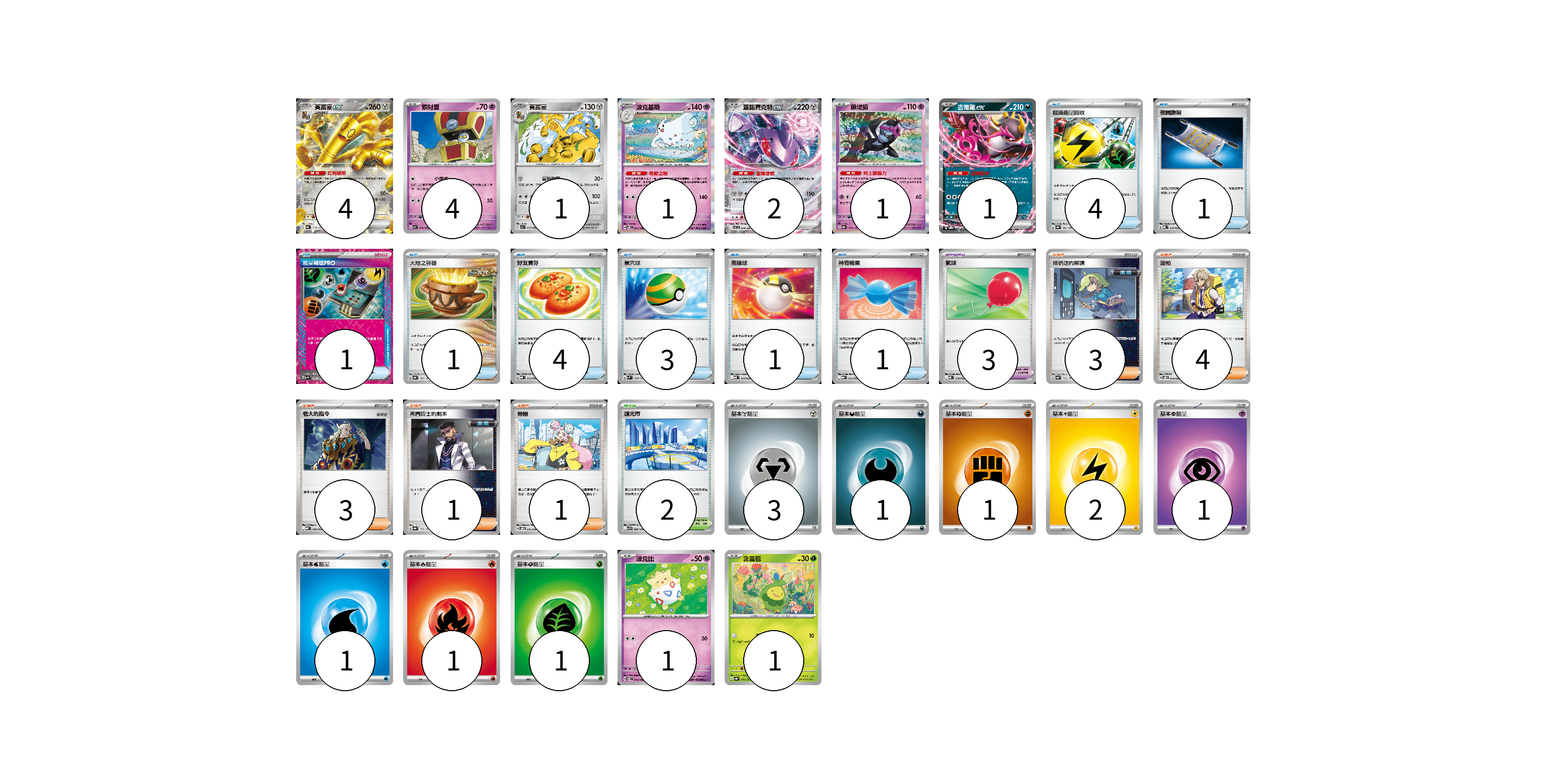 牌組構築方案 以此牌組為基礎新構築牌組 顯示卡面 顯示列表 寶可夢卡(16) 4 4 1 1 2 1 1 1 1 寶可夢道具(3) 3 物品卡(16) 4 1 1 1 4 3 1 1 支援者卡(12) 3 4 3 1 1 競技場卡(2) 2 能量卡(11) 3 1 1 2 1 1 1 1 寶可夢卡(16) 卡牌名稱 張數 卡牌名稱 張數 賽富豪ex SV8a 117/187 04 索財靈 SV7a 024/064 04 賽富豪 SV7a 038/064 01 波克基斯 SV8 047/106 01 蓋諾賽克特ex SV11B 069/086 02 願增猿 SV8a 075/187 01 吉雉雞ex SVOD 004/020 01 波克比 SV8 045/106 01 含羞苞 SV8a 001/187 01 寶可夢道具(3) 卡牌名稱 張數 卡牌名稱 張數 氣球 MBD 018/022 03 物品卡(16) 卡牌名稱 張數 卡牌名稱 張數 超級能量回收 SV8a 141/187 04 夜間擔架 MBD 016/022 01 能量輸送PRO SV7a 052/064 01 大地之容器 SV8a 143/187 01 好友寶芬 MBD 013/022 04 巢穴球 SVM 133/175 03 高級球 MBD 014/022 01 神奇糖果 MBG 013/022 01 支援者卡(12) 卡牌名稱 張數 卡牌名稱 張數 暗碼迷的解讀 SV8a 165/187 03 派帕 SVOD 018/020 04 老大的指令 MBD 020/022 03 弗圖博士的劇本 SV8a 175/187 01 奇樹 SVOD 016/020 01 競技場卡(2) 卡牌名稱 張數 卡牌名稱 張數 釀光市 SV9 098/100 02 能量卡(11) 卡牌名稱 張數 卡牌名稱 張數 基本鋼能量 sv-p MET 03 基本惡能量 sv-p DAR 01 基本鬥能量 sv-p FIG 01 基本雷能量 sv-p LIG 02 基本超能量 sv-p PSY 01 基本水能量 sv-p WAT 01 基本火能量 sv-p FIR 01 基本草能量 sv-p GRA 01 以此牌組為基礎新構築牌組 牌組編碼 DtIkBW-eAxlgG-eqwXNg copy 列印牌組單 牌組編碼已複製 分享至SNS