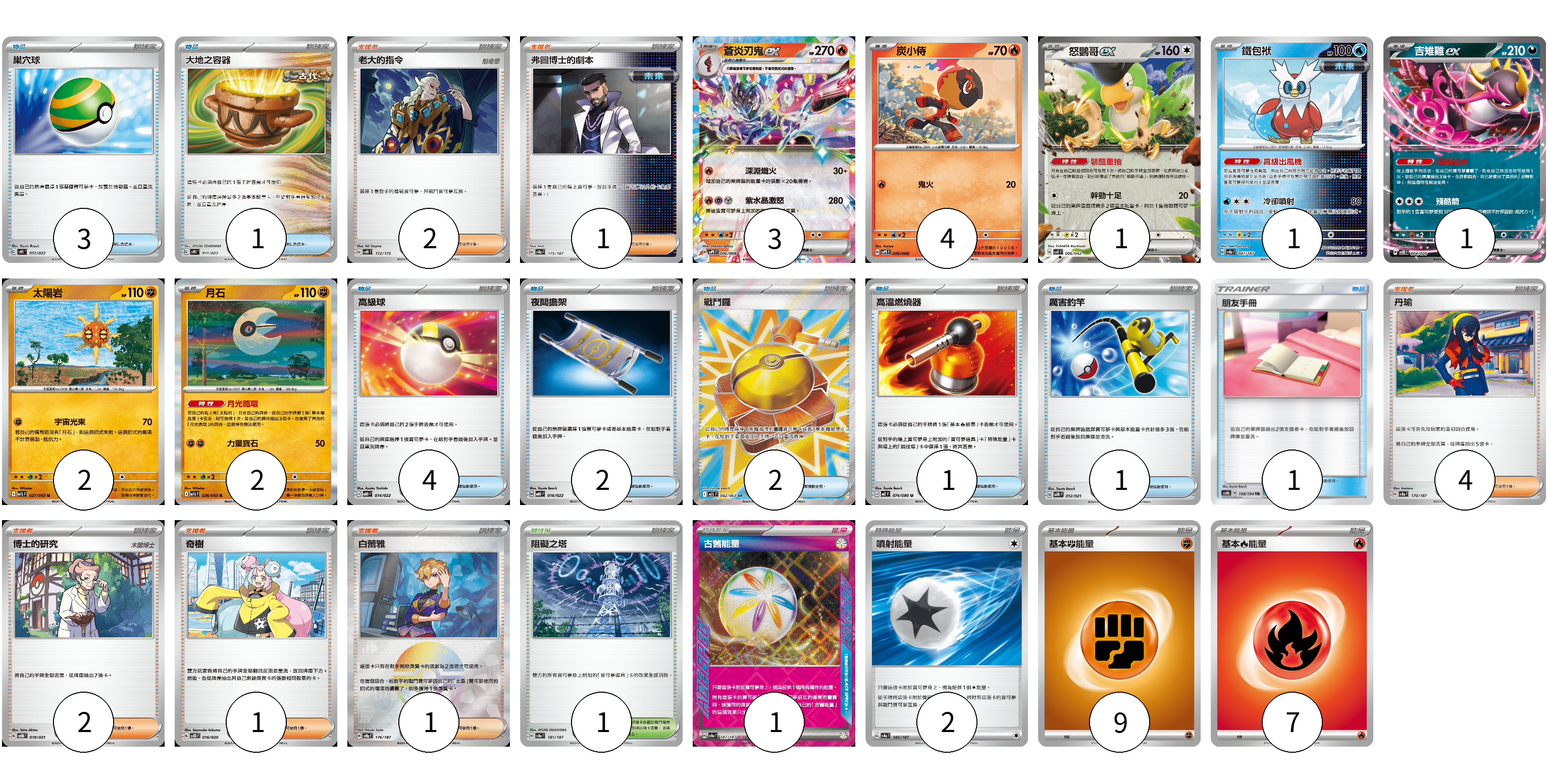 牌組構築方案 以此牌組為基礎新構築牌組 顯示卡面 顯示列表 寶可夢卡(14) 3 4 1 1 1 2 2 物品卡(15) 3 1 4 2 2 1 1 1 支援者卡(11) 2 1 4 2 1 1 競技場卡(1) 1 能量卡(19) 1 2 9 7 寶可夢卡(14) 卡牌名稱 張數 卡牌名稱 張數 蒼炎刃鬼ex SVPS 006/008 03 炭小侍 SVPS 005/008 04 怒鸚哥ex SVK 006/042 01 鐵包袱 SV8a 047/187 01 吉雉雞ex SVOD 004/020 01 太陽岩 M1L 027/063 02 月石 M1L 026/063 02 物品卡(15) 卡牌名稱 張數 卡牌名稱 張數 巢穴球 SVHK 012/022 03 大地之容器 SVHK 011/022 01 高級球 MBD 014/022 04 夜間擔架 MBD 016/022 02 戰鬥鑼 M1L 082/063 02 高溫燃燒器 M2 074/080 01 厲害釣竿 SVTR 012/021 01 朋友手冊 AS6b 188/194 01 支援者卡(11) 卡牌名稱 張數 卡牌名稱 張數 老大的指令 SVM 172/175 02 弗圖博士的劇本 SV8a 175/187 01 丹瑜 SV8a 170/187 04 博士的研究 SVOM 019/021 02 奇樹 SVOD 016/020 01 白蕾雅 SV8a 176/187 01 競技場卡(1) 卡牌名稱 張數 卡牌名稱 張數 阻礙之塔 SV8a 181/187 01 能量卡(19) 卡牌名稱 張數 卡牌名稱 張數 古舊能量 SV8a 187/187 01 噴射能量 SV8a 185/187 02 基本鬥能量 sv-p FIG 09 基本火能量 sv-p FIR 07 以此牌組為基礎新構築牌組 牌組編碼 DuDfNo-kVIFHa-hPteOp copy 列印牌組單 牌組編碼已複製 分享至SNS