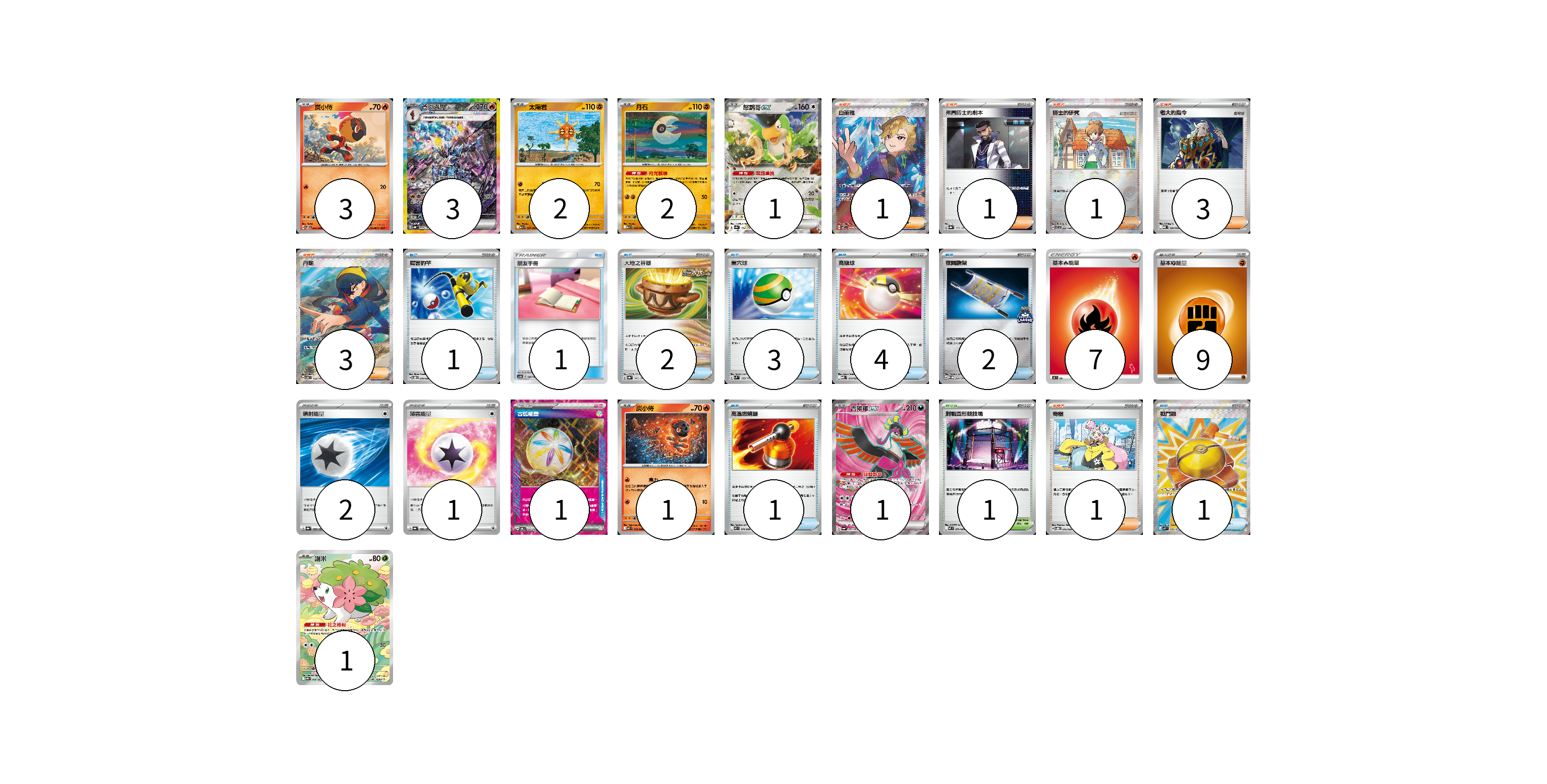牌組構築方案 以此牌組為基礎新構築牌組 顯示卡面 顯示列表 寶可夢卡(14) 3 3 2 2 1 1 1 1 物品卡(15) 1 1 2 3 4 2 1 1 支援者卡(10) 1 1 1 3 3 1 競技場卡(1) 1 能量卡(20) 7 9 2 1 1 寶可夢卡(14) 卡牌名稱 張數 卡牌名稱 張數 炭小侍 SVPS 005/008 03 蒼炎刃鬼ex SV8a 203/187 03 太陽岩 M1L 027/063 02 月石 M1L 026/063 02 怒鸚哥ex SV4a 154/190 01 炭小侍 M2 019/080 01 吉雉雞ex SV6a 081/064 01 謝米 SV9a 066/063 01 物品卡(15) 卡牌名稱 張數 卡牌名稱 張數 厲害釣竿 SVOD 010/020 01 朋友手冊 AS6b 188/194 01 大地之容器 SV8a 143/187 02 巢穴球 SVM 133/175 03 高級球 MBD 014/022 04 夜間擔架 SV-P 204/SV-P 02 高溫燃燒器 M2 074/080 01 戰鬥鑼 M1L 082/063 01 支援者卡(10) 卡牌名稱 張數 卡牌名稱 張數 白蕾雅 SV7 126/102 01 弗圖博士的劇本 SV8a 175/187 01 博士的研究 SV11B 084/086 01 老大的指令 MBD 020/022 03 丹瑜 SV6 123/101 03 奇樹 SVOD 016/020 01 競技場卡(1) 卡牌名稱 張數 卡牌名稱 張數 對戰圓形競技場 M2 079/080 01 能量卡(20) 卡牌名稱 張數 卡牌名稱 張數 基本火能量 SH FIR 07 基本鬥能量 sv-p FIG 09 噴射能量 SV8a 185/187 02 薄霧能量 SV8a 186/187 01 古舊能量 SV6 101/101 01 以此牌組為基礎新構築牌組 牌組編碼 DudBdy-wehqgk-CiXGqL copy 列印牌組單 牌組編碼已複製 分享至SNS