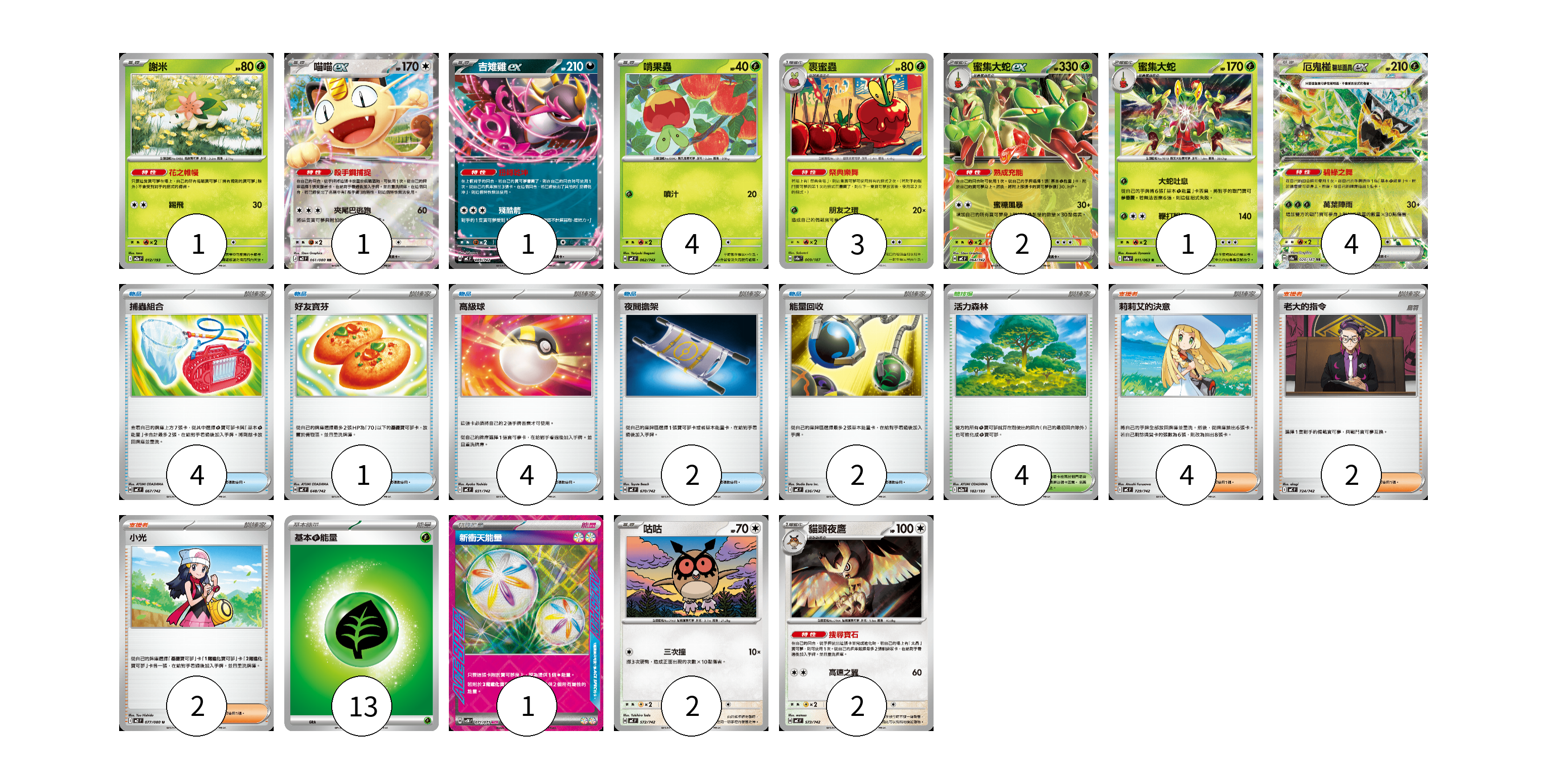 牌組構築方案 以此牌組為基礎新構築牌組 顯示卡面 顯示列表 寶可夢卡(21) 1 1 1 4 3 2 1 4 2 2 物品卡(13) 4 1 4 2 2 支援者卡(8) 4 2 2 競技場卡(4) 4 能量卡(14) 13 1 寶可夢卡(21) 卡牌名稱 張數 卡牌名稱 張數 謝米 M2a 012/193 01 喵喵ex M3 061/080 01 吉雉雞ex MC 489/742 01 啃果蟲 MC 062/742 04 裹蜜蟲 SV8a 009/187 03 蜜集大蛇ex MC 064/742 02 蜜集大蛇 SV9a 011/063 01 厄鬼椪 碧草面具ex SV8a 020/187 04 咕咕 MC 572/742 02 貓頭夜鷹 MC 573/742 02 物品卡(13) 卡牌名稱 張數 卡牌名稱 張數 捕蟲組合 MC 667/742 04 好友寶芬 MC 648/742 01 高級球 MC 651/742 04 夜間擔架 MC 670/742 02 能量回收 MC 636/742 02 支援者卡(8) 卡牌名稱 張數 卡牌名稱 張數 莉莉艾的決意 MC 729/742 04 老大的指令 MC 724/742 02 小光 M2 077/080 02 競技場卡(4) 卡牌名稱 張數 卡牌名稱 張數 活力森林 M2a 182/193 04 能量卡(14) 卡牌名稱 張數 卡牌名稱 張數 基本【草】能量 MJ GRA 13 新衝天能量 SV5K 071/071 01 以此牌組為基礎新構築牌組 牌組編碼 DvUbdY-OUIKOG-zQvfcZ copy 列印牌組單 牌組編碼已複製 分享至SNS