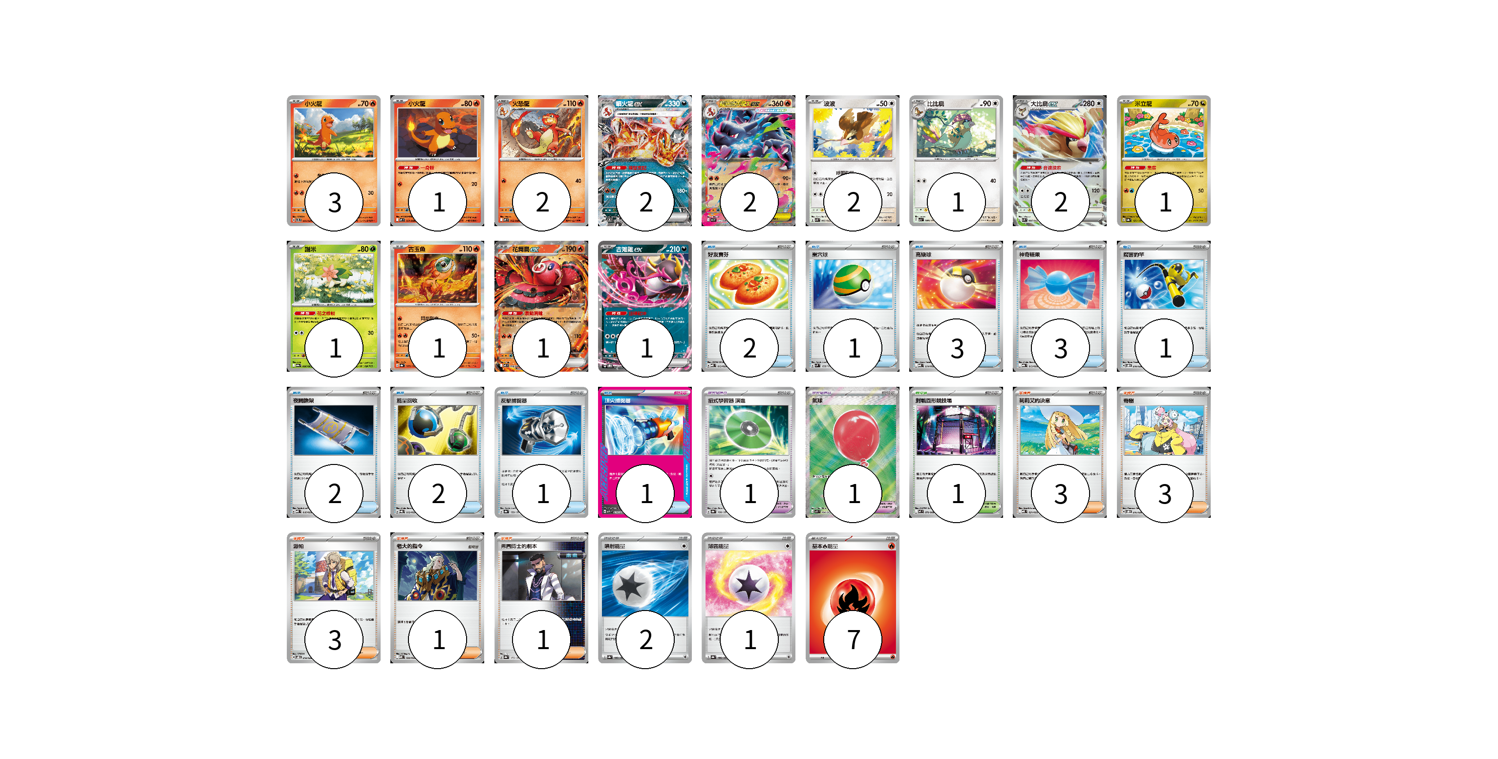 牌組構築方案 以此牌組為基礎新構築牌組 顯示卡面 顯示列表 寶可夢卡(20) 3 1 2 2 2 2 1 2 1 1 1 1 1 寶可夢道具(2) 1 1 物品卡(16) 2 1 3 3 1 2 2 1 1 支援者卡(11) 3 3 3 1 1 競技場卡(1) 1 能量卡(10) 2 1 7 寶可夢卡(20) 卡牌名稱 張數 卡牌名稱 張數 小火龍 SVTL 001/021 03 小火龍 M2 011/080 01 火恐龍 M2 012/080 02 噴火龍ex SVTL 006/021 02 超級噴火龍Xex M2 013/080 02 波波 SVK 003/042 02 比比鳥 SV3 088/108 01 大比鳥ex SVK 005/042 02 米立龍 SV8a 121/187 01 謝米 SV9a 006/063 01 古玉魚 SV8a 025/187 01 花舞鳥ex M2 018/080 01 吉雉雞ex SVOD 004/020 01 寶可夢道具(2) 卡牌名稱 張數 卡牌名稱 張數 招式學習器 演進 SV8a 160/187 01 氣球 M1L 084/063 01 物品卡(16) 卡牌名稱 張數 卡牌名稱 張數 好友寶芬 MBD 013/022 02 巢穴球 SVM 133/175 01 高級球 MBD 014/022 03 神奇糖果 MBG 013/022 03 厲害釣竿 SVOD 010/020 01 夜間擔架 MBD 016/022 02 能量回收 SVQL 012/022 02 反擊捕捉器 SV8a 139/187 01 頂尖捕捉器 MBG 014/022 01 支援者卡(11) 卡牌名稱 張數 卡牌名稱 張數 莉莉艾的決意 MBD 021/022 03 奇樹 SVOD 016/020 03 派帕 SVOD 018/020 03 老大的指令 MBD 020/022 01 弗圖博士的劇本 SV8a 175/187 01 競技場卡(1) 卡牌名稱 張數 卡牌名稱 張數 對戰圓形競技場 M2 079/080 01 能量卡(10) 卡牌名稱 張數 卡牌名稱 張數 噴射能量 SV8a 185/187 02 薄霧能量 SV8a 186/187 01 基本火能量 sv-p FIR 07 以此牌組為基礎新構築牌組 牌組編碼 DwjQig-tepfJV-OCUimW copy 列印牌組單 牌組編碼已複製 分享至SNS