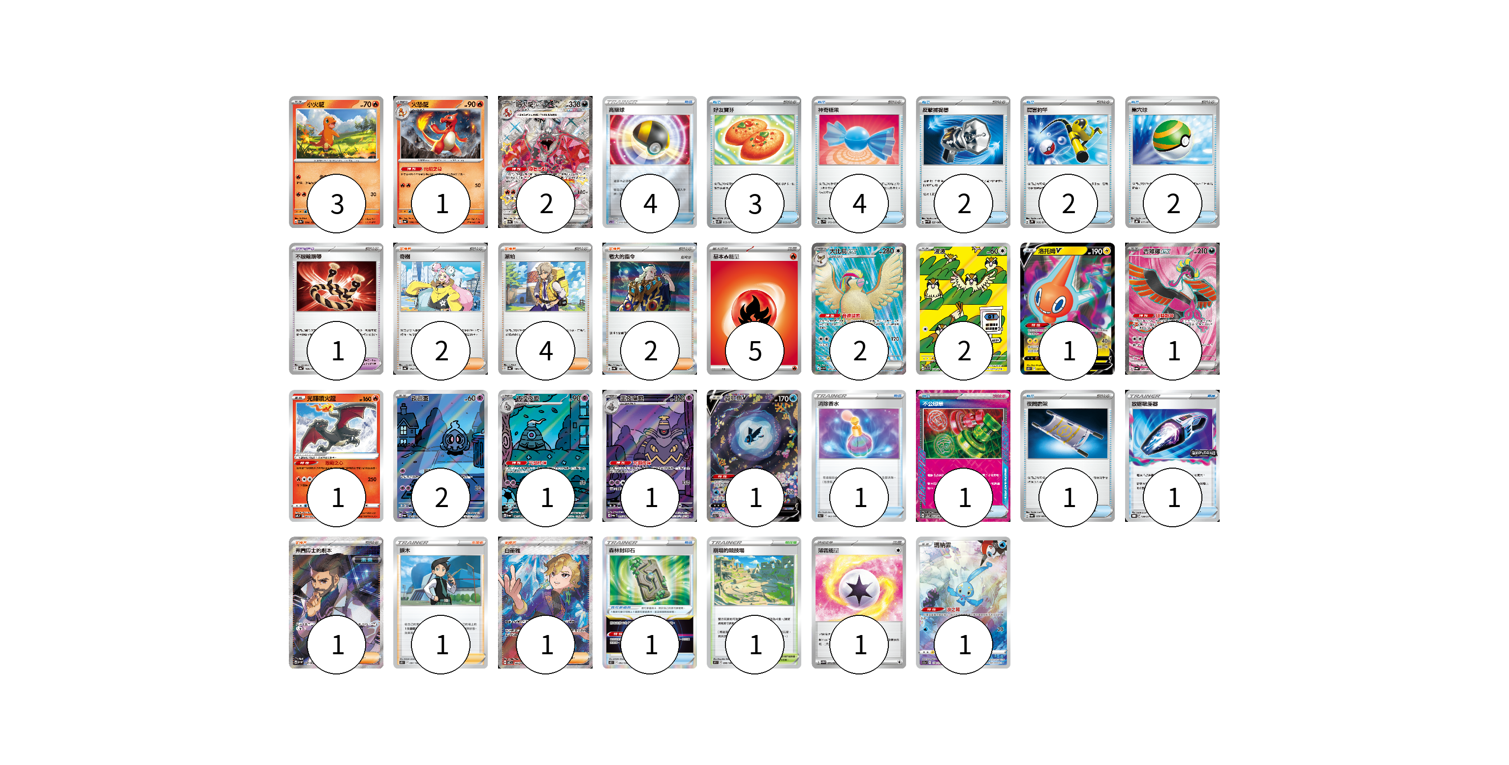 牌組構築方案 以此牌組為基礎新構築牌組 顯示卡面 顯示列表 寶可夢卡(19) 3 1 2 2 2 1 1 1 2 1 1 1 1 寶可夢道具(2) 1 1 物品卡(21) 4 3 4 2 2 2 1 1 1 1 支援者卡(11) 2 4 2 1 1 1 競技場卡(1) 1 能量卡(6) 5 1 寶可夢卡(19) 卡牌名稱 張數 卡牌名稱 張數 小火龍 SV2a 004/165 03 火恐龍 SV4a 026/190 01 噴火龍ex SV4a 331/190 02 大比鳥ex SV3 128/108 02 波波 SV3 118/108 02 洛托姆V S11 037/100 01 吉雉雞ex SV6a 081/064 01 光輝噴火龍 SVTL 003/021 01 夜巡靈 SV6a 068/064 02 彷徨夜靈 SV6a 069/064 01 黑夜魔靈 SV6a 070/064 01 霓虹魚V S12a 216/172 01 瑪納霏 S12a 178/172 01 寶可夢道具(2) 卡牌名稱 張數 卡牌名稱 張數 不服輸頭帶 SV4a 168/190 01 森林封印石 S12 092/098 01 物品卡(21) 卡牌名稱 張數 卡牌名稱 張數 高級球 SPD 010/020 04 好友寶芬 SV5K 063/071 03 神奇糖果 SV1V 072/078 04 反擊捕捉器 SV4M 059/066 02 厲害釣竿 SV2P 066/071 02 巢穴球 SVHK 012/022 02 消除香水 S9a 063/067 01 不公印章 SV5a 053/066 01 夜間擔架 SV6a 056/064 01 放逐吸塵器 SV-P 139/SV-P 01 支援者卡(11) 卡牌名稱 張數 卡牌名稱 張數 奇樹 SV4a 174/190 02 派帕 SV4a 180/190 04 老大的指令 SV4a 181/190 02 弗圖博士的劇本 SV4M 086/066 01 捩木 S11 097/100 01 白蕾雅 SV7 126/102 01 競技場卡(1) 卡牌名稱 張數 卡牌名稱 張數 崩塌的競技場 S9 098/100 01 能量卡(6) 卡牌名稱 張數 卡牌名稱 張數 基本火能量 sv-p FIR 05 薄霧能量 SV5M 071/071 01 以此牌組為基礎新構築牌組 牌組編碼 DwvMWC-QHqvZa-aPlOhp copy 列印牌組單 牌組編碼已複製 分享至SNS