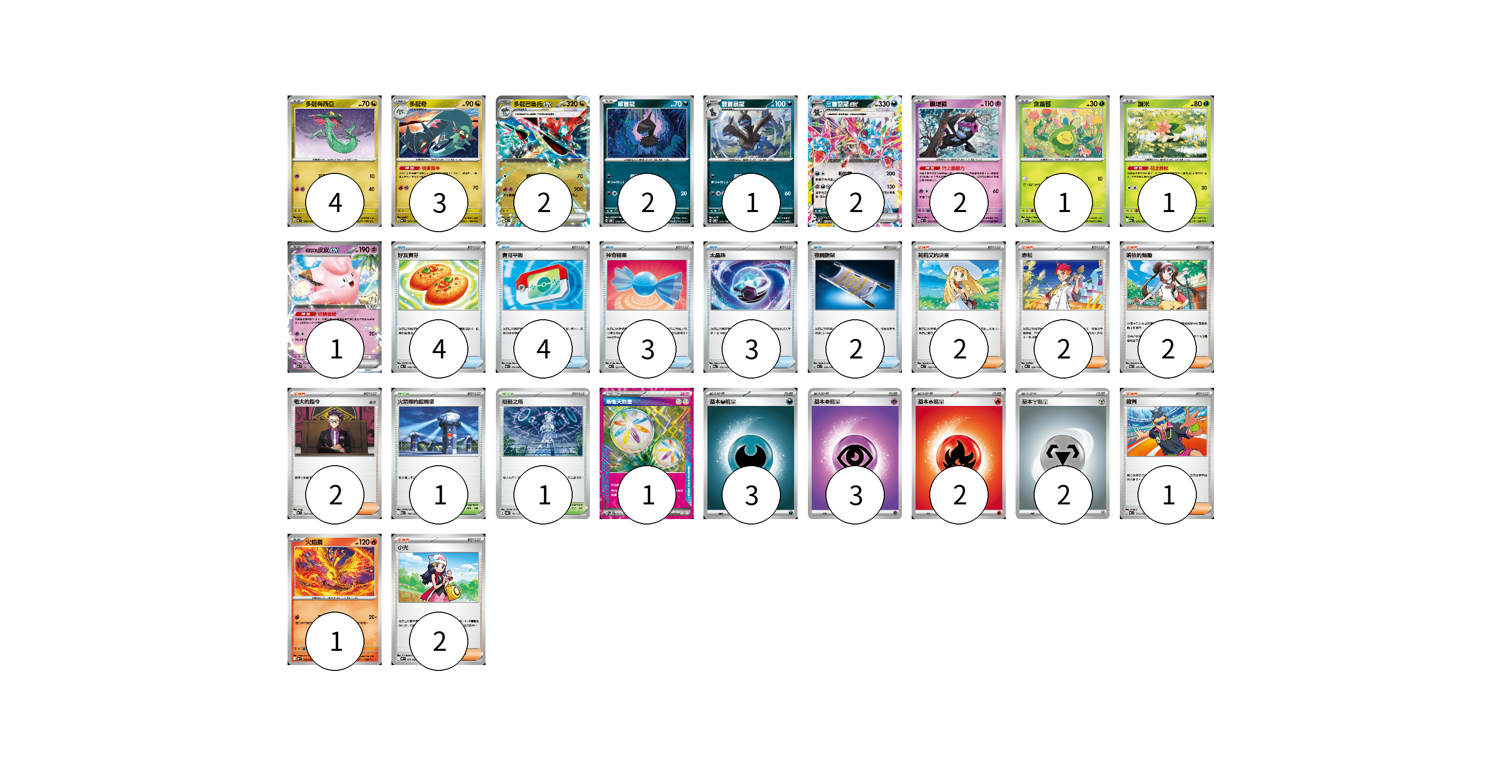 牌組構築方案 以此牌組為基礎新構築牌組 顯示卡面 顯示列表 寶可夢卡(20) 4 3 2 2 1 2 2 1 1 1 1 物品卡(16) 4 4 3 3 2 支援者卡(11) 2 2 2 2 1 2 競技場卡(2) 1 1 能量卡(11) 1 3 3 2 2 寶可夢卡(20) 卡牌名稱 張數 卡牌名稱 張數 多龍梅西亞 MC 546/742 04 多龍奇 MC 547/742 03 多龍巴魯托ex MC 548/742 02 單首龍 SV8 070/106 02 雙首暴龍 SV8 071/106 01 三首惡龍ex SV8 072/106 02 願增猿 MC 358/742 02 含羞苞 M2a 011/193 01 謝米 M2a 012/193 01 <莉莉艾的>皮皮ex MC 287/742 01 火焰鳥 M2 014/080 01 物品卡(16) 卡牌名稱 張數 卡牌名稱 張數 好友寶芬 MC 648/742 04 寶可平板 M3 070/080 04 神奇糖果 MC 655/742 03 太晶珠 M2a 152/193 03 夜間擔架 MC 670/742 02 支援者卡(11) 卡牌名稱 張數 卡牌名稱 張數 莉莉艾的決意 MC 729/742 02 赤松 MC 696/742 02 鳴依的勉勵 M3 075/080 02 老大的指令 MC 724/742 02 裁判 MC 711/742 01 小光 M2 077/080 02 競技場卡(2) 卡牌名稱 張數 卡牌名稱 張數 火箭隊的監視塔 M2a 189/193 01 阻礙之塔 SV8a 181/187 01 能量卡(11) 卡牌名稱 張數 卡牌名稱 張數 新衝天能量 SV5K 071/071 01 基本【惡】能量 MC DAR 03 基本【超】能量 M-P PSY 03 基本【火】能量 MC FIR 02 基本【鋼】能量 SVTH MET 02 以此牌組為基礎新構築牌組 牌組編碼 DyFTcQ-pUMsbo-ADktJl copy 列印牌組單 牌組編碼已複製 分享至SNS