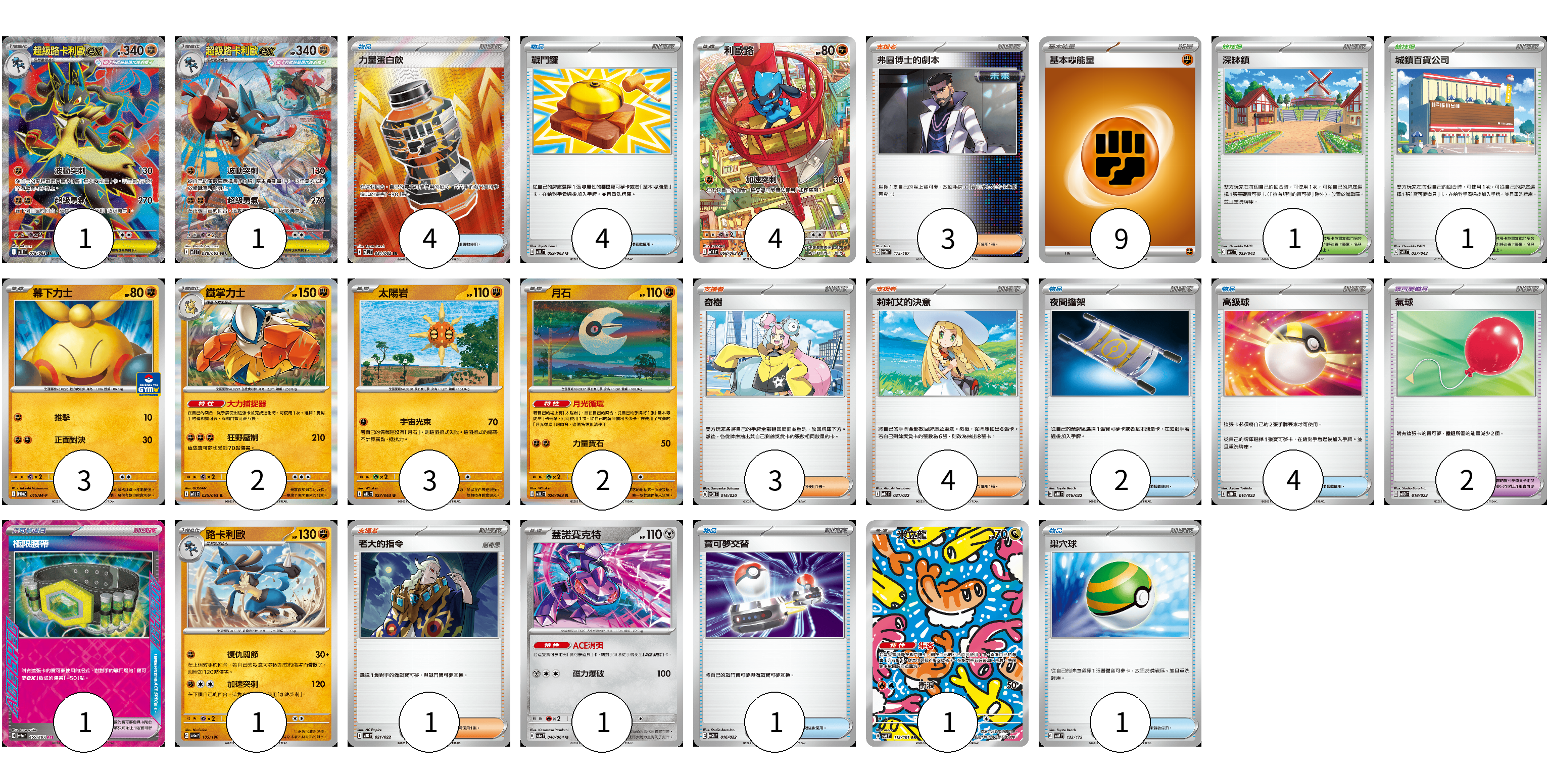 牌組構築方案 以此牌組為基礎新構築牌組 顯示卡面 顯示列表 寶可夢卡(19) 1 1 4 3 2 3 2 1 1 1 寶可夢道具(3) 2 1 物品卡(16) 4 4 2 4 1 1 支援者卡(11) 3 3 4 1 競技場卡(2) 1 1 能量卡(9) 9 寶可夢卡(19) 卡牌名稱 張數 卡牌名稱 張數 超級路卡利歐ex M1L 078/063 01 超級路卡利歐ex M1L 088/063 01 利歐路 M1L 068/063 04 幕下力士 M-P 015/M-P 03 鐵掌力士 M1L 025/063 02 太陽岩 M1L 027/063 03 月石 M1L 026/063 02 路卡利歐 SV4a 105/190 01 蓋諾賽克特 SV6a 040/064 01 米立龍 SV6 112/101 01 寶可夢道具(3) 卡牌名稱 張數 卡牌名稱 張數 氣球 MBD 018/022 02 極限腰帶 SV8a 159/187 01 物品卡(16) 卡牌名稱 張數 卡牌名稱 張數 力量蛋白飲 M1L 081/063 04 戰鬥鑼 M1L 059/063 04 夜間擔架 MBD 016/022 02 高級球 MBD 014/022 04 寶可夢交替 SVQL 016/022 01 巢穴球 SVM 133/175 01 支援者卡(11) 卡牌名稱 張數 卡牌名稱 張數 弗圖博士的劇本 SV8a 175/187 03 奇樹 SVOD 016/020 03 莉莉艾的決意 MBD 021/022 04 老大的指令 MBG 021/022 01 競技場卡(2) 卡牌名稱 張數 卡牌名稱 張數 深缽鎮 SVK 039/042 01 城鎮百貨公司 SVK 037/042 01 能量卡(9) 卡牌名稱 張數 卡牌名稱 張數 基本鬥能量 sv-p FIG 09 以此牌組為基礎新構築牌組 牌組編碼 EAWnlT-KKunWN-aQOrjn copy 列印牌組單 牌組編碼已複製 分享至SNS