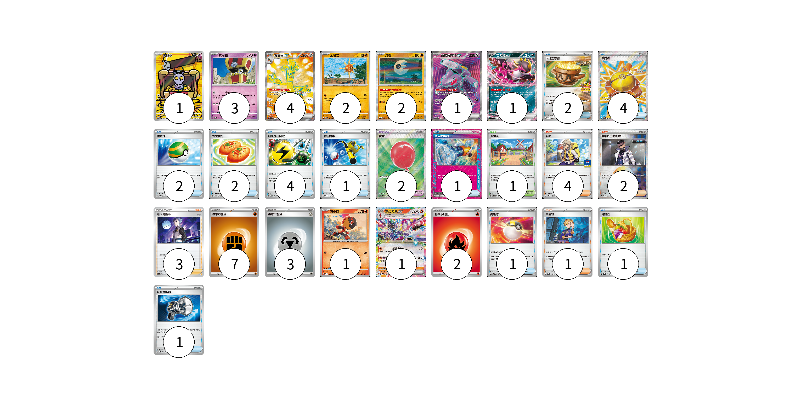 牌組構築方案 以此牌組為基礎新構築牌組 顯示卡面 顯示列表 寶可夢卡(16) 1 3 4 2 2 1 1 1 1 寶可夢道具(2) 2 物品卡(19) 2 4 2 2 4 1 1 1 1 1 支援者卡(10) 4 2 3 1 競技場卡(1) 1 能量卡(12) 7 3 2 寶可夢卡(16) 卡牌名稱 張數 卡牌名稱 張數 索財靈 SV3a 068/062 01 索財靈 SV7a 024/064 03 賽富豪ex SV3a 079/062 04 太陽岩 M1L 027/063 02 月石 M1L 026/063 02 蓋諾賽克特ex SV11B 164/086 01 吉雉雞ex SV6a 038/064 01 炭小侍 SVPS 005/008 01 蒼炎刃鬼ex SVPS 006/008 01 寶可夢道具(2) 卡牌名稱 張數 卡牌名稱 張數 氣球 M1L 084/063 02 物品卡(19) 卡牌名稱 張數 卡牌名稱 張數 大地之容器 SV-P 084/SV-P 02 戰鬥鑼 M1L 082/063 04 巢穴球 SVTG 012/019 02 好友寶芬 MBG 011/022 02 超級能量回收 SV8a 141/187 04 厲害釣竿 SVOM 011/021 01 頂尖捕捉器 SV5M 062/071 01 高級球 MBD 014/022 01 野餐籃 SV1V 071/078 01 反擊捕捉器 SV8a 139/187 01 支援者卡(10) 卡牌名稱 張數 卡牌名稱 張數 派帕 SV-P 213/SV-P 04 弗圖博士的劇本 SV8a 175/187 02 老大的指令(赤日) SK 025/030 03 白蕾雅 SV8a 176/187 01 競技場卡(1) 卡牌名稱 張數 卡牌名稱 張數 深缽鎮 SVK 039/042 01 能量卡(12) 卡牌名稱 張數 卡牌名稱 張數 基本【鬥】能量 SVD FIG 07 基本【鋼】能量 SVB MET 03 基本火能量 sv-p FIR 02 以此牌組為基礎新構築牌組 牌組編碼 ECnfFT-VbrJQV-noYvTL copy 列印牌組單 牌組編碼已複製 分享至SNS