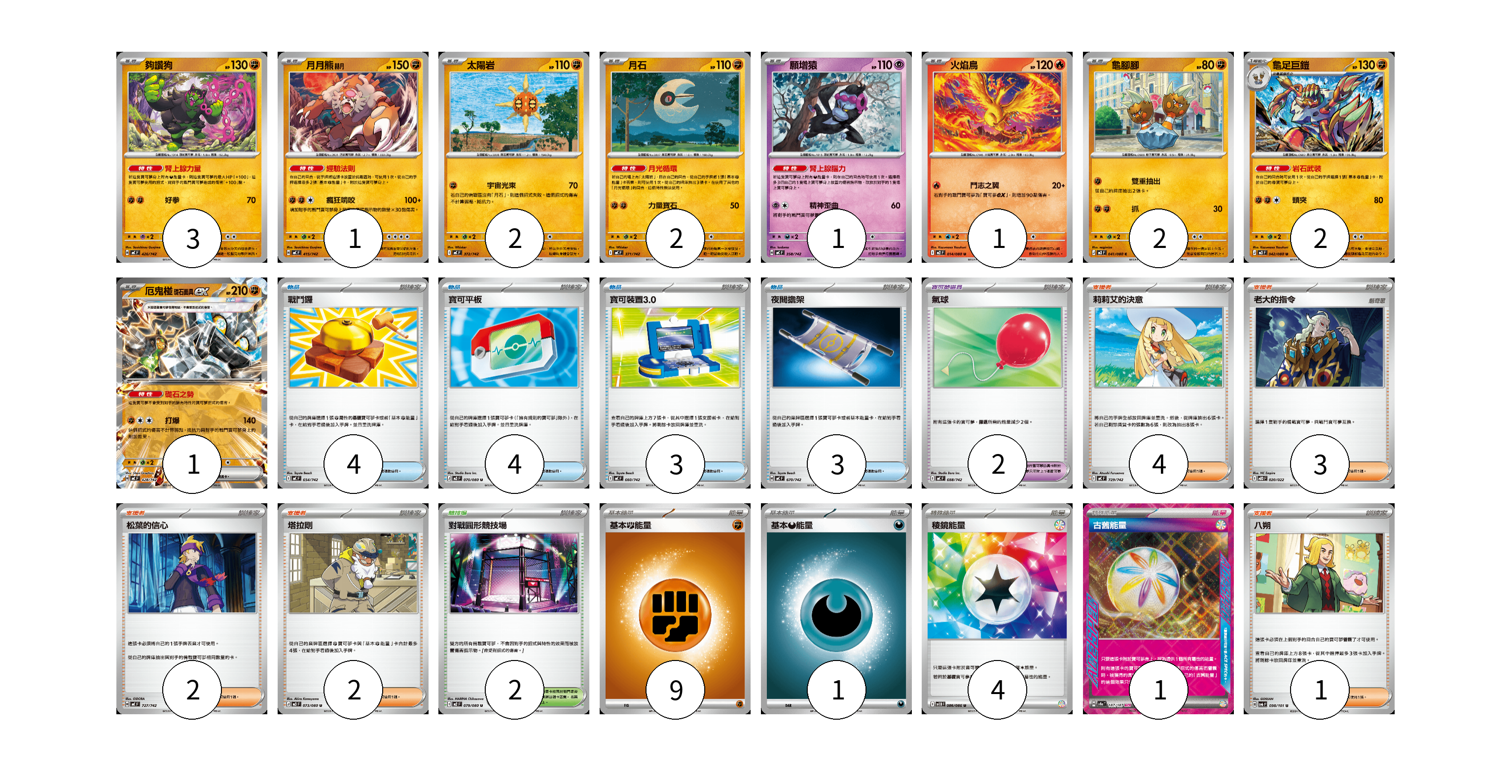 牌組構築方案 以此牌組為基礎新構築牌組 顯示卡面 顯示列表 寶可夢卡(15) 3 1 2 2 1 1 2 2 1 寶可夢道具(2) 2 物品卡(14) 4 4 3 3 支援者卡(12) 4 3 2 2 1 競技場卡(2) 2 能量卡(15) 9 1 4 1 寶可夢卡(15) 卡牌名稱 張數 卡牌名稱 張數 夠讚狗 MC 426/742 03 月月熊 赫月 MC 415/742 01 太陽岩 MC 372/742 02 月石 MC 371/742 02 願增猿 MC 358/742 01 火焰鳥 M2 014/080 01 龜腳腳 M3 041/080 02 龜足巨鎧 M3 042/080 02 厄鬼椪 礎石面具ex MC 428/742 01 寶可夢道具(2) 卡牌名稱 張數 卡牌名稱 張數 氣球 MC 688/742 02 物品卡(14) 卡牌名稱 張數 卡牌名稱 張數 戰鬥鑼 MC 654/742 04 寶可平板 M3 070/080 04 寶可裝置3.0 MC 660/742 03 夜間擔架 MC 670/742 03 支援者卡(12) 卡牌名稱 張數 卡牌名稱 張數 莉莉艾的決意 MC 729/742 04 老大的指令 MBD 020/022 03 松葉的信心 MC 727/742 02 塔拉剛 M3 073/080 02 八朔 SV6 098/101 01 競技場卡(2) 卡牌名稱 張數 卡牌名稱 張數 對戰圓形競技場 M2 079/080 02 能量卡(15) 卡牌名稱 張數 卡牌名稱 張數 基本【鬥】能量 MC FIG 09 基本【惡】能量 MC DAR 01 稜鏡能量 SV11B 086/086 04 古舊能量 SV8a 187/187 01 以此牌組為基礎新構築牌組 牌組編碼 EDMTpx-AVeerh-KwPCdN copy 列印牌組單 牌組編碼已複製 分享至SNS