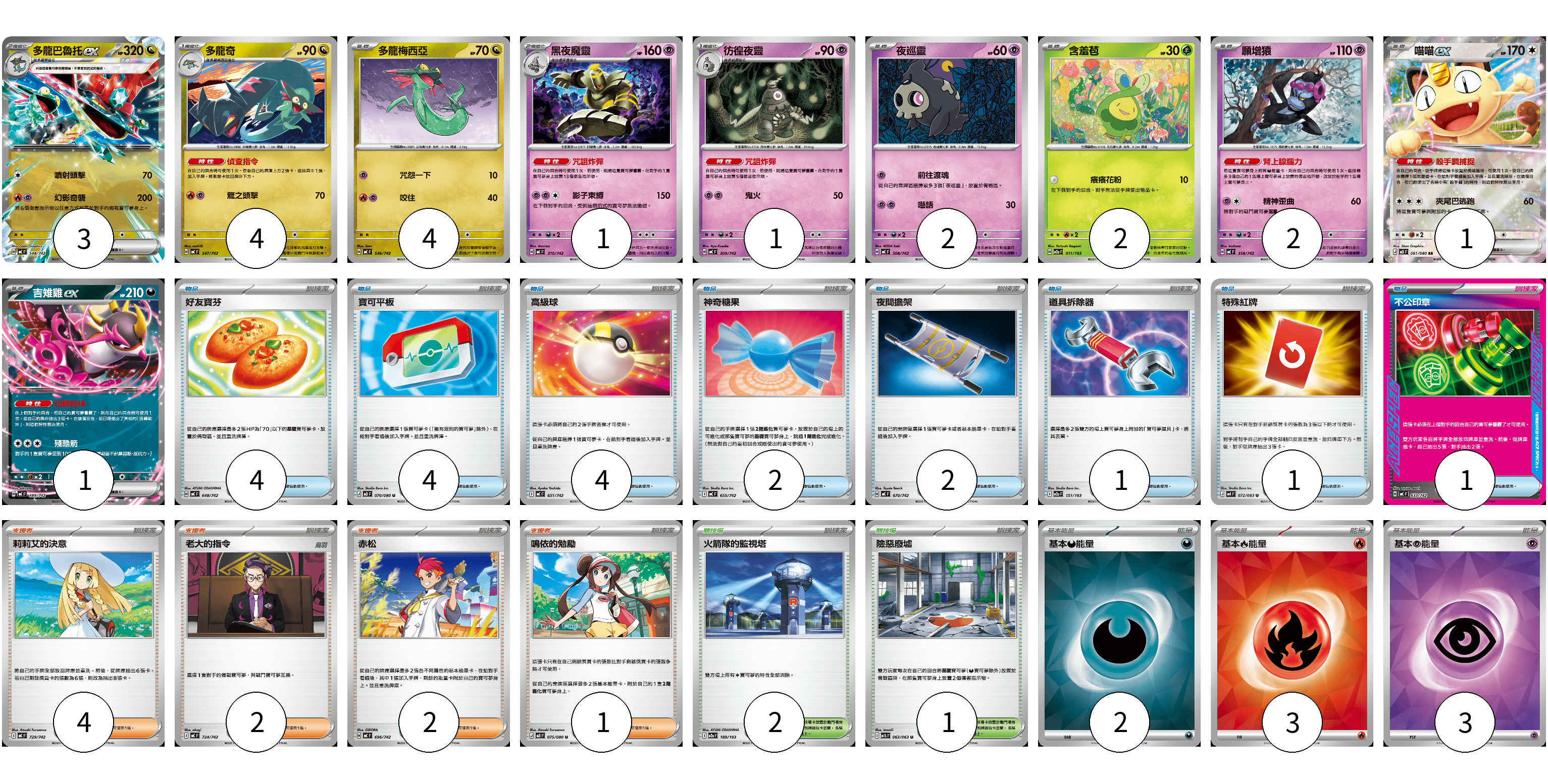 牌組構築方案 以此牌組為基礎新構築牌組 顯示卡面 顯示列表 寶可夢卡(21) 3 4 4 1 1 2 2 2 1 1 物品卡(19) 4 4 4 2 2 1 1 1 支援者卡(9) 4 2 2 1 競技場卡(3) 2 1 能量卡(8) 2 3 3 寶可夢卡(21) 卡牌名稱 張數 卡牌名稱 張數 多龍巴魯托ex MC 548/742 03 多龍奇 MC 547/742 04 多龍梅西亞 MC 546/742 04 黑夜魔靈 MC 310/742 01 彷徨夜靈 MC 309/742 01 夜巡靈 MC 308/742 02 含羞苞 M2a 011/193 02 願增猿 MC 358/742 02 喵喵ex M3 061/080 01 吉雉雞ex MC 489/742 01 物品卡(19) 卡牌名稱 張數 卡牌名稱 張數 好友寶芬 MC 648/742 04 寶可平板 M3 070/080 04 高級球 MC 651/742 04 神奇糖果 MC 655/742 02 夜間擔架 MC 670/742 02 道具拆除器 M2a 151/193 01 特殊紅牌 M4 072/083 01 不公印章 MC 633/742 01 支援者卡(9) 卡牌名稱 張數 卡牌名稱 張數 莉莉艾的決意 MC 729/742 04 老大的指令 MC 724/742 02 赤松 MC 696/742 02 鳴依的勉勵 M3 075/080 01 競技場卡(3) 卡牌名稱 張數 卡牌名稱 張數 火箭隊的監視塔 M2a 189/193 02 險惡廢墟 M1L 063/063 01 能量卡(8) 卡牌名稱 張數 卡牌名稱 張數 基本【惡】能量 SVOM DAR 02 基本【火】能量 SVQL FIR 03 基本【超】能量 SVOD PSY 03 以此牌組為基礎新構築牌組 牌組編碼 EHvQLz-ArIgYT-IJdIJv copy 列印牌組單 牌組編碼已複製 分享至SNS