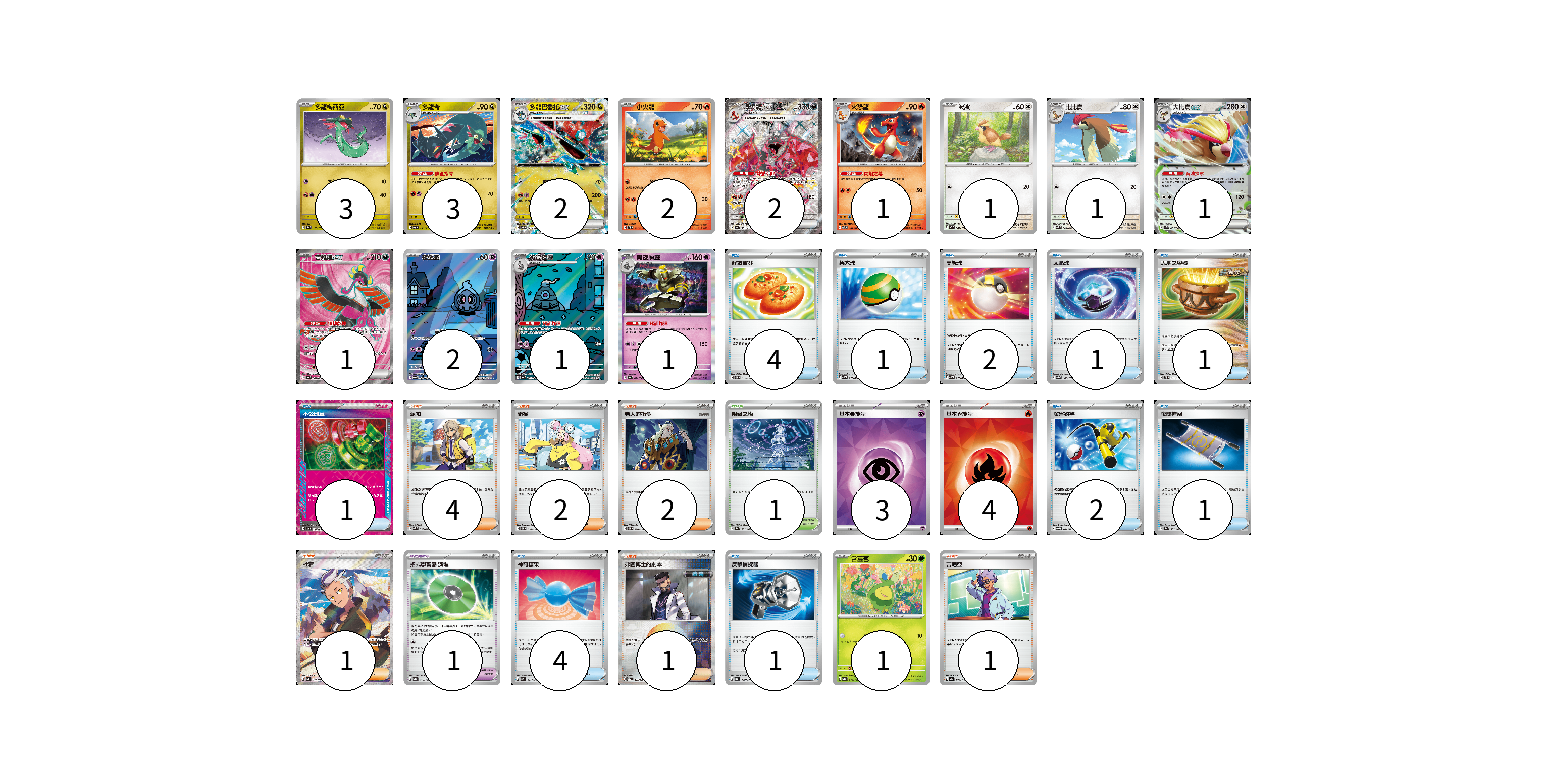 牌組構築方案 以此牌組為基礎新構築牌組 顯示卡面 顯示列表 寶可夢卡(22) 3 3 2 2 2 1 1 1 1 1 2 1 1 1 寶可夢道具(1) 1 物品卡(18) 4 1 2 1 1 1 2 1 4 1 支援者卡(11) 4 2 2 1 1 1 競技場卡(1) 1 能量卡(7) 3 4 寶可夢卡(22) 卡牌名稱 張數 卡牌名稱 張數 多龍梅西亞 SV8a 118/187 03 多龍奇 SV6 080/101 03 多龍巴魯托ex SV6 081/101 02 小火龍 SVTL 001/021 02 噴火龍ex SV4a 331/190 02 火恐龍 SVTL 002/021 01 波波 SV3 087/108 01 比比鳥 SVK 004/042 01 大比鳥ex SVK 005/042 01 吉雉雞ex SV6a 081/064 01 夜巡靈 SV6a 068/064 02 彷徨夜靈 SV6a 069/064 01 黑夜魔靈 SV6a 020/064 01 含羞苞 SV8a 001/187 01 寶可夢道具(1) 卡牌名稱 張數 卡牌名稱 張數 招式學習器 演進 SV8a 160/187 01 物品卡(18) 卡牌名稱 張數 卡牌名稱 張數 好友寶芬 SVOM 012/021 04 巢穴球 SVHM 012/022 01 高級球 SVHM 013/022 02 太晶珠 SV8a 145/187 01 大地之容器 SVTS 011/022 01 不公印章 SV5a 053/066 01 厲害釣竿 SVOM 011/021 02 夜間擔架 SV8a 151/187 01 神奇糖果 SVM 135/175 04 反擊捕捉器 SV8a 139/187 01 支援者卡(11) 卡牌名稱 張數 卡牌名稱 張數 派帕 SVK 035/042 04 奇樹 SVOM 018/021 02 老大的指令 SVOM 020/021 02 杜若 SV7a 083/064 01 弗圖博士的劇本 SV8a 175/187 01 吉尼亞 SV1S 074/078 01 競技場卡(1) 卡牌名稱 張數 卡牌名稱 張數 阻礙之塔 SV8a 181/187 01 能量卡(7) 卡牌名稱 張數 卡牌名稱 張數 基本【超】能量 SVOD PSY 03 基本【火】能量 SVK FIR 04 以此牌組為基礎新構築牌組 牌組編碼 EIaMiQ-SGkKWx-UobGDn copy 列印牌組單 牌組編碼已複製 分享至SNS