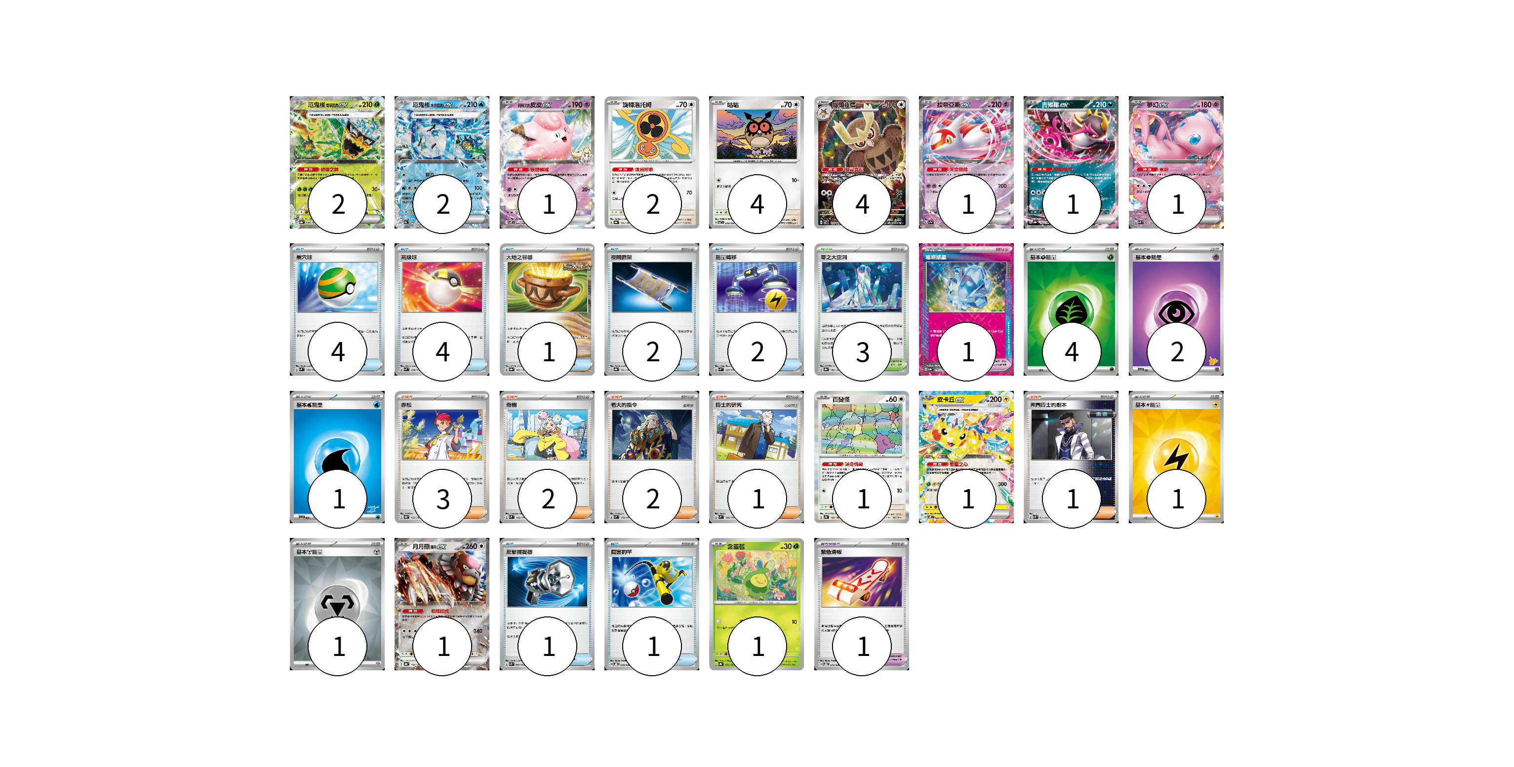 牌組構築方案 以此牌組為基礎新構築牌組 顯示卡面 顯示列表 寶可夢卡(22) 2 2 1 2 4 4 1 1 1 1 1 1 1 寶可夢道具(2) 1 1 物品卡(15) 4 4 1 2 2 1 1 支援者卡(9) 3 2 2 1 1 競技場卡(3) 3 能量卡(9) 4 2 1 1 1 寶可夢卡(22) 卡牌名稱 張數 卡牌名稱 張數 厄鬼椪 碧草面具ex SV8a 020/187 02 厄鬼椪 水井面具ex SV8a 050/187 02 莉莉艾的皮皮ex SV9 033/100 01 旋轉洛托姆 SV8a 131/187 02 咕咕 SV7 076/102 04 貓頭夜鷹 SV7 114/102 04 拉帝亞斯ex SV7a 019/064 01 吉雉雞ex SV8a 104/187 01 夢幻ex SVK 001/042 01 百變怪 SV2a 132/165 01 皮卡丘ex SV8 033/106 01 月月熊 赫月ex SV8a 134/187 01 含羞苞 SV8a 001/187 01 寶可夢道具(2) 卡牌名稱 張數 卡牌名稱 張數 璀璨結晶 SV8a 152/187 01 緊急滑板 SVOD 015/020 01 物品卡(15) 卡牌名稱 張數 卡牌名稱 張數 巢穴球 SVM 133/175 04 高級球 SVM 134/175 04 大地之容器 SV8a 143/187 01 夜間擔架 SV8a 151/187 02 能量轉移 SVM 127/175 02 反擊捕捉器 SVK 009/042 01 厲害釣竿 SVOD 010/020 01 支援者卡(9) 卡牌名稱 張數 卡牌名稱 張數 赤松 SV8a 163/187 03 奇樹 SVM 160/175 02 老大的指令 SVM 172/175 02 博士的研究 SVM 165/175 01 弗圖博士的劇本 SVK 034/042 01 競技場卡(3) 卡牌名稱 張數 卡牌名稱 張數 零之大空洞 SV8a 182/187 03 能量卡(9) 卡牌名稱 張數 卡牌名稱 張數 基本【草】能量 SVK GRA 04 基本【超】能量 SVI PSY 02 基本【水】能量 SVI WAT 01 基本【雷】能量 SVK LIG 01 基本【鋼】能量 SVK MET 01 以此牌組為基礎新構築牌組 牌組編碼 EIeqnn-sYkmqS-vLVYLI copy 列印牌組單 牌組編碼已複製 分享至SNS