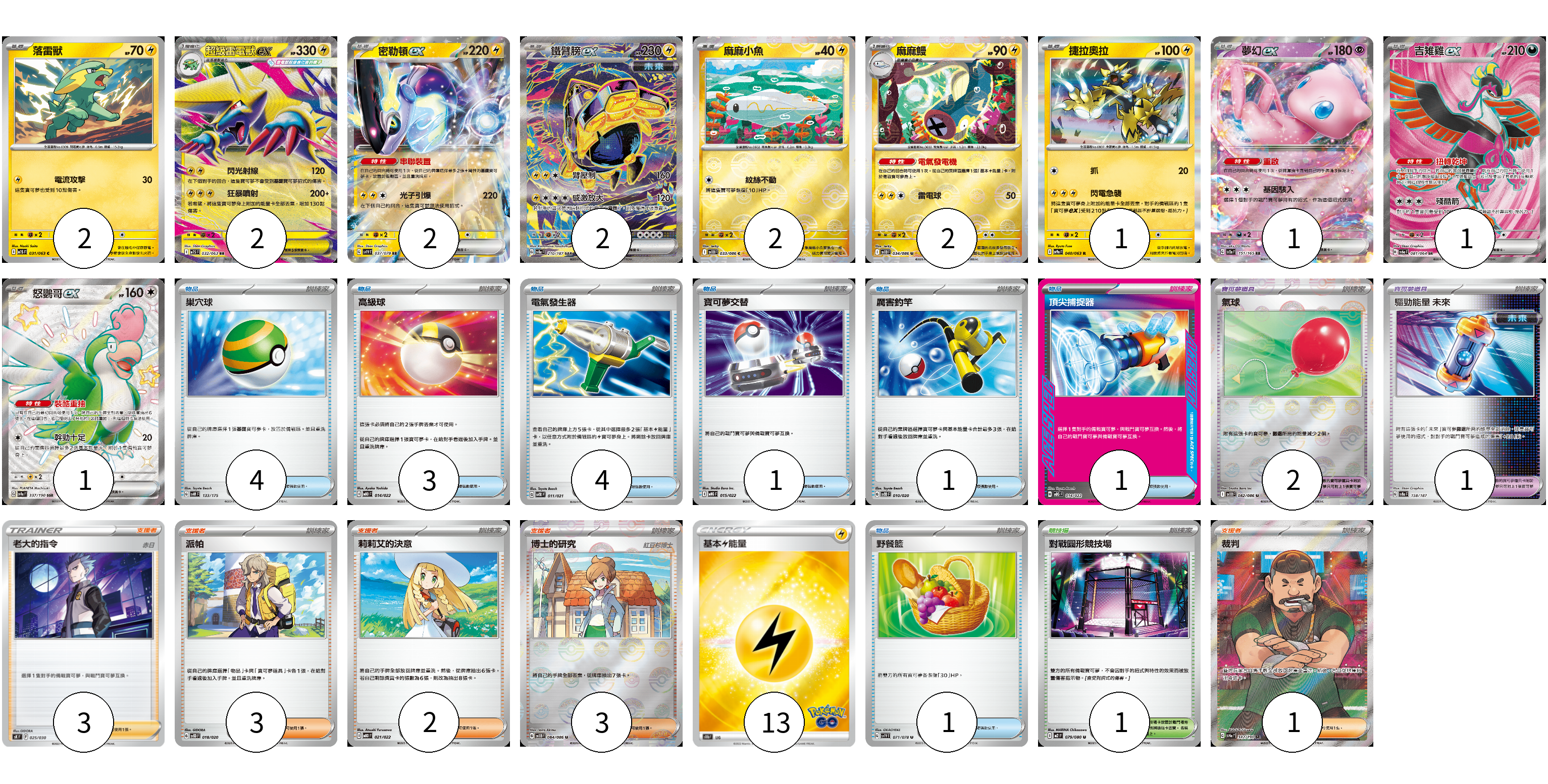 牌組構築方案 以此牌組為基礎新構築牌組 顯示卡面 顯示列表 寶可夢卡(16) 2 2 2 2 2 2 1 1 1 1 寶可夢道具(3) 2 1 物品卡(15) 4 3 4 1 1 1 1 支援者卡(12) 3 3 2 3 1 競技場卡(1) 1 能量卡(13) 13 寶可夢卡(16) 卡牌名稱 張數 卡牌名稱 張數 落雷獸 M1S 031/063 02 超級雷電獸ex M1S 032/063 02 密勒頓ex SV1V 037/078 02 鐵臂膀ex SV8a 210/187 02 麻麻小魚 SV11B 033/086 02 麻麻鰻 SV11B 034/086 02 捷拉奧拉 SV9a 040/063 01 夢幻ex SV2a 151/165 01 吉雉雞ex SV6a 081/064 01 怒鸚哥ex SV4a 337/190 01 寶可夢道具(3) 卡牌名稱 張數 卡牌名稱 張數 氣球 SV11B 082/086 02 驅勁能量 未來 SV8a 158/187 01 物品卡(15) 卡牌名稱 張數 卡牌名稱 張數 巢穴球 SVM 133/175 04 高級球 MBD 014/022 03 電氣發生器 SVTR 011/021 04 寶可夢交替 MBG 015/022 01 厲害釣竿 SVOD 010/020 01 頂尖捕捉器 MBG 014/022 01 野餐籃 SV1V 071/078 01 支援者卡(12) 卡牌名稱 張數 卡牌名稱 張數 老大的指令(赤日) SK 025/030 03 派帕 SVOD 018/020 03 莉莉艾的決意 MBD 021/022 02 博士的研究 SV11B 084/086 03 裁判 SV4a 342/190 01 競技場卡(1) 卡牌名稱 張數 卡牌名稱 張數 對戰圓形競技場 M2 079/080 01 能量卡(13) 卡牌名稱 張數 卡牌名稱 張數 基本雷能量 S10b LIG 13 以此牌組為基礎新構築牌組 牌組編碼 EKaeXK-Yoiroa-jsjtVy copy 列印牌組單 牌組編碼已複製 分享至SNS