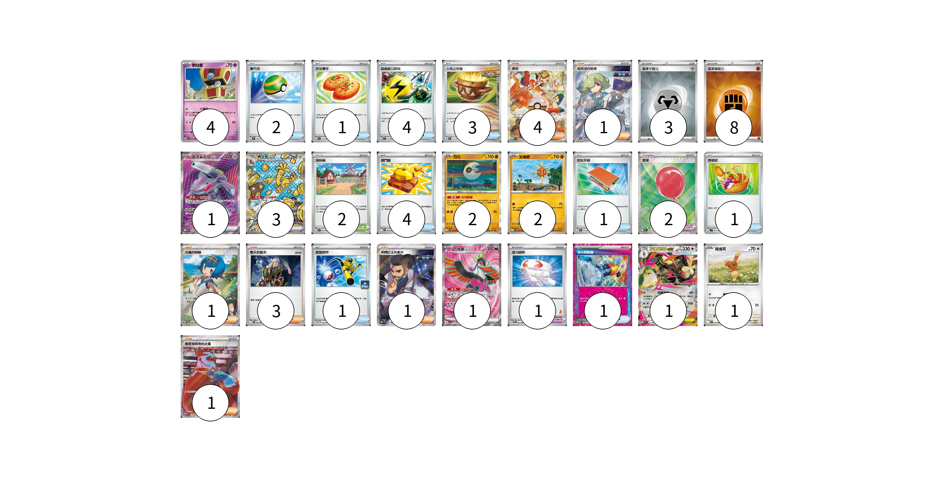 牌組構築方案 以此牌組為基礎新構築牌組 顯示卡面 顯示列表 寶可夢卡(15) 4 1 3 2 2 1 1 1 寶可夢道具(3) 2 1 物品卡(18) 2 1 4 3 4 1 1 1 1 支援者卡(11) 4 1 1 3 1 1 競技場卡(2) 2 能量卡(11) 3 8 寶可夢卡(15) 卡牌名稱 張數 卡牌名稱 張數 索財靈 SV7a 024/064 04 蓋諾賽克特ex SV11B 164/086 01 賽富豪ex SV8a 220/187 03 月石 M1L 026/063 02 太陽岩 M1L 027/063 02 吉雉雞ex SV6a 081/064 01 超級長耳兔ex M2 072/080 01 捲捲耳 M2 071/080 01 寶可夢道具(3) 卡牌名稱 張數 卡牌名稱 張數 氣球 M1L 084/063 02 活力頭帶 SVI 057/066 01 物品卡(18) 卡牌名稱 張數 卡牌名稱 張數 巢穴球 SVM 133/175 02 好友寶芬 SVK 015/042 01 超級能量回收 SVK 010/042 04 大地之容器 SVK 012/042 03 戰鬥鑼 M1L 059/063 04 朋友手冊 SVK 014/042 01 野餐籃 SV1V 071/078 01 厲害釣竿 SV-P 112/SV-P 01 頂尖捕捉器 SV8a 148/187 01 支援者卡(11) 卡牌名稱 張數 卡牌名稱 張數 派帕 SV4a 353/190 04 暗碼迷的解讀 SV5M 090/071 01 水蓮的照顧 SV5a 088/066 01 老大的指令 MBD 020/022 03 弗圖博士的劇本 SV4M 086/066 01 庫瑟洛斯奇的企圖 SV6a 086/064 01 競技場卡(2) 卡牌名稱 張數 卡牌名稱 張數 深缽鎮 SVK 039/042 02 能量卡(11) 卡牌名稱 張數 卡牌名稱 張數 基本【鋼】能量 SVK MET 03 基本【鬥】能量 SVK FIG 08 以此牌組為基礎新構築牌組 牌組編碼 ELeqUT-lupyjh-otbFxQ copy 列印牌組單 牌組編碼已複製 分享至SNS