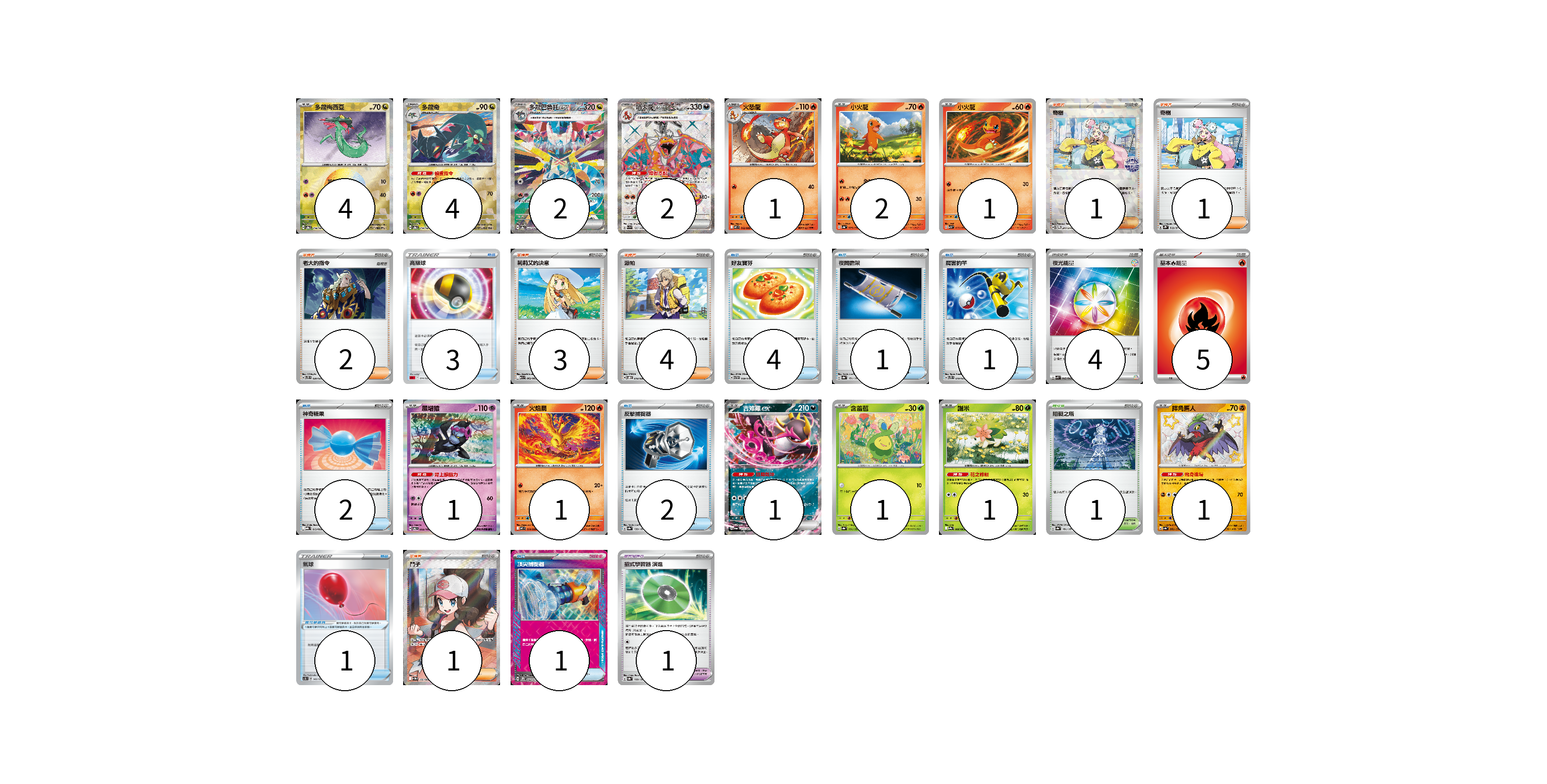 牌組構築方案 以此牌組為基礎新構築牌組 顯示卡面 顯示列表 寶可夢卡(22) 4 4 2 2 1 2 1 1 1 1 1 1 1 寶可夢道具(2) 1 1 物品卡(14) 3 4 1 1 2 2 1 支援者卡(12) 1 1 2 3 4 1 競技場卡(1) 1 能量卡(9) 4 5 寶可夢卡(22) 卡牌名稱 張數 卡牌名稱 張數 多龍梅西亞 SV8a 118/187 04 多龍奇 SV8a 119/187 04 多龍巴魯托ex SV8a 221/187 02 噴火龍ex SV3 125/108 02 火恐龍 M2 012/080 01 小火龍 SV4a 025/190 02 小火龍 SV3 012/108 01 願增猿 SV6 055/101 01 火焰鳥 M2 014/080 01 吉雉雞ex SV6a 038/064 01 含羞苞 SV8a 001/187 01 謝米 SV9a 006/063 01 摔角鷹人 SV4a 282/190 01 寶可夢道具(2) 卡牌名稱 張數 卡牌名稱 張數 氣球 SC1b 142/153 01 招式學習器 演進 SV8a 160/187 01 物品卡(14) 卡牌名稱 張數 卡牌名稱 張數 高級球 SDL 014/021 03 好友寶芬 SVTH 009/018 04 夜間擔架 SV8a 151/187 01 厲害釣竿 SVTS 010/022 01 神奇糖果 MBG 013/022 02 反擊捕捉器 SV8a 139/187 02 頂尖捕捉器 SV5M 062/071 01 支援者卡(12) 卡牌名稱 張數 卡牌名稱 張數 奇樹 SV-P 247/SV-P 01 奇樹 SV2D 069/071 01 老大的指令 SVTS 020/022 02 莉莉艾的決意 M1L 062/063 03 派帕 SVOD 018/020 04 鬥子 SV11W 166/086 01 競技場卡(1) 卡牌名稱 張數 卡牌名稱 張數 阻礙之塔 SV8a 181/187 01 能量卡(9) 卡牌名稱 張數 卡牌名稱 張數 夜光能量 SVK 042/042 04 基本火能量 sv-p FIR 05 以此牌組為基礎新構築牌組 牌組編碼 EPMJUe-tJYcvl-gvCYti copy 列印牌組單 牌組編碼已複製 分享至SNS