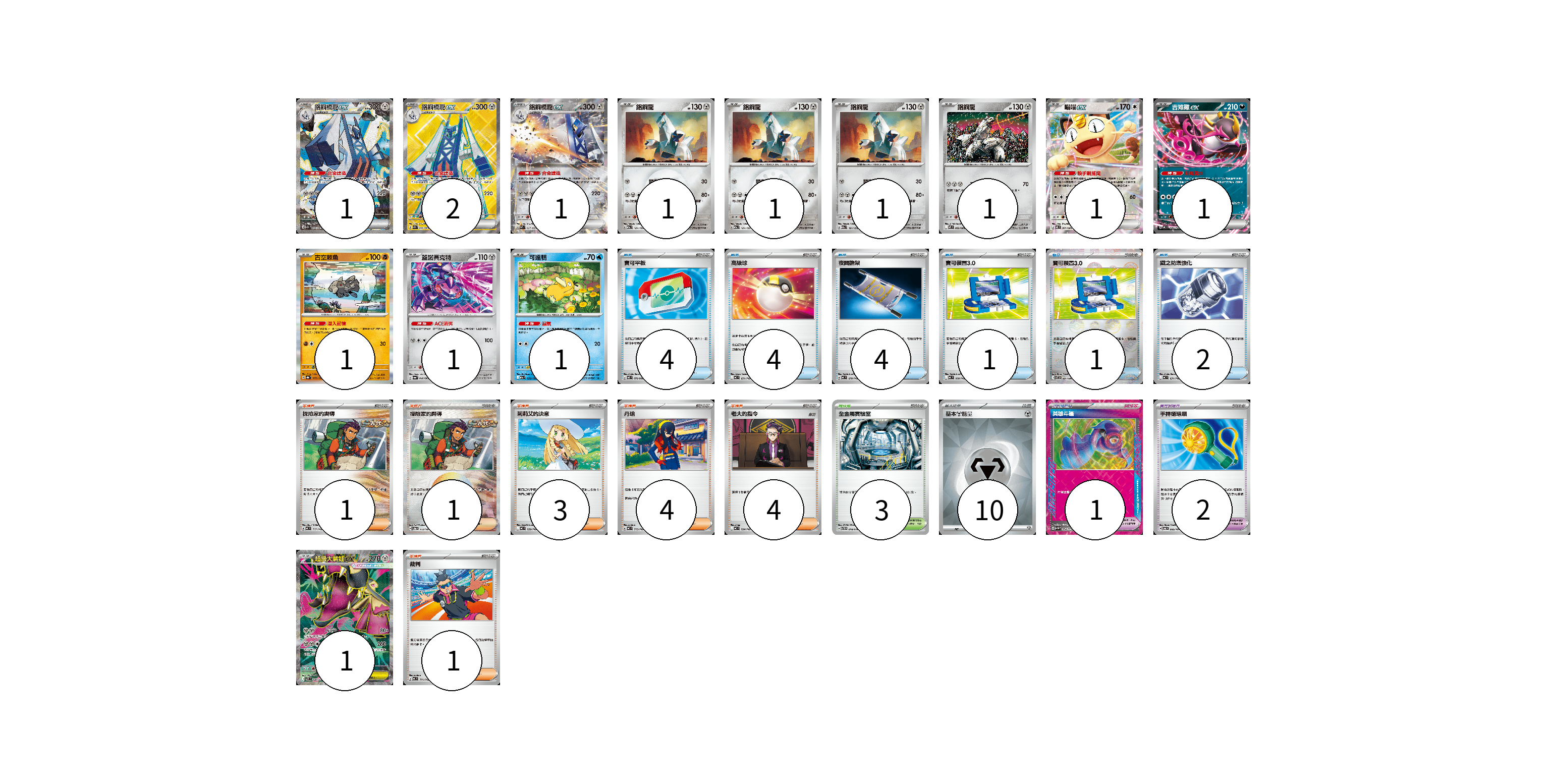牌組構築方案 以此牌組為基礎新構築牌組 顯示卡面 顯示列表 寶可夢卡(14) 1 2 1 1 1 1 1 1 1 1 1 1 1 寶可夢道具(3) 1 2 物品卡(16) 4 4 4 1 1 2 支援者卡(13) 1 3 4 4 1 競技場卡(3) 3 能量卡(10) 10 寶可夢卡(14) 卡牌名稱 張數 卡牌名稱 張數 鋁鋼橋龍ex SV7a 088/064 01 鋁鋼橋龍ex SV7a 080/064 02 鋁鋼橋龍ex SV7a 037/064 01 鋁鋼龍 M2a 121/193 01 鋁鋼龍 M2a 121/193 01 鋁鋼龍 M2a 121/193 01 鋁鋼龍 M2 062/080 01 喵喵ex M3 061/080 01 吉雉雞ex MC 489/742 01 古空棘魚 SV8a 079/187 01 蓋諾賽克特 SV6a 040/064 01 可達鴨 M2a 032/193 01 超級大嘴娃ex M1L 080/063 01 寶可夢道具(3) 卡牌名稱 張數 卡牌名稱 張數 英雄斗篷 SV5M 064/071 01 手持循環扇 SV6 095/101 02 物品卡(16) 卡牌名稱 張數 卡牌名稱 張數 寶可平板 M3 070/080 04 高級球 MC 651/742 04 夜間擔架 MC 670/742 04 寶可裝置3.0 MC 660/742 01 寶可裝置3.0 SV11B 081/086 01 鐵之防禦強化 MC 631/742 02 支援者卡(13) 卡牌名稱 張數 卡牌名稱 張數 探險家的嚮導 MC 717/742 01 莉莉艾的決意 MC 729/742 03 丹瑜 MC 715/742 04 老大的指令 MC 724/742 04 裁判 MC 711/742 01 競技場卡(3) 卡牌名稱 張數 卡牌名稱 張數 全金屬實驗室 SVTH 018/018 03 能量卡(10) 卡牌名稱 張數 卡牌名稱 張數 基本【鋼】能量 SVOD MET 10 以此牌組為基礎新構築牌組 牌組編碼 EQFpVk-jDQMQF-PhcNfR copy 列印牌組單 牌組編碼已複製 分享至SNS