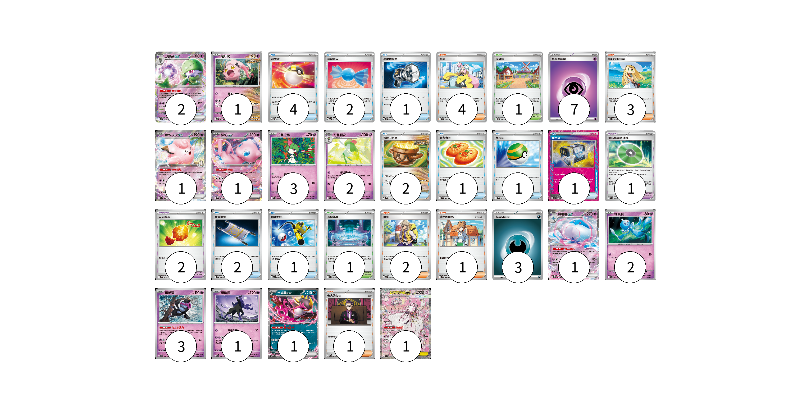 牌組構築方案 以此牌組為基礎新構築牌組 顯示卡面 顯示列表 寶可夢卡(19) 2 1 1 1 3 2 1 2 3 1 1 1 寶可夢道具(3) 1 2 物品卡(15) 4 2 1 2 1 1 1 2 1 支援者卡(11) 4 3 2 1 1 競技場卡(2) 1 1 能量卡(10) 7 3 寶可夢卡(19) 卡牌名稱 張數 卡牌名稱 張數 沙奈朵ex SV1S 028/078 02 吼叫尾 SV4K 032/066 01 莉莉艾的皮皮ex M2a 060/193 01 夢幻ex SVK 001/042 01 拉魯拉絲 M2a 069/193 03 奇魯莉安 M2a 070/193 02 胖嘟嘟ex SV11W 042/086 01 輕飄飄 SV11W 041/086 02 願增猿 MC 358/742 03 靈幽馬 M2a 080/193 01 吉雉雞ex MC 489/742 01 超級蒂安希ex M2a 238/193 01 寶可夢道具(3) 卡牌名稱 張數 卡牌名稱 張數 招式學習器 演進 SV8a 160/187 01 勇氣護符 SVM 142/175 02 物品卡(15) 卡牌名稱 張數 卡牌名稱 張數 高級球 SVEL 012/020 04 神奇糖果 SV3a 053/062 02 反擊捕捉器 SV4M 059/066 01 大地之容器 SVHK 011/022 02 好友寶芬 MC 648/742 01 巢穴球 SVM 133/175 01 秘密箱 SV6 092/101 01 夜間擔架 MC 670/742 02 厲害釣竿 SVOD 010/020 01 支援者卡(11) 卡牌名稱 張數 卡牌名稱 張數 奇樹 SVEL 016/020 04 莉莉艾的決意 M2a 175/193 03 派帕 SVOD 018/020 02 博士的研究 SV11B 084/086 01 老大的指令 MC 724/742 01 競技場卡(2) 卡牌名稱 張數 卡牌名稱 張數 深缽鎮 SVF 036/038 01 神秘花園 M2a 187/193 01 能量卡(10) 卡牌名稱 張數 卡牌名稱 張數 基本【超】能量 SVEM PSY 07 基本惡能量 sv-p DAR 03 以此牌組為基礎新構築牌組 牌組編碼 EQjRbC-dBUiQd-GVRHMr copy 列印牌組單 牌組編碼已複製 分享至SNS