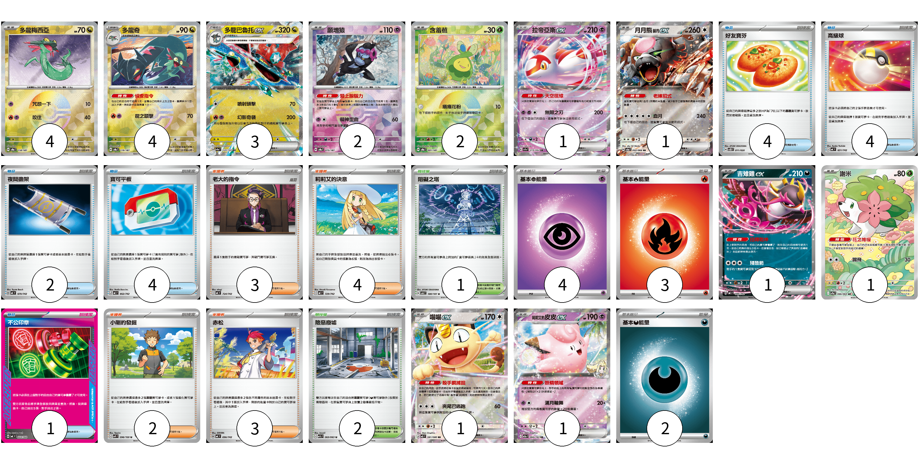 牌組構築方案 以此牌組為基礎新構築牌組 顯示卡面 顯示列表 寶可夢卡(21) 4 4 3 2 2 1 1 1 1 1 1 物品卡(15) 4 4 2 4 1 支援者卡(12) 3 4 2 3 競技場卡(3) 1 2 能量卡(9) 4 3 2 寶可夢卡(21) 卡牌名稱 張數 卡牌名稱 張數 多龍梅西亞 SV8a 118/187 04 多龍奇 SV8a 119/187 04 多龍巴魯托ex SV8a 120/187 03 願增猿 SV8a 075/187 02 含羞苞 SV8a 001/187 02 拉帝亞斯ex SV7a 019/064 01 月月熊 赫月 ex SV5a 052/066 01 吉雉雞ex MC 489/742 01 謝米 SV9a 066/063 01 喵喵ex M3 061/080 01 莉莉艾的皮皮ex M2a 060/193 01 物品卡(15) 卡牌名稱 張數 卡牌名稱 張數 好友寶芬 SVOD 011/020 04 高級球 MC 651/742 04 夜間擔架 MC 670/742 02 寶可平板 MC 662/742 04 不公印章 MC 633/742 01 支援者卡(12) 卡牌名稱 張數 卡牌名稱 張數 老大的指令 MC 724/742 03 莉莉艾的決意 MC 729/742 04 小剛的發掘 SV9 096/100 02 赤松 MC 696/742 03 競技場卡(3) 卡牌名稱 張數 卡牌名稱 張數 阻礙之塔 SV6 100/101 01 險惡廢墟 M1L 063/063 02 能量卡(9) 卡牌名稱 張數 卡牌名稱 張數 基本【超】能量 MC PSY 04 基本【火】能量 MC FIR 03 基本【惡】能量 MC DAR 02 以此牌組為基礎新構築牌組 牌組編碼 ERDsTB-DbrNvQ-dWzmUz copy 列印牌組單 牌組編碼已複製 分享至SNS