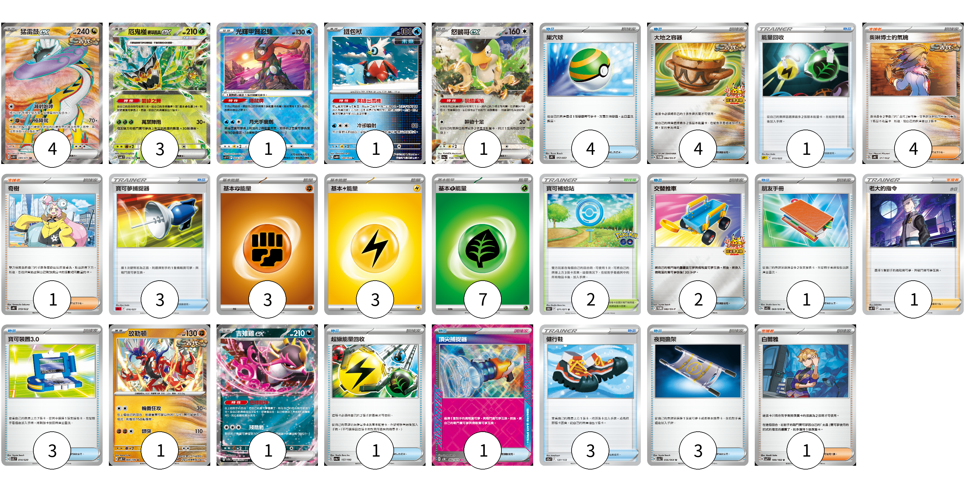 牌組構築方案 以此牌組為基礎新構築牌組 顯示卡面 顯示列表 寶可夢卡(12) 4 3 1 1 1 1 1 物品卡(26) 4 4 1 3 2 1 3 1 1 3 3 支援者卡(7) 4 1 1 1 競技場卡(2) 2 能量卡(13) 3 3 7 寶可夢卡(12) 卡牌名稱 張數 卡牌名稱 張數 猛雷鼓ex SV5K 089/071 04 厄鬼椪 碧草面具ex SV6 016/101 03 光輝甲賀忍蛙 SVF 004/038 01 鐵包袱 SV4M 020/066 01 怒鸚哥ex SV4a 154/190 01 故勒頓 SV8 069/106 01 吉雉雞ex SV6a 038/064 01 物品卡(26) 卡牌名稱 張數 卡牌名稱 張數 巢穴球 SVHK 012/022 04 大地之容器 SV-P 084/SV-P 04 能量回收 SDP 013/022 01 寶可夢捕捉器 SDL 016/021 03 交替推車 SV-P 082/SV-P 02 朋友手冊 SV1S 069/078 01 寶可裝置3.0 SVEL 014/020 03 超級能量回收 SV4a 157/190 01 頂尖捕捉器 SV5M 062/071 01 健行鞋 S12a 137/172 03 夜間擔架 SV6a 056/064 03 支援者卡(7) 卡牌名稱 張數 卡牌名稱 張數 奧琳博士的氣魄 SVHK 017/022 04 奇樹 SVHK 019/022 01 老大的指令(赤日) SVB 024/028 01 白蕾雅 SV7 100/102 01 競技場卡(2) 卡牌名稱 張數 卡牌名稱 張數 寶可補給站 S10b 071/071 02 能量卡(13) 卡牌名稱 張數 卡牌名稱 張數 基本【鬥】能量 SVHK FIG 03 基本【雷】能量 SVHM LIG 03 基本【草】能量 SVF GRA 07 以此牌組為基礎新構築牌組 牌組編碼 EVdcTQ-QWnUII-zLYEZE copy 列印牌組單 牌組編碼已複製 分享至SNS
