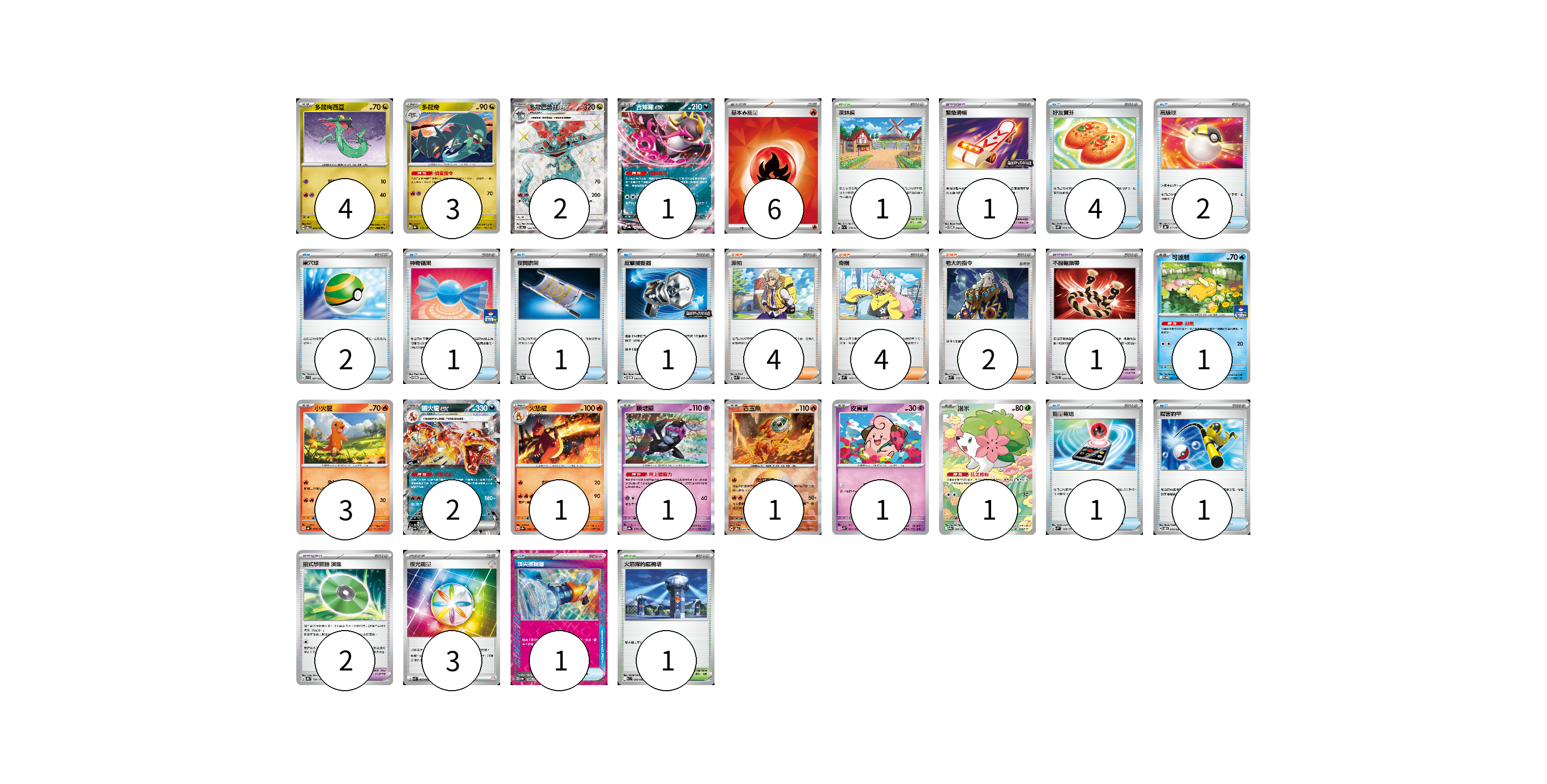 牌組構築方案 以此牌組為基礎新構築牌組 顯示卡面 顯示列表 寶可夢卡(21) 4 3 2 1 1 3 2 1 1 1 1 1 寶可夢道具(4) 1 1 2 物品卡(14) 4 2 2 1 1 1 1 1 1 支援者卡(10) 4 4 2 競技場卡(2) 1 1 能量卡(9) 6 3 寶可夢卡(21) 卡牌名稱 張數 卡牌名稱 張數 多龍梅西亞 SV6 079/101 04 多龍奇 SV8a 119/187 03 多龍巴魯托ex SV6 120/101 02 吉雉雞ex SV8a 104/187 01 可達鴨 SV-P 220/SV-P 01 小火龍 SV4a 025/190 03 噴火龍ex SV4a 115/190 02 火恐龍 SV2a 005/165 01 願增猿 SV8a 075/187 01 古玉魚 SV8a 025/187 01 皮寶寶 SV3 042/108 01 謝米 SV9a 066/063 01 寶可夢道具(4) 卡牌名稱 張數 卡牌名稱 張數 緊急滑板 SV-P 140/SV-P 01 不服輸頭帶 SVTL 016/021 01 招式學習器 演進 SV8a 160/187 02 物品卡(14) 卡牌名稱 張數 卡牌名稱 張數 好友寶芬 SV5K 063/071 04 高級球 SVHK 013/022 02 巢穴球 SVB 001/028 02 神奇糖果 SV-P 104/SV-P 01 夜間擔架 SV8a 151/187 01 反擊捕捉器 SV-P 136/SV-P 01 能量輸送 SVM 128/175 01 厲害釣竿 SVOD 010/020 01 頂尖捕捉器 SV8a 148/187 01 支援者卡(10) 卡牌名稱 張數 卡牌名稱 張數 派帕 SVK 035/042 04 奇樹 SVM 160/175 04 老大的指令 SVM 172/175 02 競技場卡(2) 卡牌名稱 張數 卡牌名稱 張數 深缽鎮 SV1a 070/073 01 火箭隊的監視塔 SV10 096/098 01 能量卡(9) 卡牌名稱 張數 卡牌名稱 張數 基本【火】能量 SVK FIR 06 夜光能量 SVK 042/042 03 以此牌組為基礎新構築牌組 牌組編碼 EWMlAD-FoSewQ-AebFAl copy 列印牌組單 牌組編碼已複製 分享至SNS
