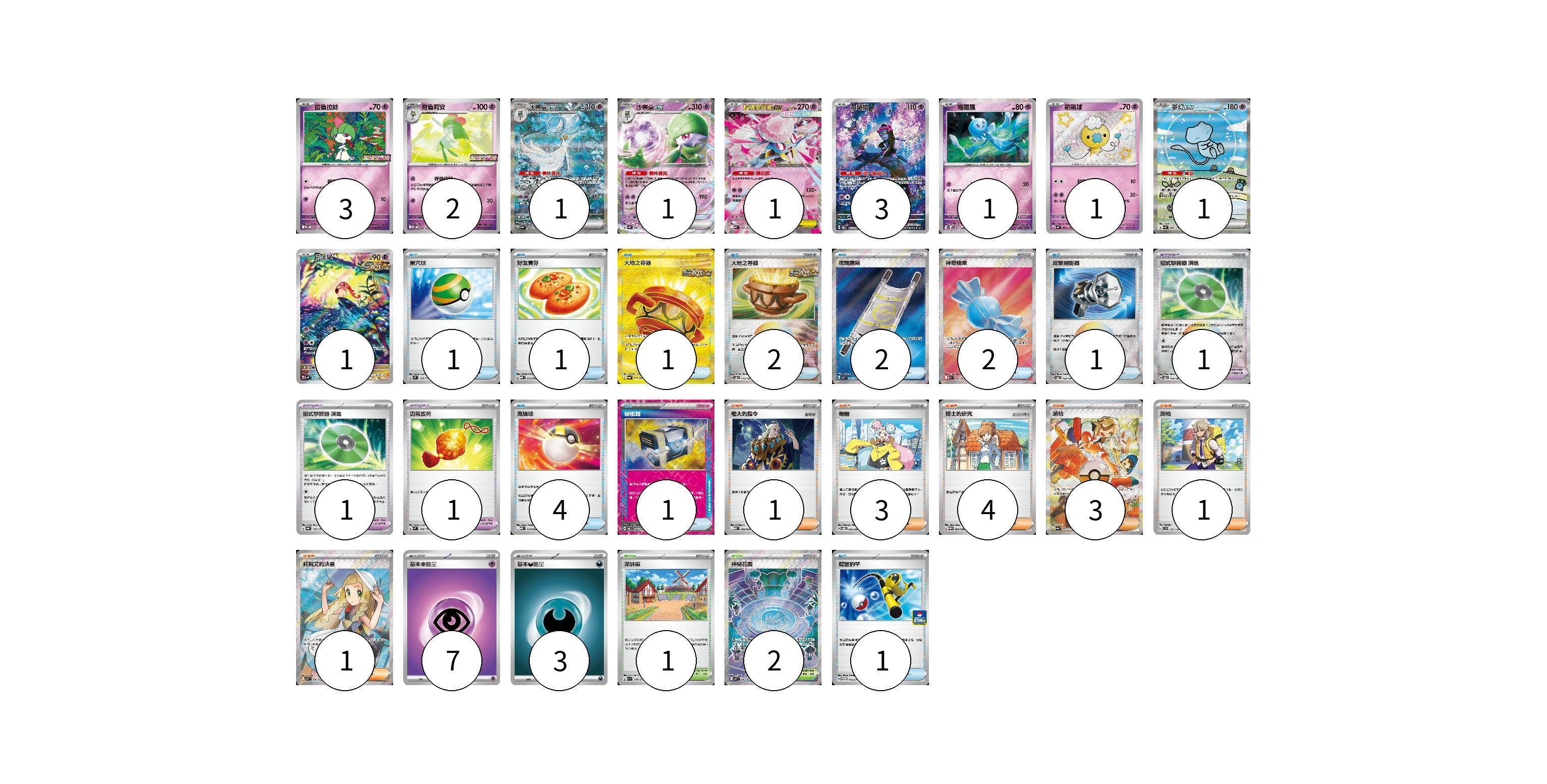 牌組構築方案 以此牌組為基礎新構築牌組 顯示卡面 顯示列表 寶可夢卡(15) 3 2 1 1 1 3 1 1 1 1 寶可夢道具(3) 1 1 1 物品卡(16) 1 1 1 2 2 2 1 4 1 1 支援者卡(13) 1 3 4 3 1 1 競技場卡(3) 1 2 能量卡(10) 7 3 寶可夢卡(15) 卡牌名稱 張數 卡牌名稱 張數 拉魯拉絲 M-P 005/M-P 03 奇魯莉安 M-P 006/M-P 02 沙奈朵ex SV4a 348/190 01 沙奈朵ex SV4a 082/190 01 超級蒂安希ex MBD 006/022 01 願增猿 SV6 107/101 03 輕飄飄 SV11W 041/086 01 飄飄球 SV4a 260/190 01 夢幻ex SV4a 347/190 01 吼叫尾 SV4K 071/066 01 寶可夢道具(3) 卡牌名稱 張數 卡牌名稱 張數 招式學習器 演進 SV8a 160/187 01 招式學習器 演進 SV8a 160/187 01 勇氣護符 SVM 142/175 01 物品卡(16) 卡牌名稱 張數 卡牌名稱 張數 巢穴球 SVM 133/175 01 好友寶芬 MBD 013/022 01 大地之容器 SV6a 093/064 01 大地之容器 SV8a 143/187 02 夜間擔架 M1L 083/063 02 神奇糖果 M1S 082/063 02 反擊捕捉器 SV8a 139/187 01 高級球 MBD 014/022 04 秘密箱 SV6 092/101 01 厲害釣竿 SV-P 112/SV-P 01 支援者卡(13) 卡牌名稱 張數 卡牌名稱 張數 老大的指令 MBD 020/022 01 奇樹 SVOD 016/020 03 博士的研究 SV11B 084/086 04 派帕 SV4a 353/190 03 派帕 SVD 137/139 01 莉莉艾的決意 M1L 086/063 01 競技場卡(3) 卡牌名稱 張數 卡牌名稱 張數 深缽鎮 SV1a 070/073 01 神秘花園 M1S 086/063 02 能量卡(10) 卡牌名稱 張數 卡牌名稱 張數 基本超能量 sv-p PSY 07 基本惡能量 sv-p DAR 03 以此牌組為基礎新構築牌組 牌組編碼 EWOOQr-zrkYrU-JKjRCi copy 列印牌組單 牌組編碼已複製 分享至SNS