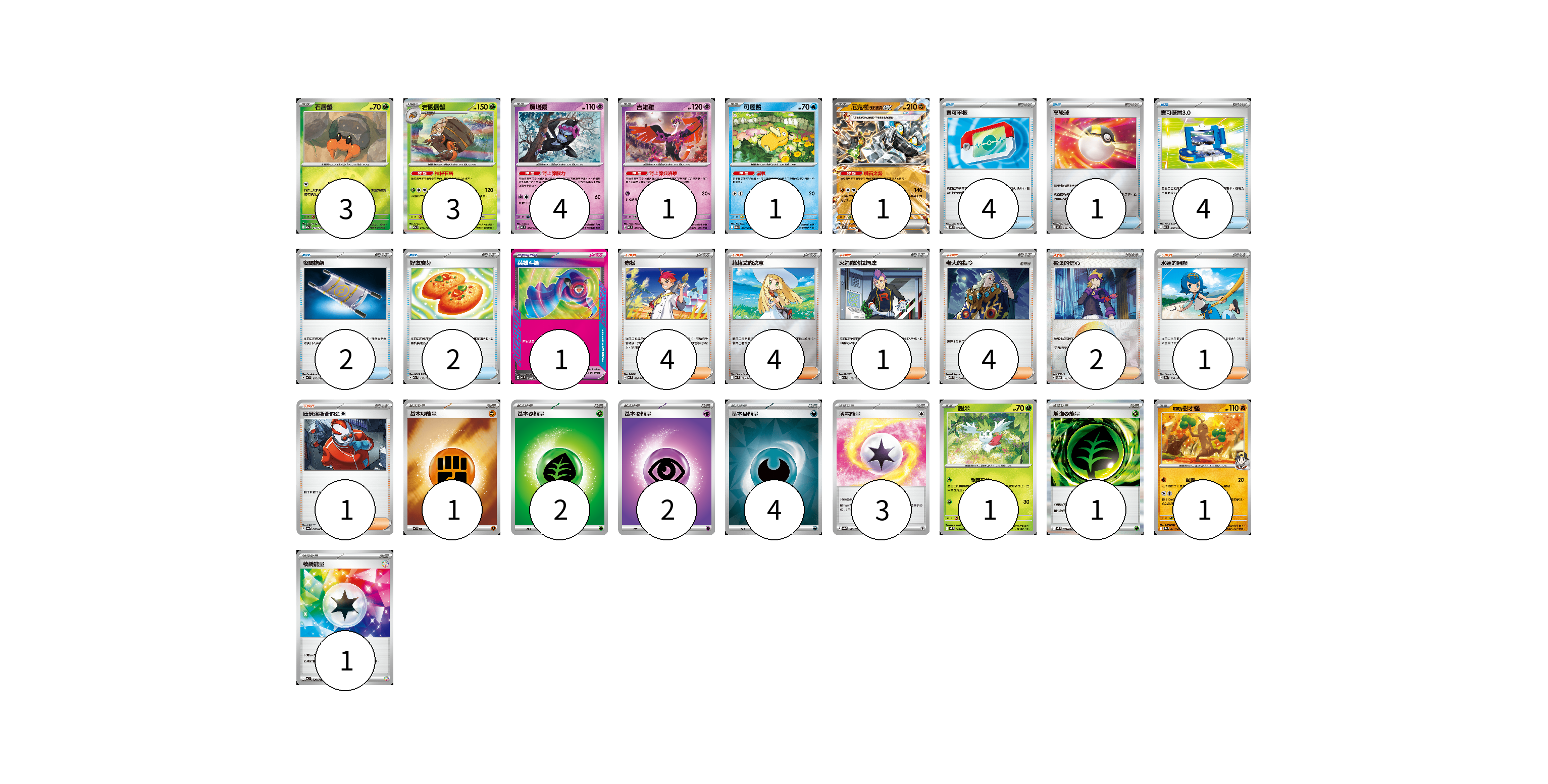 牌組構築方案 以此牌組為基礎新構築牌組 顯示卡面 顯示列表 寶可夢卡(15) 3 3 4 1 1 1 1 1 寶可夢道具(1) 1 物品卡(13) 4 1 4 2 2 支援者卡(17) 4 4 1 4 2 1 1 能量卡(14) 1 2 2 4 3 1 1 寶可夢卡(15) 卡牌名稱 張數 卡牌名稱 張數 石居蟹 M2a 013/193 03 岩殿居蟹 M2a 014/193 03 願增猿 MC 358/742 04 吉雉雞 MC 359/742 01 可達鴨 M2a 032/193 01 厄鬼椪 礎石面具ex MC 428/742 01 謝米 M3 003/080 01 <阿響的>樹才怪 SV9a 041/063 01 寶可夢道具(1) 卡牌名稱 張數 卡牌名稱 張數 英雄斗篷 MC 687/742 01 物品卡(13) 卡牌名稱 張數 卡牌名稱 張數 寶可平板 M3 070/080 04 高級球 MC 651/742 01 寶可裝置3.0 MC 660/742 04 夜間擔架 MC 670/742 02 好友寶芬 M2a 153/193 02 支援者卡(17) 卡牌名稱 張數 卡牌名稱 張數 赤松 MC 696/742 04 莉莉艾的決意 MC 729/742 04 火箭隊的拉姆達 M2a 179/193 01 老大的指令 MBD 020/022 04 松葉的信心 SV8a 178/187 02 水蓮的照顧 SV8a 168/187 01 庫瑟洛斯奇的企圖 SV6a 062/064 01 能量卡(14) 卡牌名稱 張數 卡牌名稱 張數 基本【鬥】能量 MC FIG 01 基本【草】能量 MJ GRA 02 基本【超】能量 M-P PSY 02 基本【惡】能量 SVOM DAR 04 薄霧能量 SV8a 186/187 03 增強【草】能量 M3 078/080 01 稜鏡能量 MC 739/742 01 以此牌組為基礎新構築牌組 牌組編碼 EWSirR-CvsQmF-EapJAx copy 列印牌組單 牌組編碼已複製 分享至SNS
