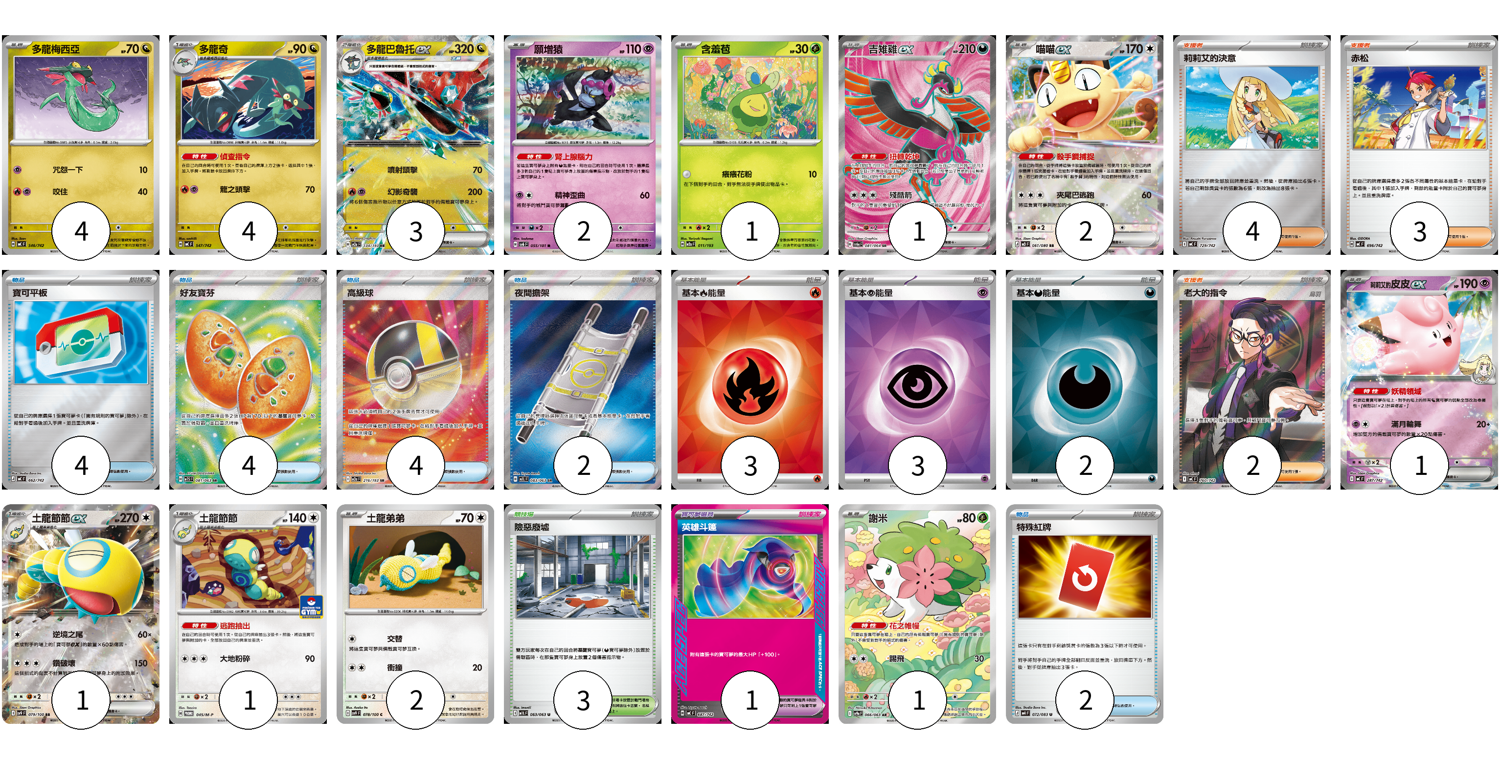 牌組構築方案 以此牌組為基礎新構築牌組 顯示卡面 顯示列表 寶可夢卡(23) 4 4 3 2 1 1 2 1 1 1 2 1 寶可夢道具(1) 1 物品卡(16) 4 4 4 2 2 支援者卡(9) 4 3 2 競技場卡(3) 3 能量卡(8) 3 3 2 寶可夢卡(23) 卡牌名稱 張數 卡牌名稱 張數 多龍梅西亞 MC 546/742 04 多龍奇 MC 547/742 04 多龍巴魯托ex M2a 134/193 03 願增猿 SV6 055/101 02 含羞苞 M2a 011/193 01 吉雉雞ex SV6a 081/064 01 喵喵ex M3 061/080 02 莉莉艾的皮皮ex MC 287/742 01 土龍節節ex SV9 079/100 01 土龍節節 M-P 045/M-P 01 土龍弟弟 SV9 078/100 02 謝米 SV9a 066/063 01 寶可夢道具(1) 卡牌名稱 張數 卡牌名稱 張數 英雄斗篷 MC 687/742 01 物品卡(16) 卡牌名稱 張數 卡牌名稱 張數 寶可平板 MC 662/742 04 好友寶芬 M1S 081/063 04 高級球 M2a 216/193 04 夜間擔架 M1L 083/063 02 特殊紅牌 M4 072/083 02 支援者卡(9) 卡牌名稱 張數 卡牌名稱 張數 莉莉艾的決意 MC 729/742 04 赤松 MC 696/742 03 老大的指令(烏羽) MC 760/742 02 競技場卡(3) 卡牌名稱 張數 卡牌名稱 張數 險惡廢墟 M1L 063/063 03 能量卡(8) 卡牌名稱 張數 卡牌名稱 張數 基本【火】能量 SVQL FIR 03 基本【超】能量 SVM PSY 03 基本【惡】能量 SVM DAR 02 以此牌組為基礎新構築牌組 牌組編碼 EXKTWG-CKiZge-EpWssr copy 列印牌組單 牌組編碼已複製 分享至SNS