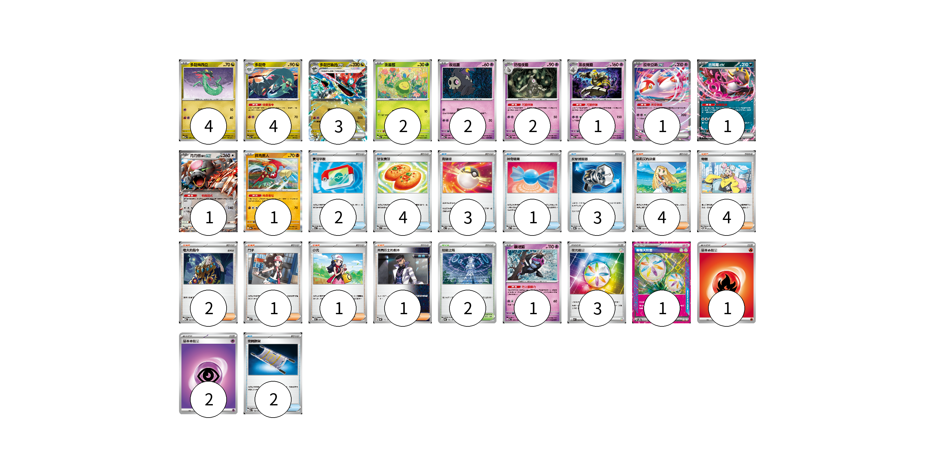牌組構築方案 以此牌組為基礎新構築牌組 顯示卡面 顯示列表 寶可夢卡(23) 4 4 3 2 2 2 1 1 1 1 1 1 物品卡(15) 2 4 3 1 3 2 支援者卡(13) 4 4 2 1 1 1 競技場卡(2) 2 能量卡(7) 3 1 1 2 寶可夢卡(23) 卡牌名稱 張數 卡牌名稱 張數 多龍梅西亞 MC 546/742 04 多龍奇 MC 547/742 04 多龍巴魯托ex MC 548/742 03 含羞苞 M2a 011/193 02 夜巡靈 MC 308/742 02 彷徨夜靈 MC 309/742 02 黑夜魔靈 MC 310/742 01 拉帝亞斯ex MC 312/742 01 吉雉雞ex MC 489/742 01 月月熊 赫月 ex MC 625/742 01 摔角鷹人 SV8a 084/187 01 願增猿 MC 358/742 01 物品卡(15) 卡牌名稱 張數 卡牌名稱 張數 寶可平板 MC 662/742 02 好友寶芬 MC 648/742 04 高級球 MC 651/742 03 神奇糖果 MC 655/742 01 反擊捕捉器 SV8a 139/187 03 夜間擔架 M2a 159/193 02 支援者卡(13) 卡牌名稱 張數 卡牌名稱 張數 莉莉艾的決意 MC 729/742 04 奇樹 SVOD 016/020 04 老大的指令 MBD 020/022 02 鬥子 MC 718/742 01 小光 M2 077/080 01 弗圖博士的劇本 SV8a 175/187 01 競技場卡(2) 卡牌名稱 張數 卡牌名稱 張數 阻礙之塔 SV8a 181/187 02 能量卡(7) 卡牌名稱 張數 卡牌名稱 張數 夜光能量 SVK 042/042 03 新衝天能量 SV5K 071/071 01 基本【火】能量 SVHK FIR 01 基本【超】能量 SVHM PSY 02 以此牌組為基礎新構築牌組 牌組編碼 EYiMsv-WdOlYi-tVdZyE copy 列印牌組單 牌組編碼已複製 分享至SNS