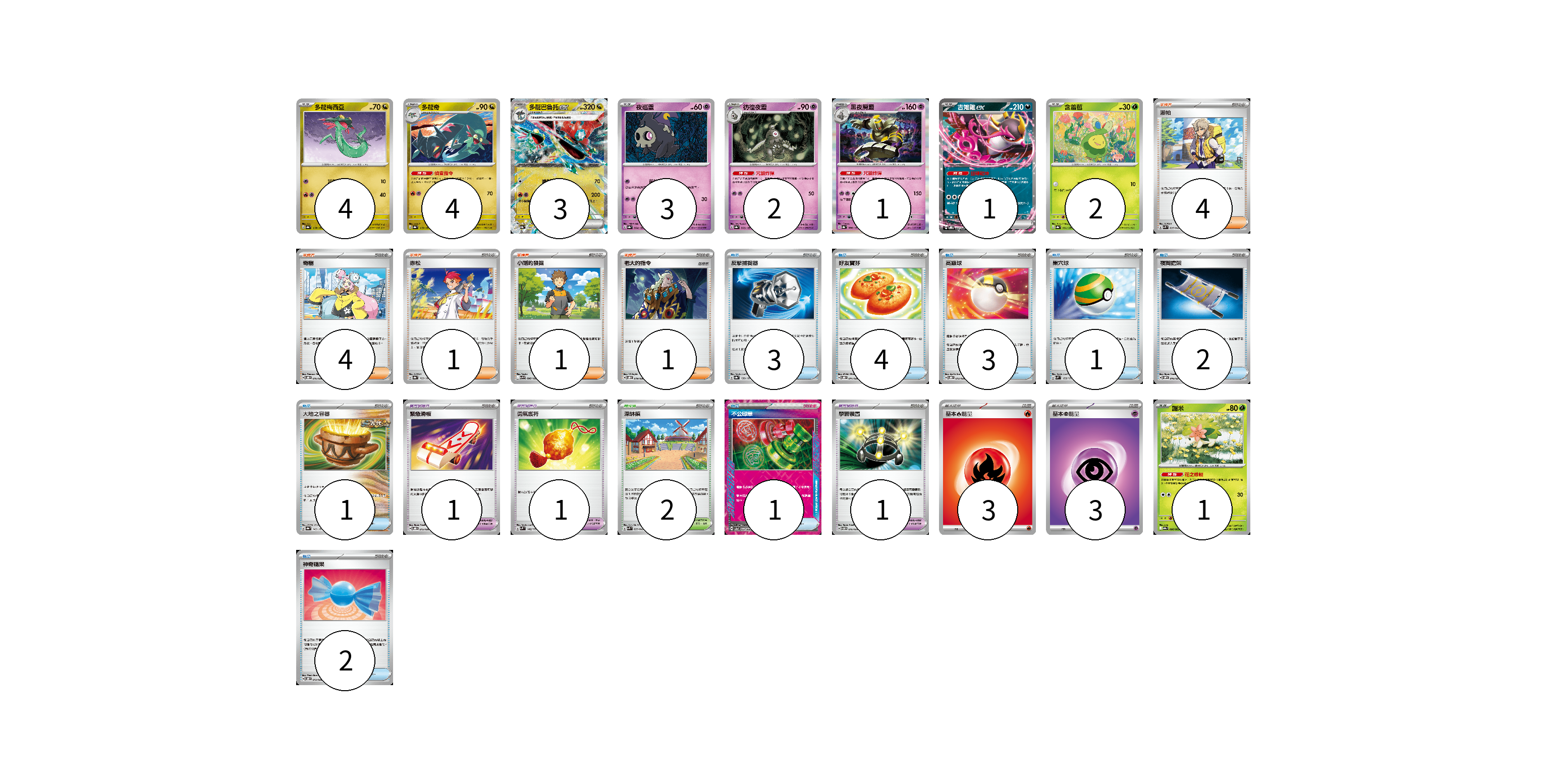 牌組構築方案 以此牌組為基礎新構築牌組 顯示卡面 顯示列表 寶可夢卡(21) 4 4 3 3 2 1 1 2 1 寶可夢道具(3) 1 1 1 物品卡(17) 3 4 3 1 2 1 1 2 支援者卡(11) 4 4 1 1 1 競技場卡(2) 2 能量卡(6) 3 3 寶可夢卡(21) 卡牌名稱 張數 卡牌名稱 張數 多龍梅西亞 SV8a 118/187 04 多龍奇 SV8a 119/187 04 多龍巴魯托ex SV8a 120/187 03 夜巡靈 SV8a 064/187 03 彷徨夜靈 SV8a 065/187 02 黑夜魔靈 SV8a 066/187 01 吉雉雞ex SVOD 004/020 01 含羞苞 SV8a 001/187 02 謝米 SV9a 006/063 01 寶可夢道具(3) 卡牌名稱 張數 卡牌名稱 張數 緊急滑板 SVOD 015/020 01 勇氣護符 SVM 142/175 01 學習裝置 SVTM 016/022 01 物品卡(17) 卡牌名稱 張數 卡牌名稱 張數 反擊捕捉器 SV8a 139/187 03 好友寶芬 SVOD 011/020 04 高級球 SVOD 012/020 03 巢穴球 SVM 133/175 01 夜間擔架 SVOM 016/021 02 大地之容器 SV8a 143/187 01 不公印章 SV5a 053/066 01 神奇糖果 SVOD 013/020 02 支援者卡(11) 卡牌名稱 張數 卡牌名稱 張數 派帕 SVK 035/042 04 奇樹 SVOD 016/020 04 赤松 SV8a 163/187 01 小剛的發掘 SV9 096/100 01 老大的指令 SVOD 019/020 01 競技場卡(2) 卡牌名稱 張數 卡牌名稱 張數 深缽鎮 SVK 039/042 02 能量卡(6) 卡牌名稱 張數 卡牌名稱 張數 基本火能量 sv-p FIR 03 基本超能量 sv-p PSY 03 以此牌組為基礎新構築牌組 牌組編碼 EbAbeB-QFJiTD-ggqKPp copy 列印牌組單 牌組編碼已複製 分享至SNS