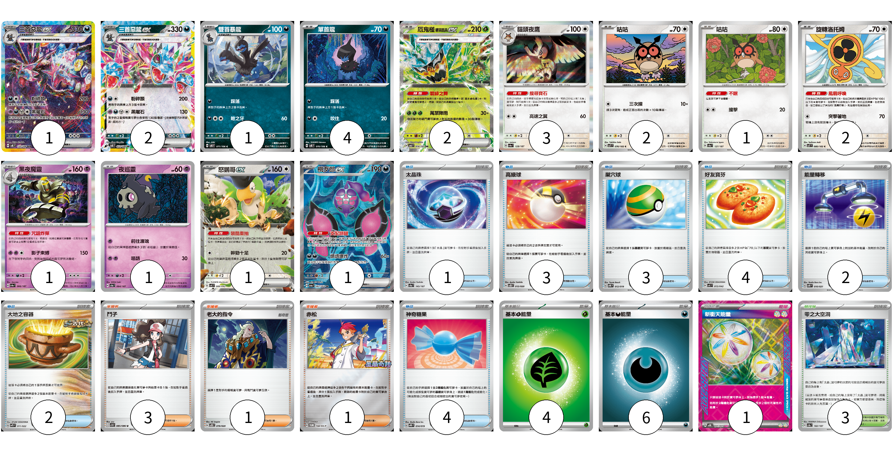 牌組構築方案 以此牌組為基礎新構築牌組 顯示卡面 顯示列表 寶可夢卡(22) 1 2 1 4 2 3 2 1 2 1 1 1 1 物品卡(19) 1 3 3 4 2 2 4 支援者卡(5) 3 1 1 競技場卡(3) 3 能量卡(11) 4 6 1 寶可夢卡(22) 卡牌名稱 張數 卡牌名稱 張數 三首惡龍ex SV8 133/106 01 三首惡龍ex SV8 072/106 02 雙首暴龍 SV8 071/106 01 單首龍 SV8 070/106 04 厄鬼椪 碧草面具ex SV6 016/101 02 貓頭夜鷹 SV8a 128/187 03 咕咕 SV7 076/102 02 咕咕 SV8a 127/187 01 旋轉洛托姆 SV7 080/102 02 黑夜魔靈 SV8a 066/187 01 夜巡靈 SV8a 064/187 01 怒鸚哥ex SVK 006/042 01 桃歹郎ex SV6a 082/064 01 物品卡(19) 卡牌名稱 張數 卡牌名稱 張數 太晶珠 SV8a 145/187 01 高級球 SVOD 012/020 03 巢穴球 SVTG 012/019 03 好友寶芬 SVK 015/042 04 能量轉移 SVTR 010/021 02 大地之容器 SVTS 011/022 02 神奇糖果 SVTG 014/019 04 支援者卡(5) 卡牌名稱 張數 卡牌名稱 張數 鬥子 SV11W 085/086 03 老大的指令 SVOD 019/020 01 赤松 SV-P 150/SV-P 01 競技場卡(3) 卡牌名稱 張數 卡牌名稱 張數 零之大空洞 SV8a 182/187 03 能量卡(11) 卡牌名稱 張數 卡牌名稱 張數 基本【草】能量 M-P GRA 04 基本【惡】能量 M-P DAR 06 新衝天能量 SV5K 071/071 01 以此牌組為基礎新構築牌組 牌組編碼 EdnFFg-Xoxztv-wvffTZ copy 列印牌組單 牌組編碼已複製 分享至SNS