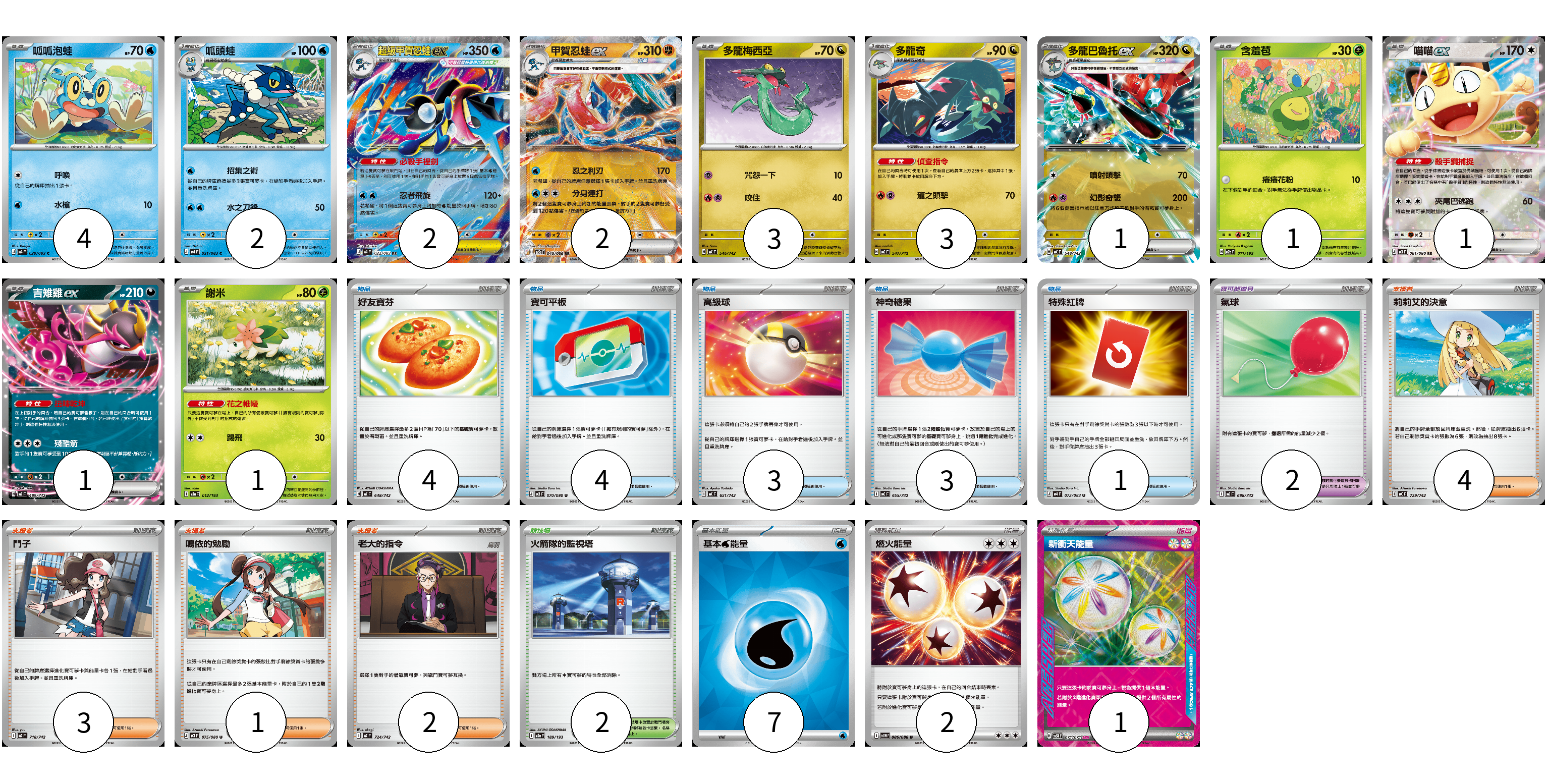 牌組構築方案 以此牌組為基礎新構築牌組 顯示卡面 顯示列表 寶可夢卡(21) 4 2 2 2 3 3 1 1 1 1 1 寶可夢道具(2) 2 物品卡(15) 4 4 3 3 1 支援者卡(10) 4 3 1 2 競技場卡(2) 2 能量卡(10) 7 2 1 寶可夢卡(21) 卡牌名稱 張數 卡牌名稱 張數 呱呱泡蛙 M4 020/083 04 呱頭蛙 M4 021/083 02 超級甲賀忍蛙ex M4 022/083 02 甲賀忍蛙ex SV5a 045/066 02 多龍梅西亞 MC 546/742 03 多龍奇 MC 547/742 03 多龍巴魯托ex MC 548/742 01 含羞苞 M2a 011/193 01 喵喵ex M3 061/080 01 吉雉雞ex MC 489/742 01 謝米 M2a 012/193 01 寶可夢道具(2) 卡牌名稱 張數 卡牌名稱 張數 氣球 MC 688/742 02 物品卡(15) 卡牌名稱 張數 卡牌名稱 張數 好友寶芬 MC 648/742 04 寶可平板 M3 070/080 04 高級球 MC 651/742 03 神奇糖果 MC 655/742 03 特殊紅牌 M4 072/083 01 支援者卡(10) 卡牌名稱 張數 卡牌名稱 張數 莉莉艾的決意 MC 729/742 04 鬥子 MC 718/742 03 鳴依的勉勵 M3 075/080 01 老大的指令 MC 724/742 02 競技場卡(2) 卡牌名稱 張數 卡牌名稱 張數 火箭隊的監視塔 M2a 189/193 02 能量卡(10) 卡牌名稱 張數 卡牌名稱 張數 基本【水】能量 SVM WAT 07 燃火能量 SV11W 086/086 02 新衝天能量 SV5K 071/071 01 以此牌組為基礎新構築牌組 牌組編碼 EepmAE-XPnmeL-FkvwMP copy 列印牌組單 牌組編碼已複製 分享至SNS