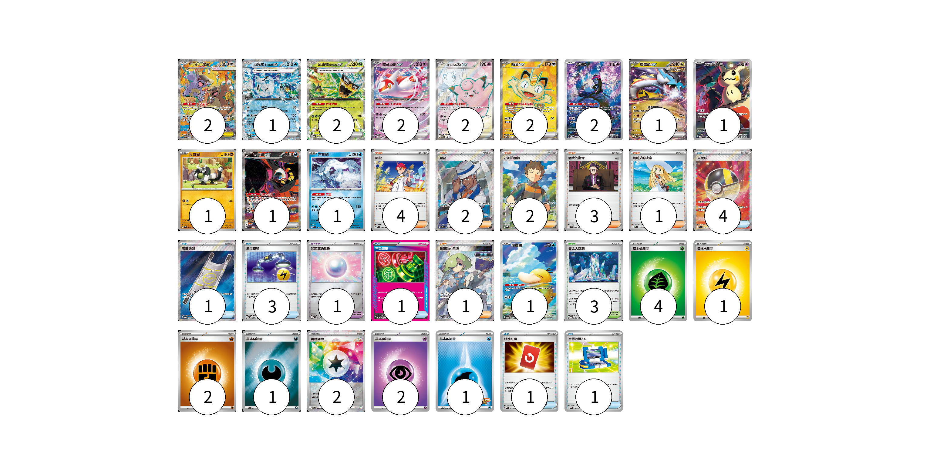 牌組構築方案 以此牌組為基礎新構築牌組 顯示卡面 顯示列表 寶可夢卡(19) 2 1 2 2 2 2 2 1 1 1 1 1 1 寶可夢道具(1) 1 物品卡(11) 4 1 3 1 1 1 支援者卡(13) 4 2 2 3 1 1 競技場卡(3) 3 能量卡(13) 4 1 2 1 2 2 1 寶可夢卡(19) 卡牌名稱 張數 卡牌名稱 張數 超級袋獸ex M1S 089/063 02 厄鬼椪 水井面具ex SV8a 050/187 01 厄鬼椪 碧草面具ex SV8a 020/187 02 拉帝亞斯ex M2a 075/193 02 莉莉艾的皮皮ex SV9 115/100 02 喵喵ex M3 100/080 02 願增猿 SV6 107/101 02 猛雷鼓ex MC 554/742 01 <火箭隊的>謎擬Q M2a 205/193 01 投擲猴 SV7a 031/064 01 吉雉雞ex SV6a 089/064 01 古劍豹 M2a 043/193 01 可達鴨 M2a 199/193 01 寶可夢道具(1) 卡牌名稱 張數 卡牌名稱 張數 莉莉艾的珍珠 MC 692/742 01 物品卡(11) 卡牌名稱 張數 卡牌名稱 張數 高級球 M2a 216/193 04 夜間擔架 M1L 083/063 01 能量轉移 MC 638/742 03 不公印章 MC 633/742 01 特殊紅牌 M4 072/083 01 寶可裝置3.0 SVAW 016/023 01 支援者卡(13) 卡牌名稱 張數 卡牌名稱 張數 赤松 MC 696/742 04 席藍 SV8 127/106 02 小剛的發掘 SV9 123/100 02 老大的指令 MC 724/742 03 莉莉艾的決意 MC 729/742 01 暗碼迷的解讀 SV5M 090/071 01 競技場卡(3) 卡牌名稱 張數 卡牌名稱 張數 零之大空洞 M2a 184/193 03 能量卡(13) 卡牌名稱 張數 卡牌名稱 張數 基本【草】能量 MJ GRA 04 基本【雷】能量 MJ LIG 01 基本【鬥】能量 MC FIG 02 基本【惡】能量 MC DAR 01 稜鏡能量 SV11B 086/086 02 基本【超】能量 M-P PSY 02 基本【水】能量 SV-P 259/SV-P 01 以此牌組為基礎新構築牌組 牌組編碼 EeyPix-LhCUdB-iWWXdH copy 列印牌組單 牌組編碼已複製 分享至SNS