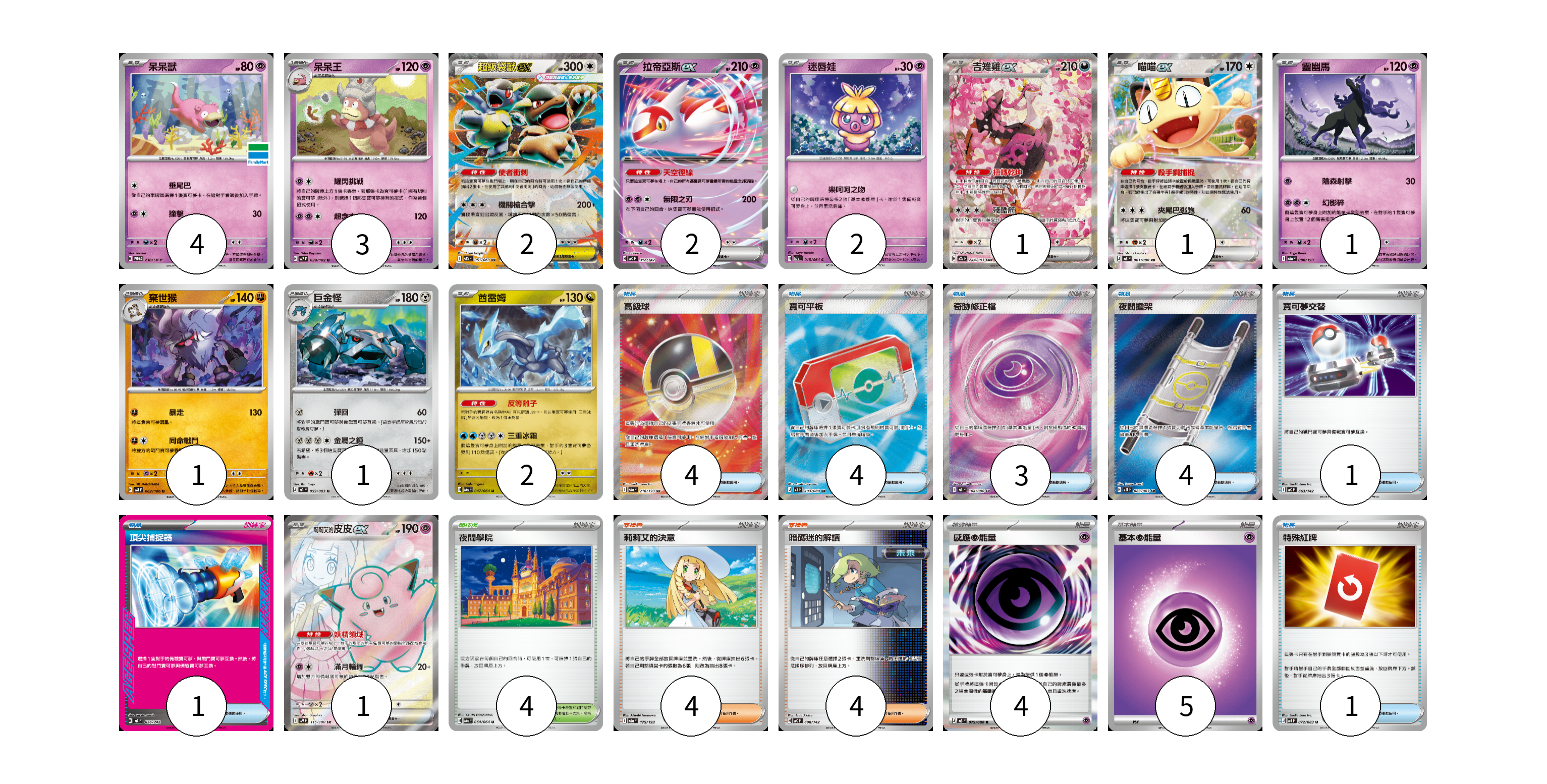 牌組構築方案 以此牌組為基礎新構築牌組 顯示卡面 顯示列表 寶可夢卡(21) 4 3 2 2 2 1 1 1 1 1 2 1 物品卡(18) 4 4 3 4 1 1 1 支援者卡(8) 4 4 競技場卡(4) 4 能量卡(9) 4 5 寶可夢卡(21) 卡牌名稱 張數 卡牌名稱 張數 呆呆獸 SV-P 238/SV-P 04 呆呆王 SV7 039/102 03 超級袋獸ex M1S 051/063 02 拉帝亞斯ex MC 312/742 02 迷唇娃 SV7a 018/064 02 吉雉雞ex M2a 244/193 01 喵喵ex M3 061/080 01 靈幽馬 M2a 080/193 01 棄世猴 SV8 062/106 01 巨金怪 M4 059/083 01 酋雷姆 SV6a 047/064 02 莉莉艾的皮皮ex SV9 115/100 01 物品卡(18) 卡牌名稱 張數 卡牌名稱 張數 高級球 M2a 216/193 04 寶可平板 M3 103/080 04 奇跡修正檔 M3 104/080 03 夜間擔架 M1L 083/063 04 寶可夢交替 MC 663/742 01 頂尖捕捉器 MC 656/742 01 特殊紅牌 M4 072/083 01 支援者卡(8) 卡牌名稱 張數 卡牌名稱 張數 莉莉艾的決意 M2a 175/193 04 暗碼迷的解讀 MC 698/742 04 競技場卡(4) 卡牌名稱 張數 卡牌名稱 張數 夜間學院 SV6a 064/064 04 能量卡(9) 卡牌名稱 張數 卡牌名稱 張數 感應【超】能量 M3 079/080 04 基本【超】能量 MC PSY 05 以此牌組為基礎新構築牌組 牌組編碼 EfdanW-USWpXa-ZBteEp copy 列印牌組單 牌組編碼已複製 分享至SNS