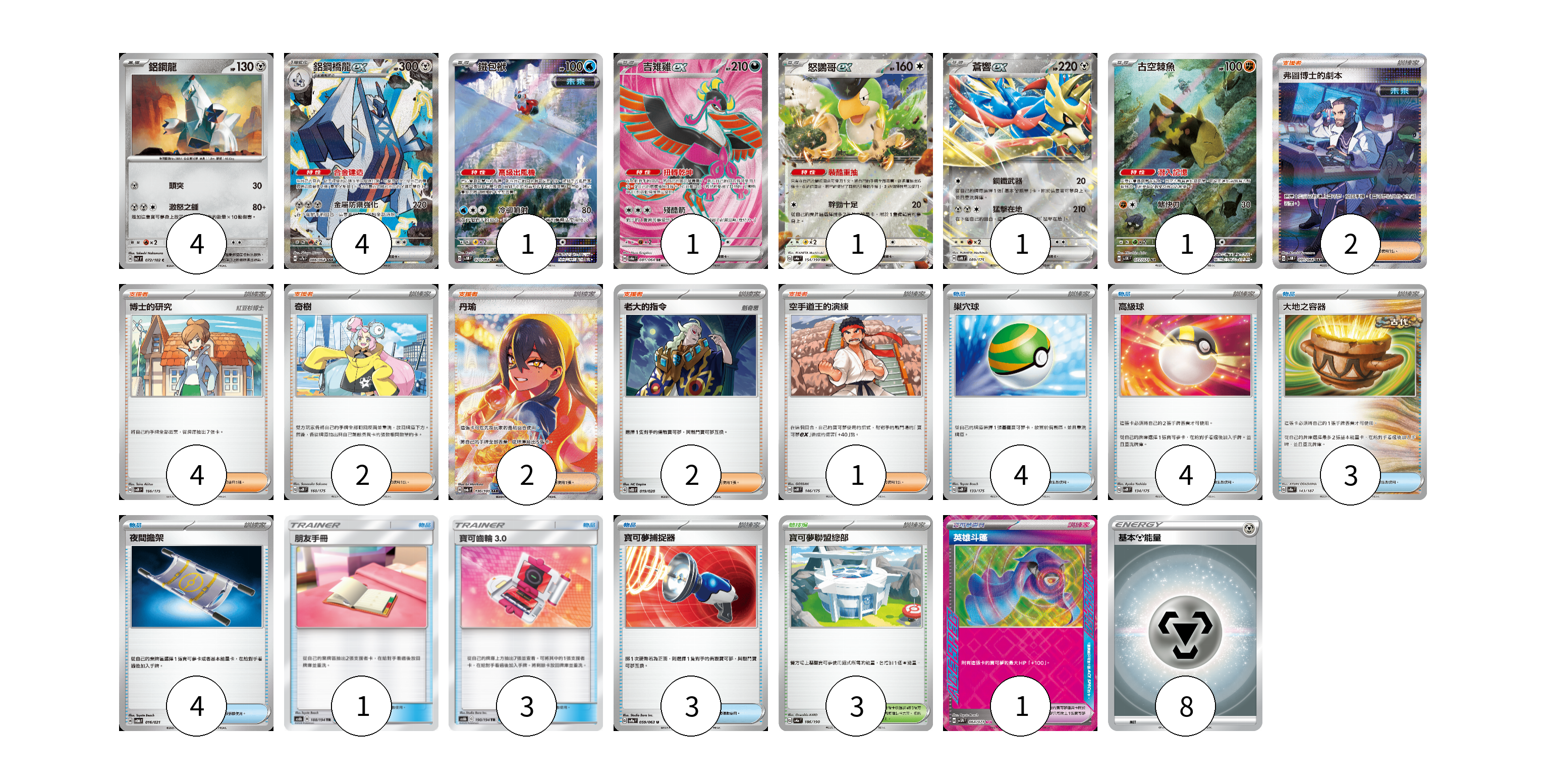 牌組構築方案 以此牌組為基礎新構築牌組 顯示卡面 顯示列表 寶可夢卡(13) 4 4 1 1 1 1 1 寶可夢道具(1) 1 物品卡(22) 4 4 3 4 1 3 3 支援者卡(13) 2 4 2 2 2 1 競技場卡(3) 3 能量卡(8) 8 寶可夢卡(13) 卡牌名稱 張數 卡牌名稱 張數 鋁鋼龍 SV7 072/102 04 鋁鋼橋龍ex SV7a 088/064 04 鐵包袱 SV4M 071/066 01 吉雉雞ex SV6a 081/064 01 怒鸚哥ex SV4a 154/190 01 蒼響ex SVM 089/175 01 古空棘魚 SV5K 077/071 01 寶可夢道具(1) 卡牌名稱 張數 卡牌名稱 張數 英雄斗篷 SV5M 064/071 01 物品卡(22) 卡牌名稱 張數 卡牌名稱 張數 巢穴球 SVM 133/175 04 高級球 SVM 134/175 04 大地之容器 SV8a 143/187 03 夜間擔架 SVOM 016/021 04 朋友手冊 AS6b 188/194 01 寶可齒輪3.0 AS6b 190/194 03 寶可夢捕捉器 SV9a 059/063 03 支援者卡(13) 卡牌名稱 張數 卡牌名稱 張數 弗圖博士的劇本 SV4M 091/066 02 博士的研究 SVM 166/175 04 奇樹 SVM 160/175 02 丹瑜 SV6 130/101 02 老大的指令 SVOD 019/020 02 空手道王的演練 SVM 146/175 01 競技場卡(3) 卡牌名稱 張數 卡牌名稱 張數 寶可夢聯盟總部 SV4a 186/190 03 能量卡(8) 卡牌名稱 張數 卡牌名稱 張數 基本【鋼】能量 SI MET 08 以此牌組為基礎新構築牌組 牌組編碼 EgMuYe-dcBBpW-Rkjuoq copy 列印牌組單 牌組編碼已複製 分享至SNS