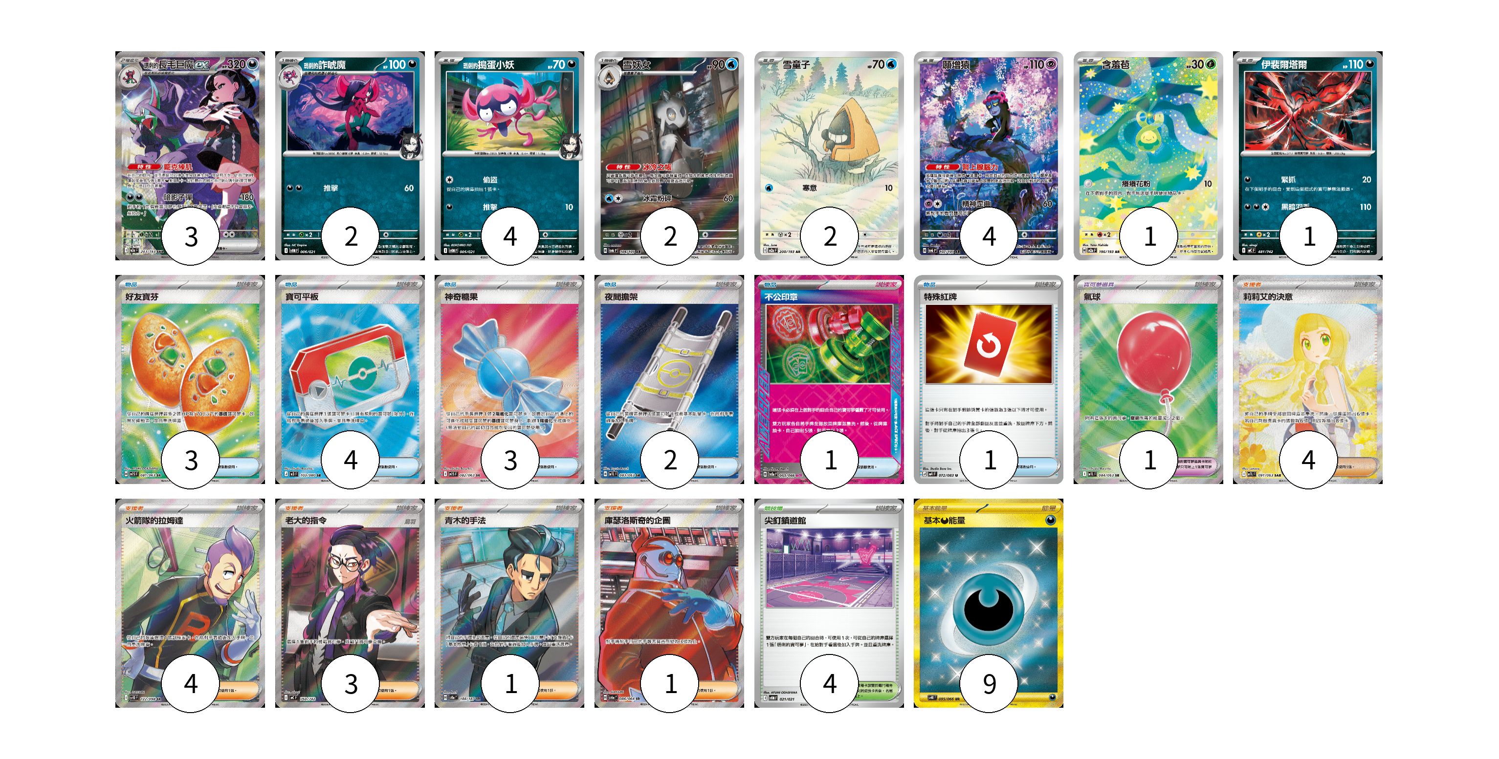 牌組構築方案 以此牌組為基礎新構築牌組 顯示卡面 顯示列表 寶可夢卡(19) 3 2 4 2 2 4 1 1 寶可夢道具(1) 1 物品卡(14) 3 4 3 2 1 1 支援者卡(13) 4 4 3 1 1 競技場卡(4) 4 能量卡(9) 9 寶可夢卡(19) 卡牌名稱 張數 卡牌名稱 張數 <瑪俐的>長毛巨魔ex M2a 243/193 03 <瑪俐的>詐唬魔 SVOM 006/021 02 <瑪俐的>搗蛋小妖 SVOM 005/021 04 雪妖女 SV6 104/101 02 雪童子 M2a 200/193 02 願增猿 SV6 107/101 04 含羞苞 M2a 196/193 01 伊裴爾塔爾 MC 481/742 01 寶可夢道具(1) 卡牌名稱 張數 卡牌名稱 張數 氣球 M1L 084/063 01 物品卡(14) 卡牌名稱 張數 卡牌名稱 張數 好友寶芬 M1S 081/063 03 寶可平板 M3 103/080 04 神奇糖果 M1S 082/063 03 夜間擔架 M1L 083/063 02 不公印章 SV5a 053/066 01 特殊紅牌 M4 072/083 01 支援者卡(13) 卡牌名稱 張數 卡牌名稱 張數 莉莉艾的決意 M1L 091/063 04 火箭隊的拉姆達 SV10 122/098 04 老大的指令(烏羽) MC 760/742 03 青木的手法 SV8a 188/187 01 庫瑟洛斯奇的企圖 SV6a 086/064 01 競技場卡(4) 卡牌名稱 張數 卡牌名稱 張數 尖釘鎮道館 SVOM 021/021 04 能量卡(9) 卡牌名稱 張數 卡牌名稱 張數 基礎【惡】能量 SV4K 095/066 09 以此牌組為基礎新構築牌組 牌組編碼 EgiyCG-FUMEDE-RgtkBc copy 列印牌組單 牌組編碼已複製 分享至SNS