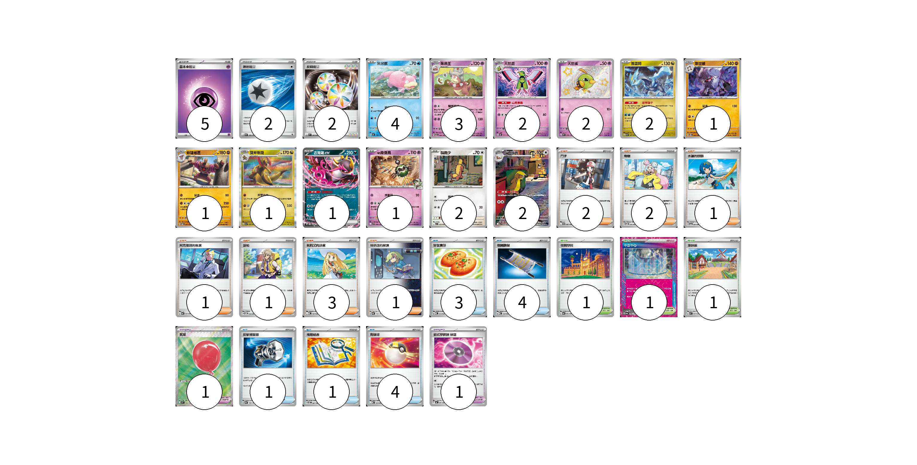 牌組構築方案 以此牌組為基礎新構築牌組 顯示卡面 顯示列表 寶可夢卡(22) 4 3 2 2 2 1 1 1 1 1 2 2 寶可夢道具(2) 1 1 物品卡(13) 3 4 1 1 4 支援者卡(11) 2 2 1 1 1 3 1 競技場卡(3) 1 1 1 能量卡(9) 5 2 2 寶可夢卡(22) 卡牌名稱 張數 卡牌名稱 張數 呆呆獸 SV4a 036/190 04 呆呆王 SV7 039/102 03 天然鳥 SV4a 079/190 02 天然雀 SV4a 256/190 02 酋雷姆 SV6a 047/064 02 棄世猴 SV8 062/106 01 修建老匠 SV6 061/101 01 雙斧戰龍 SV6a 046/064 01 吉雉雞ex SVOM 009/021 01 N的象徵鳥 SV9 040/100 01 貓鼬少 M1L 055/063 02 貓鼬探長 M1L 075/063 02 寶可夢道具(2) 卡牌名稱 張數 卡牌名稱 張數 氣球 M1L 084/063 01 招式學習器 衰退 SV4K 063/066 01 物品卡(13) 卡牌名稱 張數 卡牌名稱 張數 好友寶芬 MBD 013/022 03 夜間擔架 MBD 016/022 04 反擊捕捉器 SV8a 139/187 01 推理組合 SV8 094/106 01 高級球 MBD 014/022 04 支援者卡(11) 卡牌名稱 張數 卡牌名稱 張數 鬥子 SV11W 085/086 02 奇樹 SVOD 016/020 02 水蓮的照顧 SV5a 064/066 01 阿克羅瑪的執著 SV6a 059/064 01 派帕 SVOD 018/020 01 莉莉艾的決意 MBD 021/022 03 暗碼迷的解讀 SV8a 165/187 01 競技場卡(3) 卡牌名稱 張數 卡牌名稱 張數 夜間學院 SV6a 064/064 01 中立中心 SV8a 184/187 01 深缽鎮 SVK 039/042 01 能量卡(9) 卡牌名稱 張數 卡牌名稱 張數 基本【超】能量 MBD PSY 05 噴射能量 SV8a 185/187 02 反轉能量 SVK 041/042 02 以此牌組為基礎新構築牌組 牌組編碼 EhzPJK-sEEAbT-bfhjNz copy 列印牌組單 牌組編碼已複製 分享至SNS