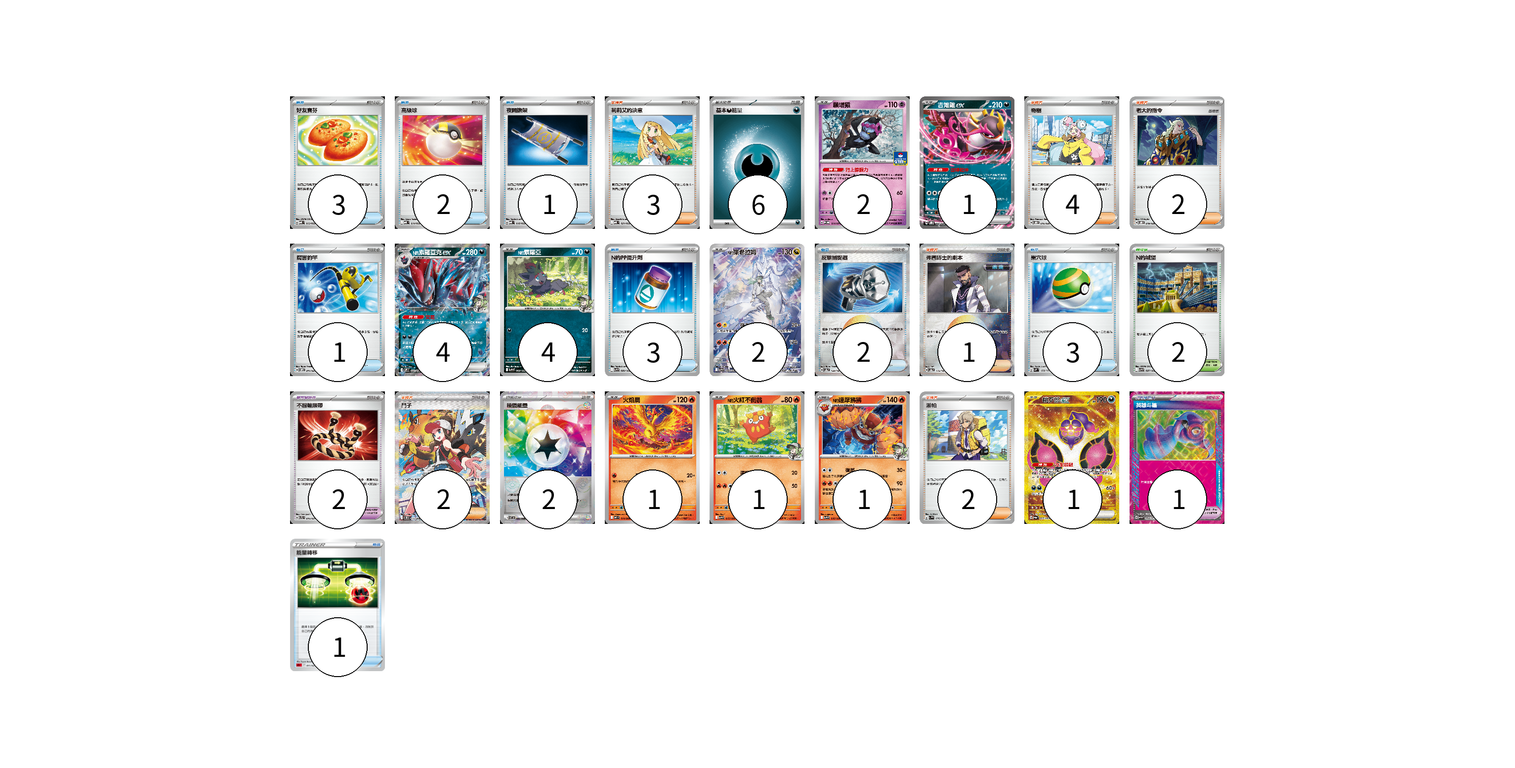 牌組構築方案 以此牌組為基礎新構築牌組 顯示卡面 顯示列表 寶可夢卡(17) 2 1 4 4 2 1 1 1 1 寶可夢道具(3) 2 1 物品卡(16) 3 2 1 1 3 2 3 1 支援者卡(14) 3 4 2 1 2 2 競技場卡(2) 2 能量卡(8) 6 2 寶可夢卡(17) 卡牌名稱 張數 卡牌名稱 張數 願增猿 M-P 014/M-P 02 吉雉雞ex SVOD 004/020 01 N的索羅亞克ex SV9 061/100 04 N的索羅亞 SV9 060/100 04 N的萊希拉姆 SV9 109/100 02 火焰鳥 M2 014/080 01 N的火紅不倒翁 SV9 015/100 01 N的達摩狒狒 SV9 016/100 01 桃歹郎ex SV6a 092/064 01 寶可夢道具(3) 卡牌名稱 張數 卡牌名稱 張數 不服輸頭帶 SVTL 016/021 02 英雄斗篷 SV5M 064/071 01 物品卡(16) 卡牌名稱 張數 卡牌名稱 張數 好友寶芬 MBD 013/022 03 高級球 MBD 014/022 02 夜間擔架 MBD 016/022 01 厲害釣竿 SVOM 011/021 01 N的PP提升劑 SV9 089/100 03 反擊捕捉器 SV8a 139/187 02 巢穴球 SVM 133/175 03 能量轉移 SDL 011/021 01 支援者卡(14) 卡牌名稱 張數 卡牌名稱 張數 莉莉艾的決意 MBD 021/022 03 奇樹 SVOD 016/020 04 老大的指令 SVOD 019/020 02 弗圖博士的劇本 SV8a 175/187 01 鬥子 SV11W 173/086 02 派帕 SV1V 076/078 02 競技場卡(2) 卡牌名稱 張數 卡牌名稱 張數 N的城堡 SV9 097/100 02 能量卡(8) 卡牌名稱 張數 卡牌名稱 張數 基本【惡】能量 MBG DAR 06 稜鏡能量 SV11B 086/086 02 以此牌組為基礎新構築牌組 牌組編碼 EkEuDL-pkuGUZ-wnJTXD copy 列印牌組單 牌組編碼已複製 分享至SNS