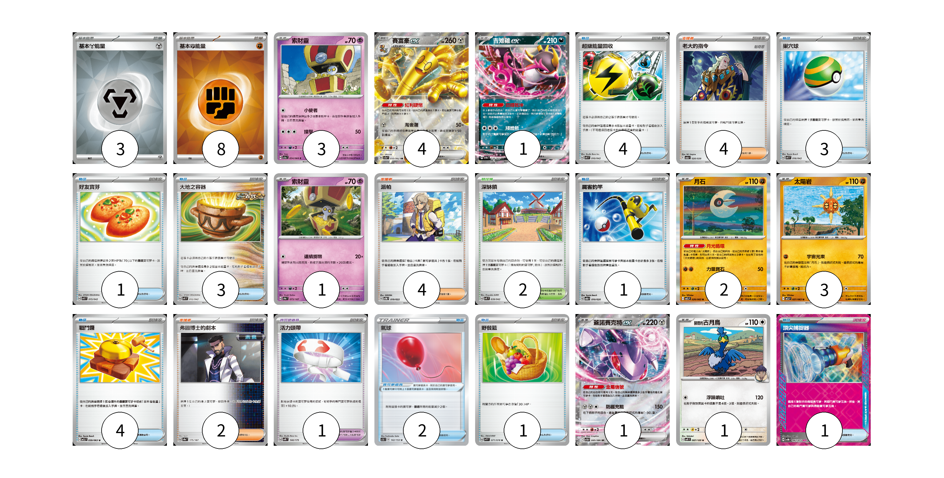 牌組構築方案 以此牌組為基礎新構築牌組 顯示卡面 顯示列表 寶可夢卡(16) 3 4 1 1 2 3 1 1 寶可夢道具(3) 1 2 物品卡(18) 4 3 1 3 1 4 1 1 支援者卡(10) 4 4 2 競技場卡(2) 2 能量卡(11) 3 8 寶可夢卡(16) 卡牌名稱 張數 卡牌名稱 張數 索財靈 SV7a 024/064 03 賽富豪ex SV3a 050/062 04 吉雉雞ex SV6a 038/064 01 索財靈 SV8a 073/187 01 月石 M1L 026/063 02 太陽岩 M1L 027/063 03 蓋諾賽克特ex SV11B 069/086 01 赫普的古月鳥 SV9 087/100 01 寶可夢道具(3) 卡牌名稱 張數 卡牌名稱 張數 活力頭帶 SVM 140/175 01 氣球 SC1b 142/153 02 物品卡(18) 卡牌名稱 張數 卡牌名稱 張數 超級能量回收 SVK 010/042 04 巢穴球 SVK 016/042 03 好友寶芬 SVK 015/042 01 大地之容器 SVK 012/042 03 厲害釣竿 SVOD 010/020 01 戰鬥鑼 M1L 059/063 04 野餐籃 SV1V 071/078 01 頂尖捕捉器 SV5M 062/071 01 支援者卡(10) 卡牌名稱 張數 卡牌名稱 張數 老大的指令 SVEM 020/020 04 派帕 SVTM 019/022 04 弗圖博士的劇本 SV8a 175/187 02 競技場卡(2) 卡牌名稱 張數 卡牌名稱 張數 深缽鎮 SVK 039/042 02 能量卡(11) 卡牌名稱 張數 卡牌名稱 張數 基本【鋼】能量 SVK MET 03 基本【鬥】能量 SVK FIG 08 以此牌組為基礎新構築牌組 牌組編碼 EoJKlb-VFjKtg-GnzczR copy 列印牌組單 牌組編碼已複製 分享至SNS