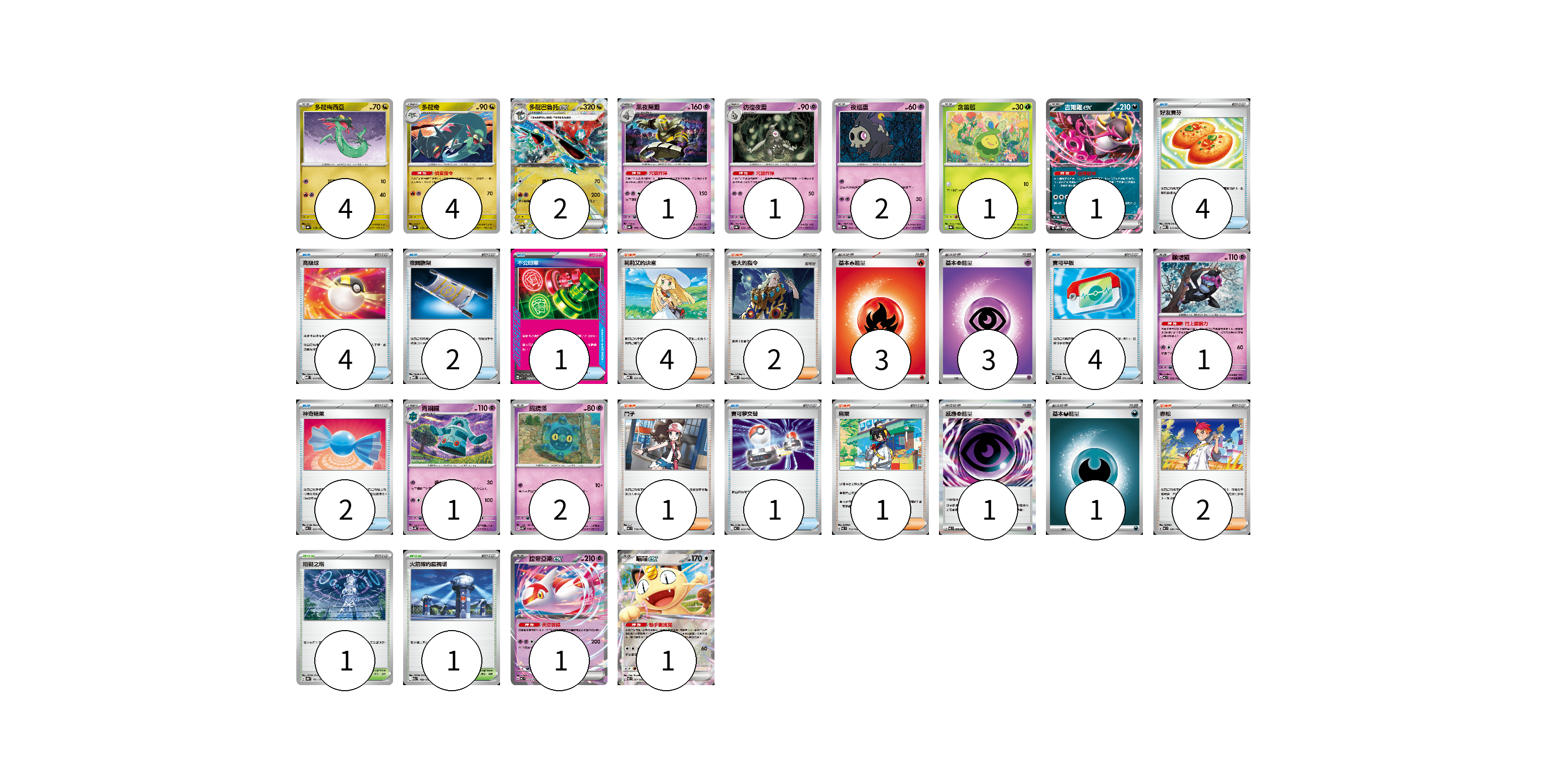 牌組構築方案 以此牌組為基礎新構築牌組 顯示卡面 顯示列表 寶可夢卡(22) 4 4 2 1 1 2 1 1 1 1 2 1 1 物品卡(18) 4 4 2 1 4 2 1 支援者卡(10) 4 2 1 1 2 競技場卡(2) 1 1 能量卡(8) 3 3 1 1 寶可夢卡(22) 卡牌名稱 張數 卡牌名稱 張數 多龍梅西亞 SV8a 118/187 04 多龍奇 SV8a 119/187 04 多龍巴魯托ex SV8a 120/187 02 黑夜魔靈 SV8a 066/187 01 彷徨夜靈 SV8a 065/187 01 夜巡靈 SV8a 064/187 02 含羞苞 SV8a 001/187 01 吉雉雞ex SVOD 004/020 01 願增猿 MC 358/742 01 青銅鐘 SV5K 029/071 01 銅鏡怪 SV5K 028/071 02 拉帝亞斯ex MC 312/742 01 喵喵ex M3 061/080 01 物品卡(18) 卡牌名稱 張數 卡牌名稱 張數 好友寶芬 MBD 013/022 04 高級球 MBD 014/022 04 夜間擔架 MBD 016/022 02 不公印章 MBD 011/022 01 寶可平板 M3 070/080 04 神奇糖果 MC 655/742 02 寶可夢交替 MC 663/742 01 支援者卡(10) 卡牌名稱 張數 卡牌名稱 張數 莉莉艾的決意 MBD 021/022 04 老大的指令 MBD 020/022 02 鬥子 MC 718/742 01 烏栗 MC 713/742 01 赤松 MC 696/742 02 競技場卡(2) 卡牌名稱 張數 卡牌名稱 張數 阻礙之塔 SV8a 181/187 01 火箭隊的監視塔 M2a 189/193 01 能量卡(8) 卡牌名稱 張數 卡牌名稱 張數 基本【火】能量 M-P FIR 03 基本【超】能量 MBD PSY 03 感應【超】能量 M3 079/080 01 基本【惡】能量 MC DAR 01 以此牌組為基礎新構築牌組 牌組編碼 EpMAYO-vIsFoq-ZBoGAD copy 列印牌組單 牌組編碼已複製 分享至SNS
