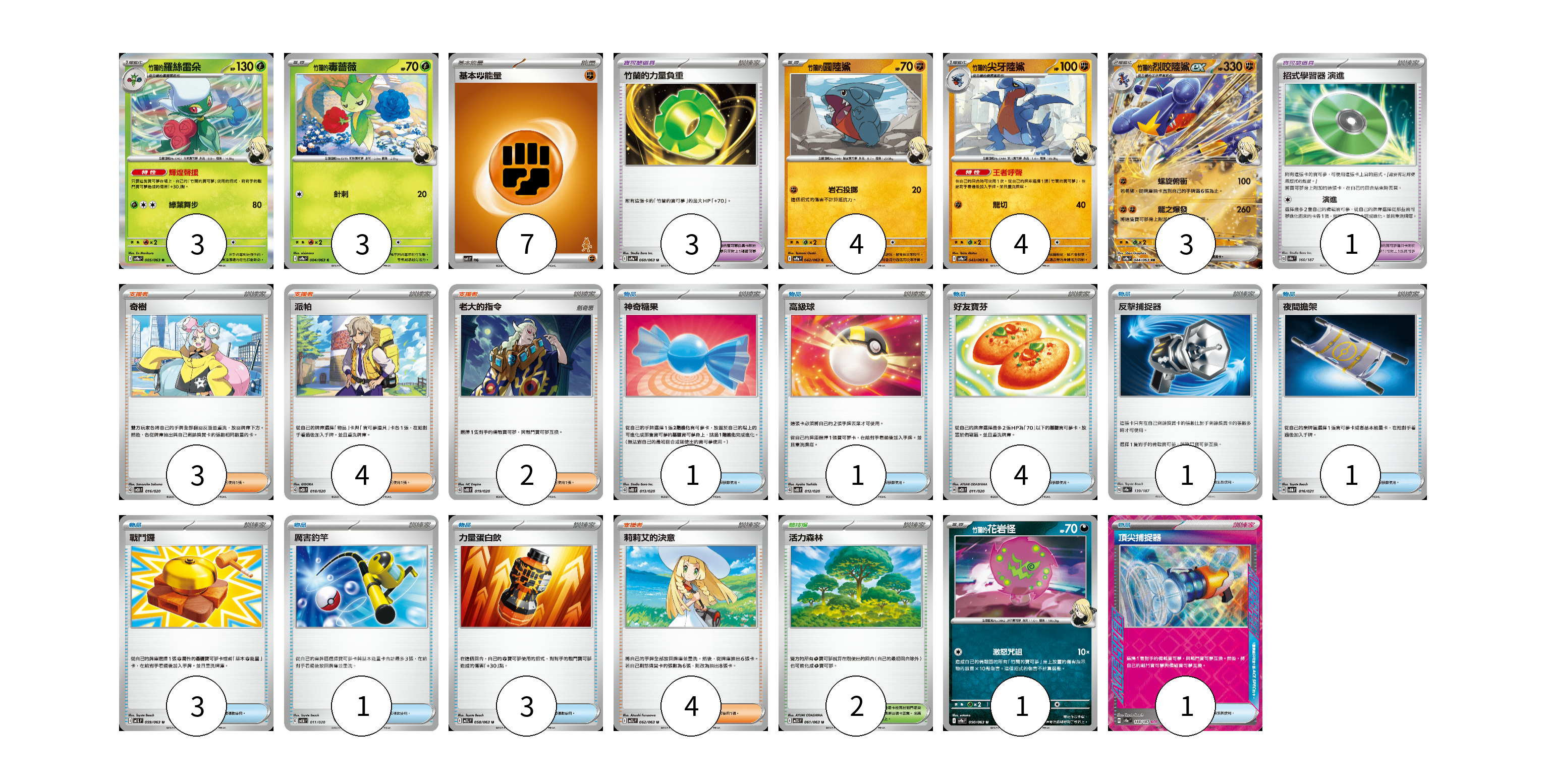 牌組構築方案 以此牌組為基礎新構築牌組 顯示卡面 顯示列表 寶可夢卡(18) 3 3 4 4 3 1 寶可夢道具(4) 3 1 物品卡(16) 1 1 4 1 1 3 1 3 1 支援者卡(13) 3 4 2 4 競技場卡(2) 2 能量卡(7) 7 寶可夢卡(18) 卡牌名稱 張數 卡牌名稱 張數 <竹蘭的>羅絲雷朵 SV9a 005/063 03 <竹蘭的>毒薔薇 SV9a 004/063 03 <竹蘭的>圓陸鯊 SV9a 042/063 04 <竹蘭的>尖牙陸鯊 SV9a 043/063 04 <竹蘭的>烈咬陸鯊ex SV9a 044/063 03 <竹蘭的>花岩怪 SV9a 050/063 01 寶可夢道具(4) 卡牌名稱 張數 卡牌名稱 張數 竹蘭的力量負重 SV9a 060/063 03 招式學習器 演進 SV8a 160/187 01 物品卡(16) 卡牌名稱 張數 卡牌名稱 張數 神奇糖果 SVOD 013/020 01 高級球 SVOD 012/020 01 好友寶芬 SVOD 011/020 04 反擊捕捉器 SV8a 139/187 01 夜間擔架 SVOM 016/021 01 戰鬥鑼 M1L 059/063 03 厲害釣竿 SVEM 011/020 01 力量蛋白飲 M1L 058/063 03 頂尖捕捉器 SV8a 148/187 01 支援者卡(13) 卡牌名稱 張數 卡牌名稱 張數 奇樹 SVOD 016/020 03 派帕 SVOD 018/020 04 老大的指令 SVOD 019/020 02 莉莉艾的決意 M1L 062/063 04 競技場卡(2) 卡牌名稱 張數 卡牌名稱 張數 活力森林 M1S 061/063 02 能量卡(7) 卡牌名稱 張數 卡牌名稱 張數 基本【鬥】能量 SVI FIG 07 以此牌組為基礎新構築牌組 牌組編碼 EpdMlh-cUEoPa-rCiLfo copy 列印牌組單 牌組編碼已複製 分享至SNS