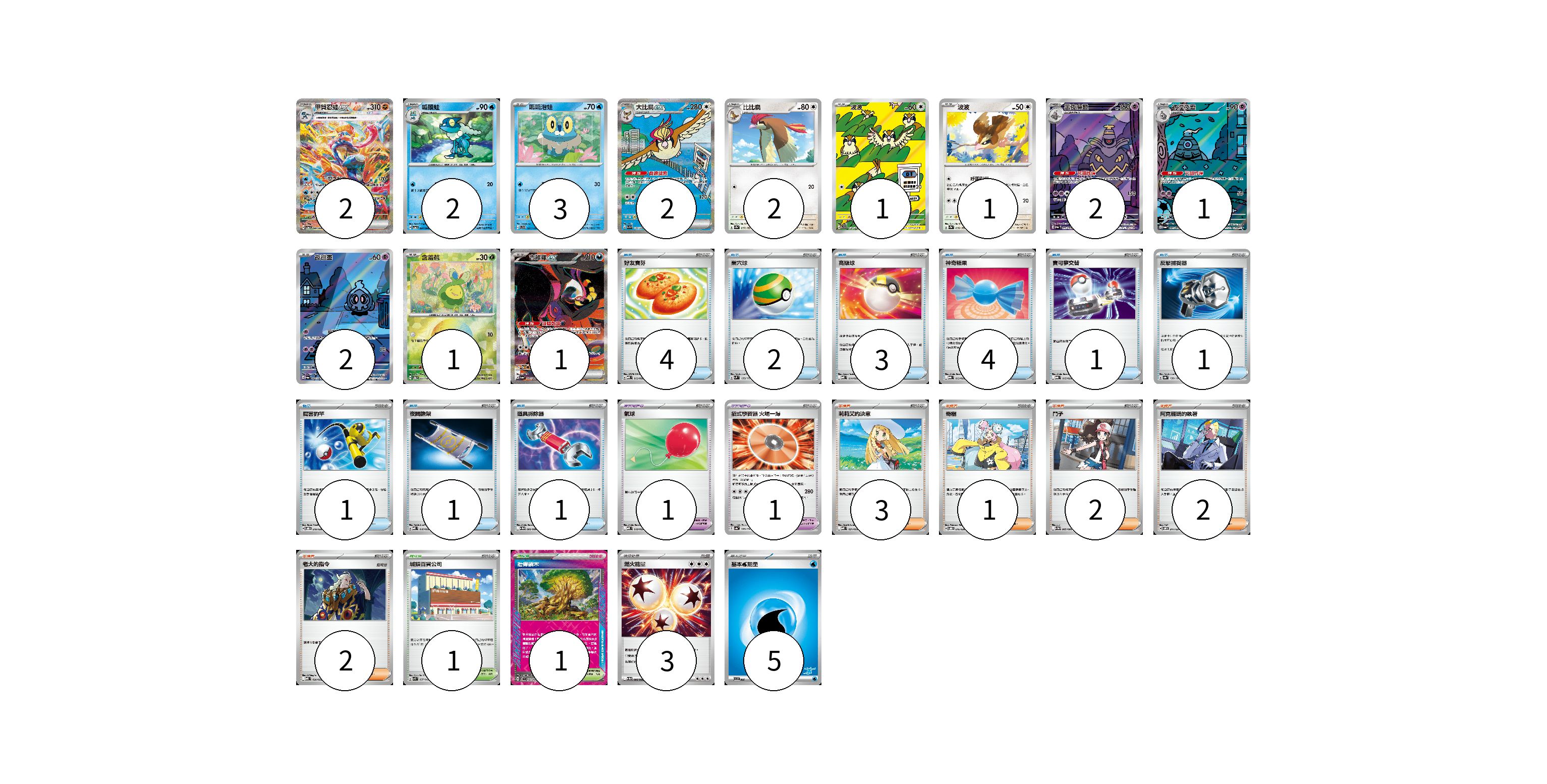 牌組構築方案 以此牌組為基礎新構築牌組 顯示卡面 顯示列表 寶可夢卡(20) 2 2 3 2 2 1 1 2 1 2 1 1 寶可夢道具(2) 1 1 物品卡(18) 4 2 3 4 1 1 1 1 1 支援者卡(10) 3 1 2 2 2 競技場卡(2) 1 1 能量卡(8) 3 5 寶可夢卡(20) 卡牌名稱 張數 卡牌名稱 張數 甲賀忍蛙ex SV5a 090/066 02 呱頭蛙 SV5a 024/066 02 呱呱泡蛙 SVD 027/139 03 大比鳥ex SV3 136/108 02 比比鳥 SV2a 017/165 02 波波 SV3 118/108 01 波波 SV2a 016/165 01 黑夜魔靈 SV6a 070/064 02 彷徨夜靈 SV6a 069/064 01 夜巡靈 SV6a 068/064 02 含羞苞 SV8a 001/187 01 吉雉雞ex SV6a 089/064 01 寶可夢道具(2) 卡牌名稱 張數 卡牌名稱 張數 氣球 MBD 018/022 01 招式學習器 火場一爆 SV4a 170/190 01 物品卡(18) 卡牌名稱 張數 卡牌名稱 張數 好友寶芬 MBD 013/022 04 巢穴球 SVM 133/175 02 高級球 MBD 014/022 03 神奇糖果 MBG 013/022 04 寶可夢交替 MBG 015/022 01 反擊捕捉器 SV8a 139/187 01 厲害釣竿 SVOD 010/020 01 夜間擔架 MBD 016/022 01 道具拆除器 SV11W 080/086 01 支援者卡(10) 卡牌名稱 張數 卡牌名稱 張數 莉莉艾的決意 MBD 021/022 03 奇樹 SVOD 016/020 01 鬥子 SV11W 085/086 02 阿克羅瑪的執著 SVOM 017/021 02 老大的指令 MBD 020/022 02 競技場卡(2) 卡牌名稱 張數 卡牌名稱 張數 城鎮百貨公司 SVK 037/042 01 壯偉碩木 SV7 101/102 01 能量卡(8) 卡牌名稱 張數 卡牌名稱 張數 燃火能量 SV11W 086/086 03 基本【水】能量 SVI WAT 05 以此牌組為基礎新構築牌組 牌組編碼 EqUAcB-cIzfoY-hMHlqo copy 列印牌組單 牌組編碼已複製 分享至SNS