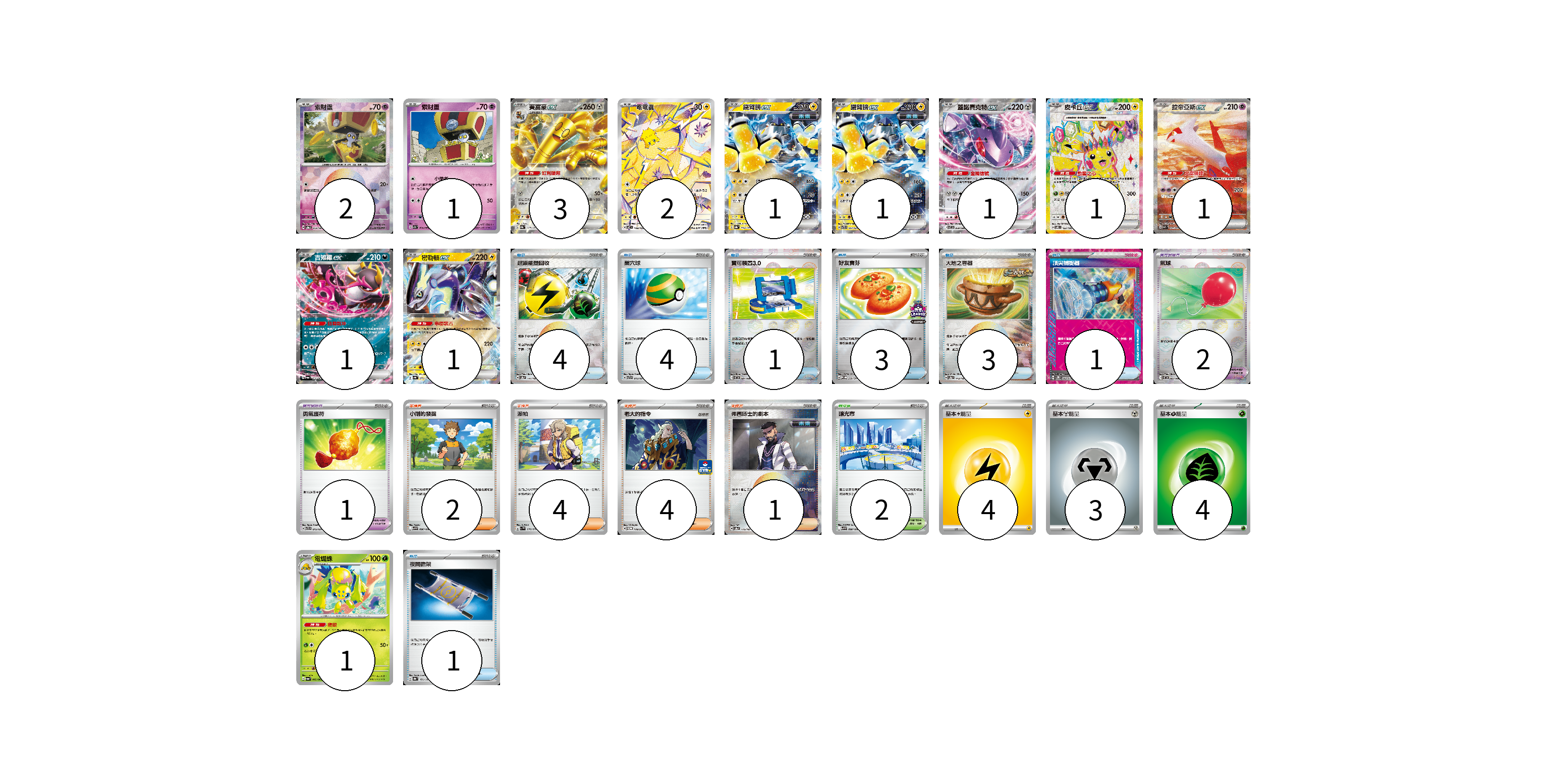 牌組構築方案 以此牌組為基礎新構築牌組 顯示卡面 顯示列表 寶可夢卡(16) 2 1 3 2 1 1 1 1 1 1 1 1 寶可夢道具(3) 2 1 物品卡(17) 4 4 1 3 3 1 1 支援者卡(11) 2 4 4 1 競技場卡(2) 2 能量卡(11) 4 3 4 寶可夢卡(16) 卡牌名稱 張數 卡牌名稱 張數 索財靈 SV8a 073/187 02 索財靈 SV7a 024/064 01 賽富豪ex SV8a 117/187 03 電電蟲 SV7 108/102 02 鐵臂膀ex SV8a 054/187 01 鐵臂膀ex SVTR 007/021 01 蓋諾賽克特ex SV11B 069/086 01 皮卡丘ex SV8 122/106 01 拉帝亞斯ex SV7a 087/064 01 吉雉雞ex SV6a 038/064 01 密勒頓ex SV4a 071/190 01 電蜘蛛 SV6a 002/064 01 寶可夢道具(3) 卡牌名稱 張數 卡牌名稱 張數 氣球 SV11B 082/086 02 勇氣護符 SVTR 015/021 01 物品卡(17) 卡牌名稱 張數 卡牌名稱 張數 超級能量回收 SV8a 141/187 04 巢穴球 SVTR 013/021 04 寶可裝置3.0 SV11B 081/086 01 好友寶芬 SV-P 230/SV-P 03 大地之容器 SV8a 143/187 03 頂尖捕捉器 SV5M 062/071 01 夜間擔架 SV8a 151/187 01 支援者卡(11) 卡牌名稱 張數 卡牌名稱 張數 小剛的發掘 SV9 096/100 02 派帕 SV1V 076/078 04 老大的指令 SV-P 178/SV-P 04 弗圖博士的劇本 SV8a 175/187 01 競技場卡(2) 卡牌名稱 張數 卡牌名稱 張數 釀光市 SV9 098/100 02 能量卡(11) 卡牌名稱 張數 卡牌名稱 張數 基本雷能量 sv-p LIG 04 基本鋼能量 sv-p MET 03 基本草能量 sv-p GRA 04 以此牌組為基礎新構築牌組 牌組編碼 ErtBKc-MVmjhI-oWEFij copy 列印牌組單 牌組編碼已複製 分享至SNS