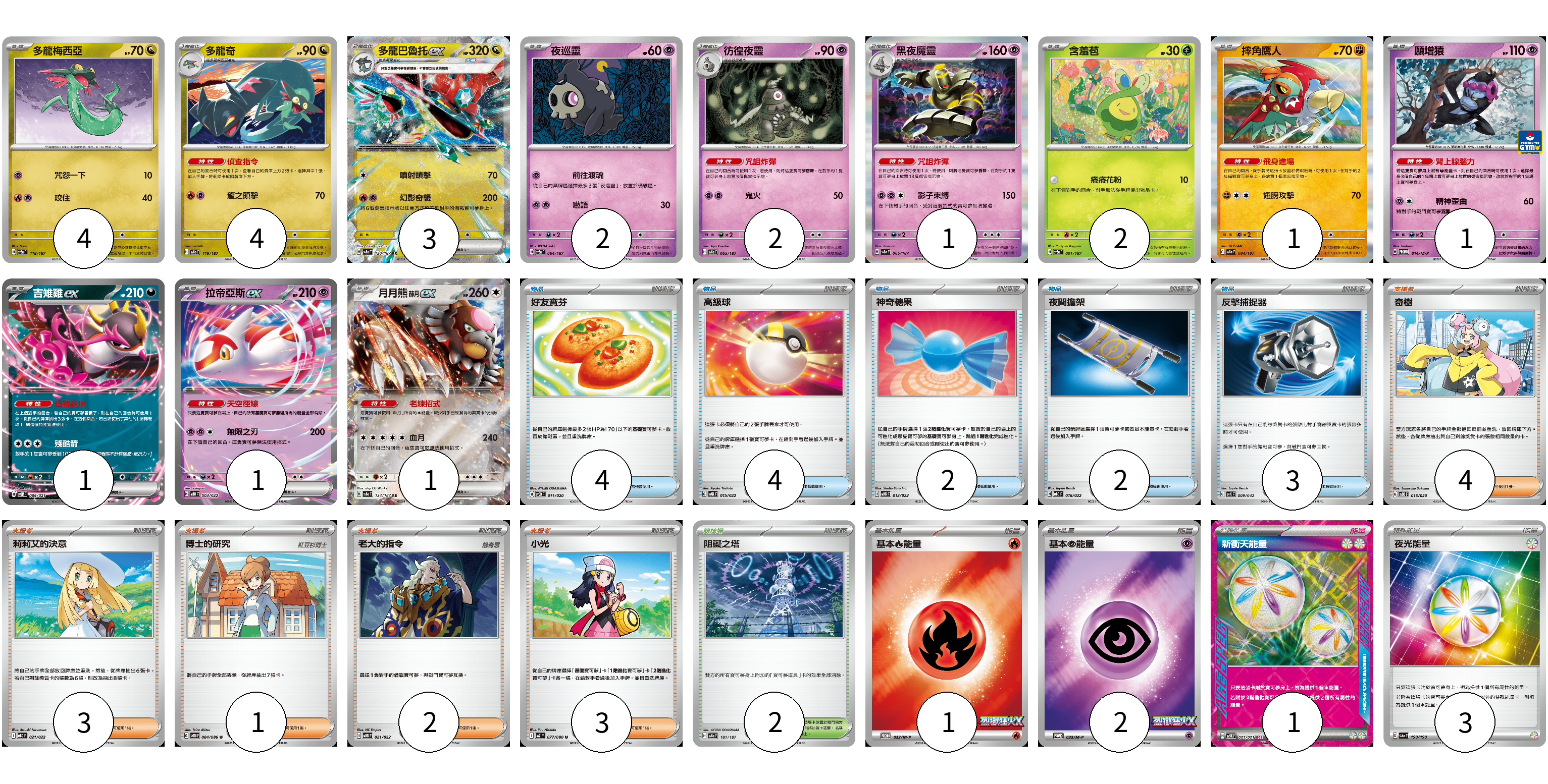 牌組構築方案 以此牌組為基礎新構築牌組 顯示卡面 顯示列表 寶可夢卡(23) 4 4 3 2 2 1 2 1 1 1 1 1 物品卡(15) 4 4 2 2 3 支援者卡(13) 4 3 1 2 3 競技場卡(2) 2 能量卡(7) 1 2 1 3 寶可夢卡(23) 卡牌名稱 張數 卡牌名稱 張數 多龍梅西亞 SV8a 118/187 04 多龍奇 SV8a 119/187 04 多龍巴魯托ex SV8a 120/187 03 夜巡靈 SV8a 064/187 02 彷徨夜靈 SV8a 065/187 02 黑夜魔靈 SV8a 066/187 01 含羞苞 SV8a 001/187 02 摔角鷹人 SV8a 084/187 01 願增猿 M-P 014/M-P 01 吉雉雞ex SVOM 009/021 01 拉帝亞斯ex MBD 003/022 01 月月熊 赫月ex SV8a 134/187 01 物品卡(15) 卡牌名稱 張數 卡牌名稱 張數 好友寶芬 SVOD 011/020 04 高級球 SVQL 015/022 04 神奇糖果 MBG 013/022 02 夜間擔架 MBD 016/022 02 反擊捕捉器 SVK 009/042 03 支援者卡(13) 卡牌名稱 張數 卡牌名稱 張數 奇樹 SVOD 016/020 04 莉莉艾的決意 MBD 021/022 03 博士的研究 SV11B 084/086 01 老大的指令 MBG 021/022 02 小光 M2 077/080 03 競技場卡(2) 卡牌名稱 張數 卡牌名稱 張數 阻礙之塔 SV8a 181/187 02 能量卡(7) 卡牌名稱 張數 卡牌名稱 張數 基本【火】能量 M-P 032/M-P 01 基本【超】能量 M-P 033/M-P 02 新衝天能量 SV5K 071/071 01 夜光能量 SV4a 190/190 03 以此牌組為基礎新構築牌組 牌組編碼 EsfQQs-wcgIOJ-IGmYnp copy 列印牌組單 牌組編碼已複製 分享至SNS