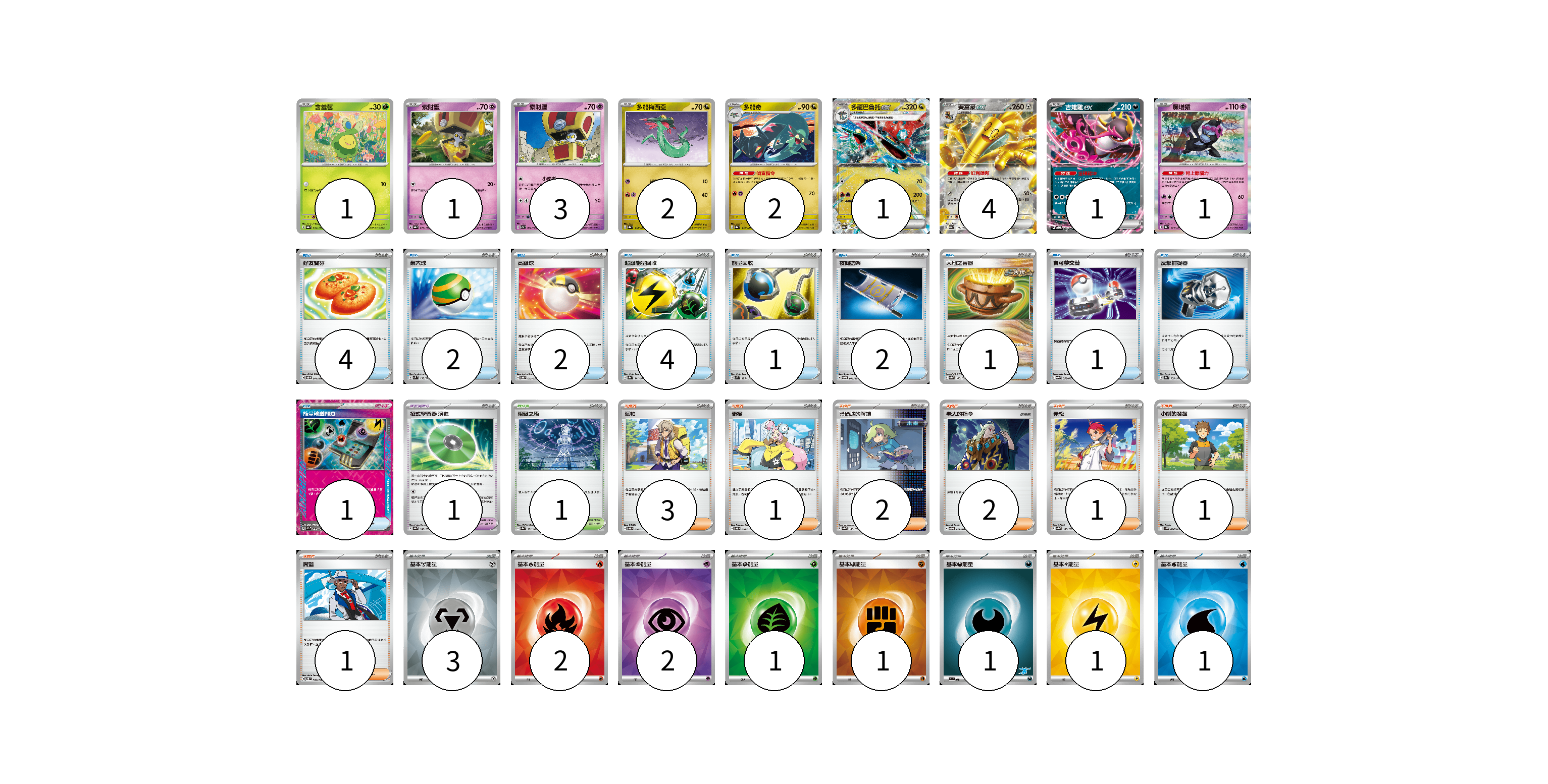 牌組構築方案 以此牌組為基礎新構築牌組 顯示卡面 顯示列表 寶可夢卡(16) 1 1 3 2 2 1 4 1 1 寶可夢道具(1) 1 物品卡(19) 4 2 2 4 1 2 1 1 1 1 支援者卡(11) 3 1 2 2 1 1 1 競技場卡(1) 1 能量卡(12) 3 2 2 1 1 1 1 1 寶可夢卡(16) 卡牌名稱 張數 卡牌名稱 張數 含羞苞 SV8a 001/187 01 索財靈 SV8a 073/187 01 索財靈 SV7a 024/064 03 多龍梅西亞 SV8a 118/187 02 多龍奇 SV8a 119/187 02 多龍巴魯托ex SV8a 120/187 01 賽富豪ex SV8a 117/187 04 吉雉雞ex SVOD 004/020 01 願增猿 SV8a 075/187 01 寶可夢道具(1) 卡牌名稱 張數 卡牌名稱 張數 招式學習器 演進 SV8a 160/187 01 物品卡(19) 卡牌名稱 張數 卡牌名稱 張數 好友寶芬 SVOD 011/020 04 巢穴球 SVM 133/175 02 高級球 SVOD 012/020 02 超級能量回收 SV8a 141/187 04 能量回收 SVM 125/175 01 夜間擔架 SVOM 016/021 02 大地之容器 SV8a 143/187 01 寶可夢交替 SV9a 058/063 01 反擊捕捉器 SV8a 139/187 01 能量輸送PRO SV7a 052/064 01 支援者卡(11) 卡牌名稱 張數 卡牌名稱 張數 派帕 SVOD 018/020 03 奇樹 SVOD 016/020 01 暗碼迷的解讀 SV8a 165/187 02 老大的指令 SVOD 019/020 02 赤松 SV8a 163/187 01 小剛的發掘 SV9 096/100 01 席藍 SV8 102/106 01 競技場卡(1) 卡牌名稱 張數 卡牌名稱 張數 阻礙之塔 SV8a 181/187 01 能量卡(12) 卡牌名稱 張數 卡牌名稱 張數 基本【鋼】能量 SVK MET 03 基本【火】能量 SVK FIR 02 基本【超】能量 SVK PSY 02 基本【草】能量 SVK GRA 01 基本【鬥】能量 SVK FIG 01 基本【惡】能量 SVI DAR 01 基本【雷】能量 SVK LIG 01 基本【水】能量 SVK WAT 01 以此牌組為基礎新構築牌組 牌組編碼 EsopAK-ZZUeQZ-YrEVpF copy 列印牌組單 牌組編碼已複製 分享至SNS