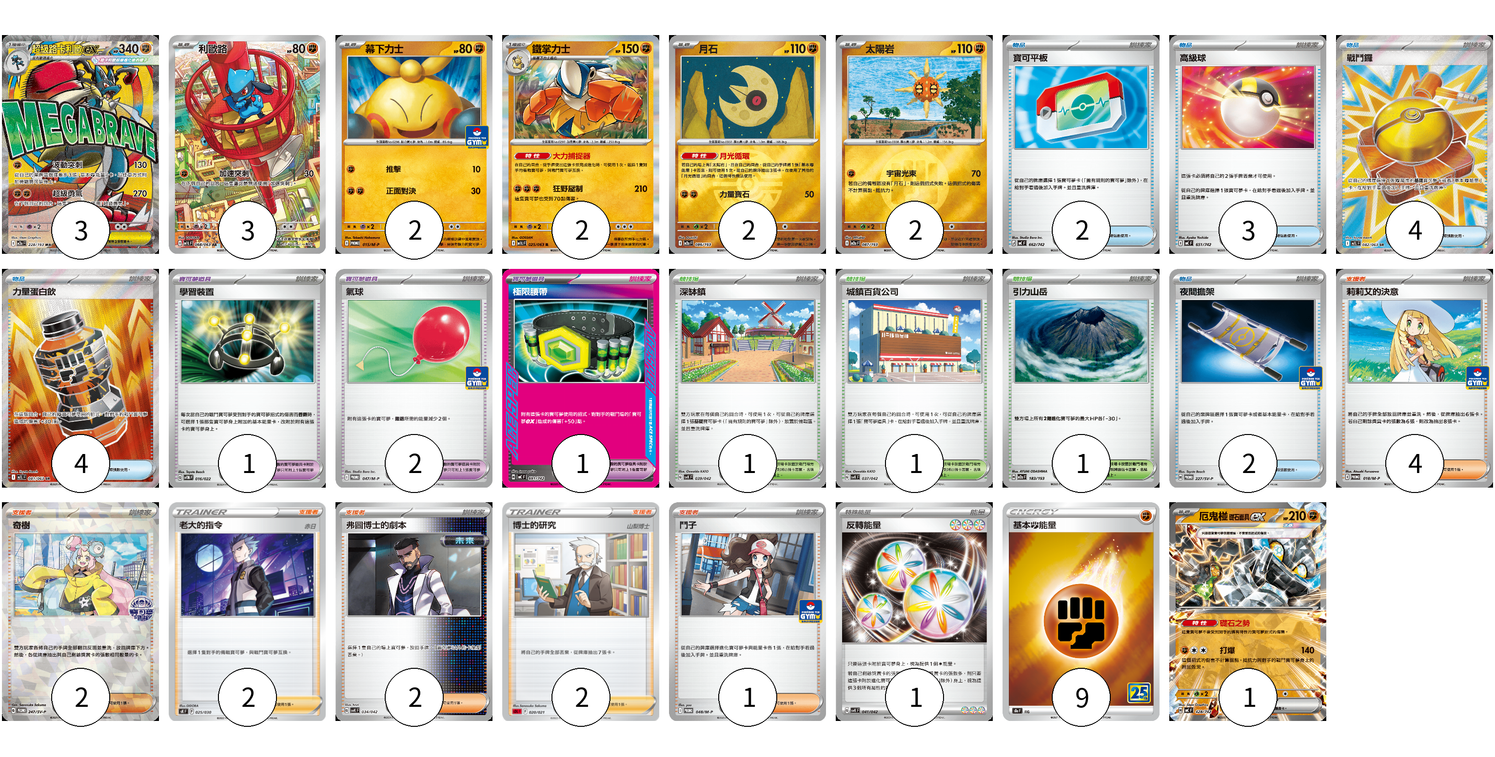 牌組構築方案 以此牌組為基礎新構築牌組 顯示卡面 顯示列表 寶可夢卡(15) 3 3 2 2 2 2 1 寶可夢道具(4) 1 2 1 物品卡(15) 2 3 4 4 2 支援者卡(13) 4 2 2 2 2 1 競技場卡(3) 1 1 1 能量卡(10) 1 9 寶可夢卡(15) 卡牌名稱 張數 卡牌名稱 張數 超級路卡利歐ex M2a 228/193 03 利歐路 M1L 068/063 03 幕下力士 M-P 015/M-P 02 鐵掌力士 M1L 025/063 02 月石 M2a 086/193 02 太陽岩 M2a 087/193 02 厄鬼椪 礎石面具ex MC 428/742 01 寶可夢道具(4) 卡牌名稱 張數 卡牌名稱 張數 學習裝置 SVTM 016/022 01 氣球 M-P 047/M-P 02 極限腰帶 MC 691/742 01 物品卡(15) 卡牌名稱 張數 卡牌名稱 張數 寶可平板 MC 662/742 02 高級球 MC 651/742 03 戰鬥鑼 M1L 082/063 04 力量蛋白飲 M1L 081/063 04 夜間擔架 SV-P 227/SV-P 02 支援者卡(13) 卡牌名稱 張數 卡牌名稱 張數 莉莉艾的決意 M-P 018/M-P 04 奇樹 SV-P 247/SV-P 02 老大的指令(赤日) SK 025/030 02 弗圖博士的劇本 SVK 034/042 02 博士的研究(山梨博士) SDL 020/021 02 鬥子 M-P 048/M-P 01 競技場卡(3) 卡牌名稱 張數 卡牌名稱 張數 深缽鎮 SVK 039/042 01 城鎮百貨公司 SVK 037/042 01 引力山岳 M2a 183/193 01 能量卡(10) 卡牌名稱 張數 卡牌名稱 張數 反轉能量 SVK 041/042 01 基本鬥能量 S8a FIG 09 以此牌組為基礎新構築牌組 牌組編碼 Esrwad-ckMkla-aNbeIp copy 列印牌組單 牌組編碼已複製 分享至SNS