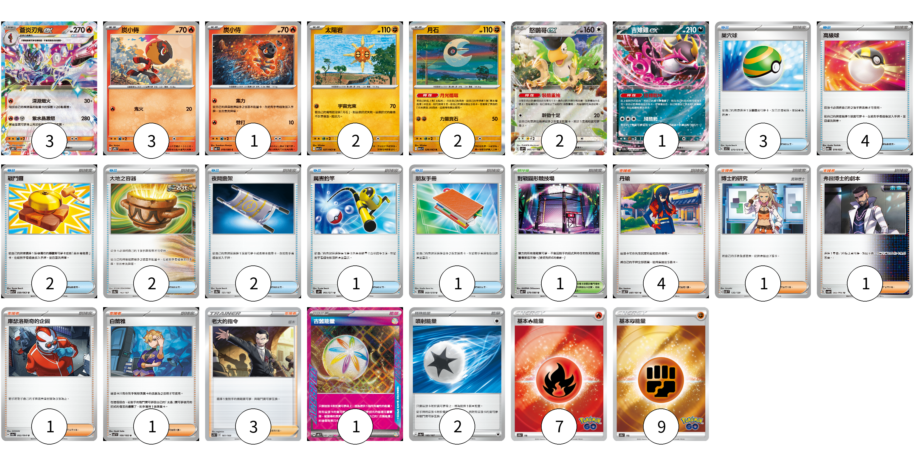 牌組構築方案 以此牌組為基礎新構築牌組 顯示卡面 顯示列表 寶可夢卡(14) 3 3 1 2 2 2 1 物品卡(15) 3 4 2 2 2 1 1 支援者卡(11) 4 1 1 1 1 3 競技場卡(1) 1 能量卡(19) 1 2 7 9 寶可夢卡(14) 卡牌名稱 張數 卡牌名稱 張數 蒼炎刃鬼ex SVPS 006/008 03 炭小侍 SVPS 005/008 03 炭小侍 M2 019/080 01 太陽岩 M1L 027/063 02 月石 M1L 026/063 02 怒鸚哥ex SV2P 065/071 02 吉雉雞ex SV6a 038/064 01 物品卡(15) 卡牌名稱 張數 卡牌名稱 張數 巢穴球 SV1S 070/078 03 高級球 MBD 014/022 04 戰鬥鑼 M1L 059/063 02 大地之容器 SV8a 143/187 02 夜間擔架 SV8a 151/187 02 厲害釣竿 SV2P 066/071 01 朋友手冊 SV1S 069/078 01 支援者卡(11) 卡牌名稱 張數 卡牌名稱 張數 丹瑜 SV6 097/101 04 博士的研究(奧琳博士) SVD 135/139 01 弗圖博士的劇本 SV4M 065/066 01 庫瑟洛斯奇的企圖 SV6a 062/064 01 白蕾雅 SV7 100/102 01 老大的指令(坂木) SC1D 161/164 03 競技場卡(1) 卡牌名稱 張數 卡牌名稱 張數 對戰圓形競技場 M2 079/080 01 能量卡(19) 卡牌名稱 張數 卡牌名稱 張數 古舊能量 SV6 101/101 01 噴射能量 SV8a 185/187 02 基本火能量 S10b FIR 07 基本鬥能量 S10b FIG 09 以此牌組為基礎新構築牌組 牌組編碼 EuGAuJ-jbZAzb-OOkBng copy 列印牌組單 牌組編碼已複製 分享至SNS