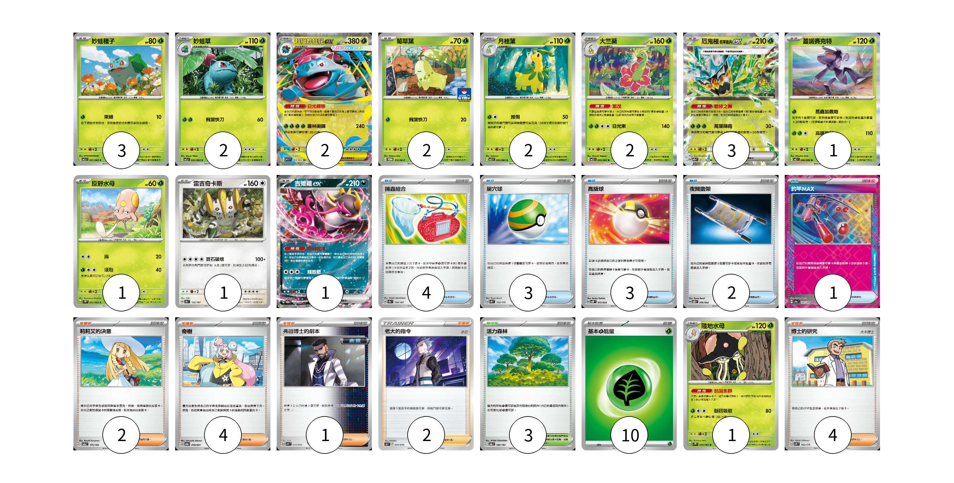 牌組構築方案 以此牌組為基礎新構築牌組 顯示卡面 顯示列表 寶可夢卡(21) 3 2 2 2 2 2 3 1 1 1 1 1 物品卡(13) 4 3 3 2 1 支援者卡(13) 2 4 1 2 4 競技場卡(3) 3 能量卡(10) 10 寶可夢卡(21) 卡牌名稱 張數 卡牌名稱 張數 妙蛙種子 M1L 001/063 03 妙蛙草 M1L 002/063 02 超級妙蛙花ex M1L 003/063 02 菊草葉 M-P 012/M-P 02 月桂葉 M1S 004/063 02 大竺葵 M1S 005/063 02 厄鬼椪 碧草面具ex M2a 017/193 03 蓋諾賽克特 M2 008/080 01 原野水母 SV4M 007/066 01 雷吉奇卡斯 SV8a 132/187 01 吉雉雞ex M2a 114/193 01 陸地水母 SV4M 008/066 01 物品卡(13) 卡牌名稱 張數 卡牌名稱 張數 捕蟲組合 SV8a 150/187 04 巢穴球 SVM 133/175 03 高級球 SVQP 015/023 03 夜間擔架 MBD 016/022 02 釣竿MAX SV8a 142/187 01 支援者卡(13) 卡牌名稱 張數 卡牌名稱 張數 莉莉艾的決意 M2a 175/193 02 奇樹 SVOM 018/021 04 弗圖博士的劇本 SVK 034/042 01 老大的指令(赤日) SK 025/030 02 博士的研究 SVM 162/175 04 競技場卡(3) 卡牌名稱 張數 卡牌名稱 張數 活力森林 M2a 182/193 03 能量卡(10) 卡牌名稱 張數 卡牌名稱 張數 基本草能量 sv-p GRA 10 以此牌組為基礎新構築牌組 牌組編碼 EurCPL-xJWAXf-eyIAip copy 列印牌組單 牌組編碼已複製 分享至SNS