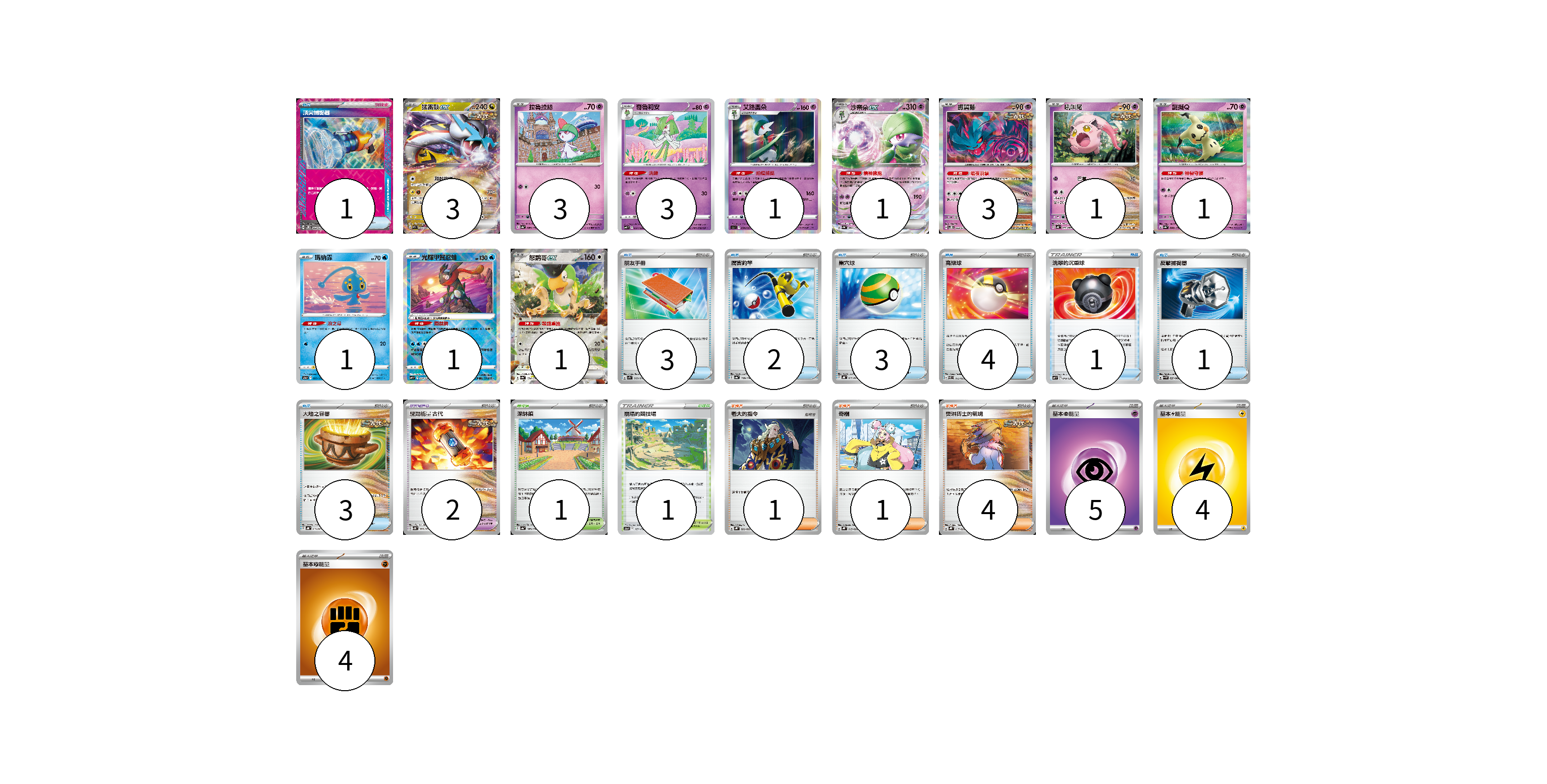 牌組構築方案 以此牌組為基礎新構築牌組 顯示卡面 顯示列表 寶可夢卡(19) 3 3 3 1 1 3 1 1 1 1 1 寶可夢道具(2) 2 物品卡(18) 1 3 2 3 4 1 1 3 支援者卡(6) 1 1 4 競技場卡(2) 1 1 能量卡(13) 5 4 4 寶可夢卡(19) 卡牌名稱 張數 卡牌名稱 張數 猛雷鼓ex SV5K 053/071 03 拉魯拉絲 SV4a 080/190 03 奇魯莉安 SVF 007/038 03 艾路雷朵 S9a 034/067 01 沙奈朵ex SV4a 082/190 01 振翼髮 SV5K 033/071 03 吼叫尾 SV4K 032/066 01 謎擬Q SV4a 088/190 01 瑪納霏 S12a 029/172 01 光輝甲賀忍蛙 SVF 004/038 01 怒鸚哥ex SV4a 154/190 01 寶可夢道具(2) 卡牌名稱 張數 卡牌名稱 張數 驅勁能量 古代 SV5K 065/071 02 物品卡(18) 卡牌名稱 張數 卡牌名稱 張數 頂尖捕捉器 SV5M 062/071 01 朋友手冊 SV1S 069/078 03 厲害釣竿 SV4a 158/190 02 巢穴球 SVHK 012/022 03 高級球 SVEL 012/020 04 洗翠的沉重球 SVF 019/038 01 反擊捕捉器 SV4M 059/066 01 大地之容器 SVHK 011/022 03 支援者卡(6) 卡牌名稱 張數 卡牌名稱 張數 老大的指令 SVHK 022/022 01 奇樹 SVHK 019/022 01 奧琳博士的氣魄 SVHK 017/022 04 競技場卡(2) 卡牌名稱 張數 卡牌名稱 張數 深缽鎮 SV4a 185/190 01 崩塌的競技場 S12a 167/172 01 能量卡(13) 卡牌名稱 張數 卡牌名稱 張數 基本【超】能量 SVHM PSY 05 基本【雷】能量 SVHM LIG 04 基本【鬥】能量 SVHK FIG 04 以此牌組為基礎新構築牌組 牌組編碼 ExDjlu-eOsMDK-rFFBgw copy 列印牌組單 牌組編碼已複製 分享至SNS