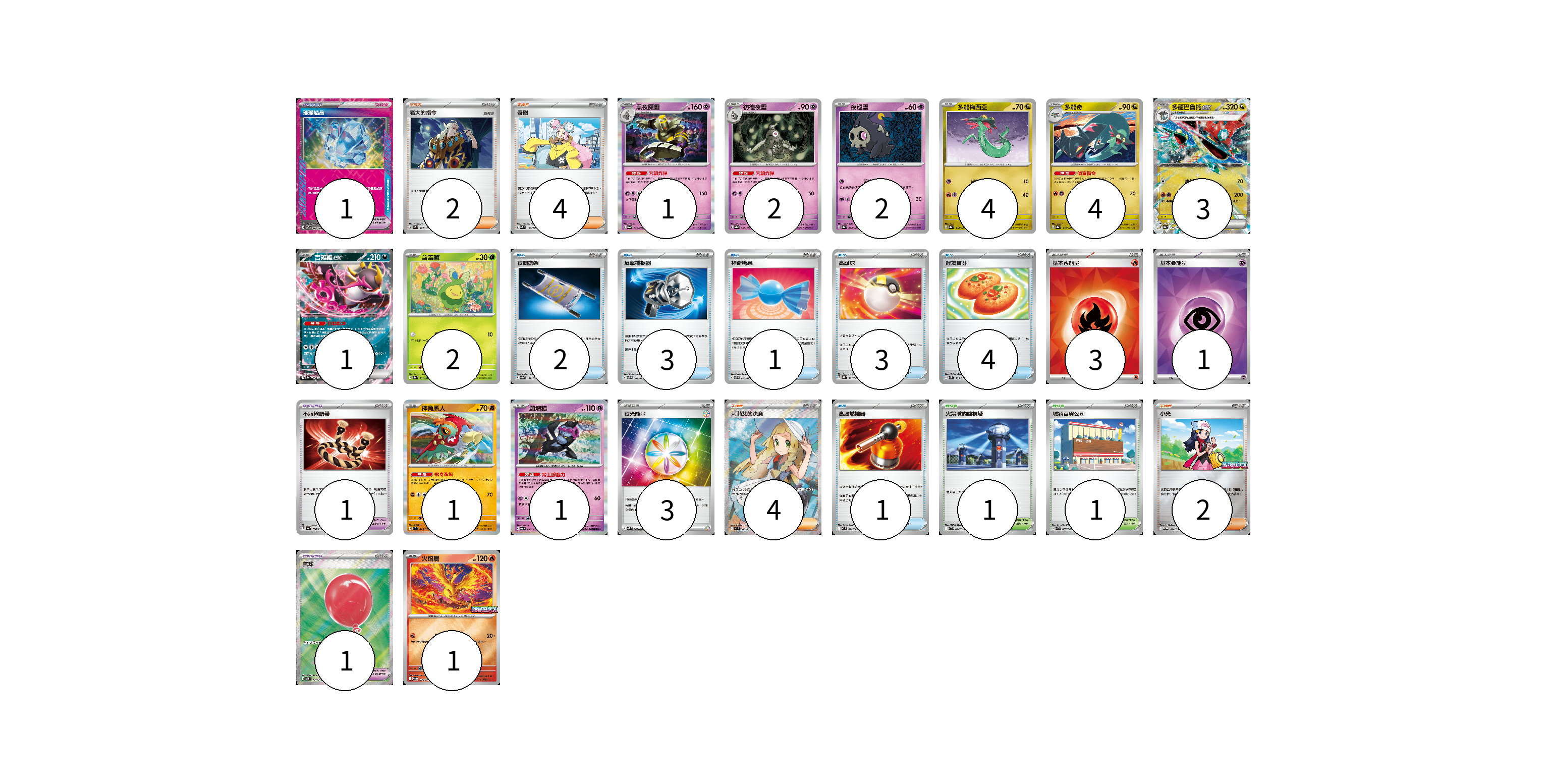 牌組構築方案 以此牌組為基礎新構築牌組 顯示卡面 顯示列表 寶可夢卡(22) 1 2 2 4 4 3 1 2 1 1 1 寶可夢道具(3) 1 1 1 物品卡(14) 2 3 1 3 4 1 支援者卡(12) 2 4 4 2 競技場卡(2) 1 1 能量卡(7) 3 1 3 寶可夢卡(22) 卡牌名稱 張數 卡牌名稱 張數 黑夜魔靈 SV6a 020/064 01 彷徨夜靈 SV8a 065/187 02 夜巡靈 SV8a 064/187 02 多龍梅西亞 SV8a 118/187 04 多龍奇 SV8a 119/187 04 多龍巴魯托ex SV8a 120/187 03 吉雉雞ex SV8a 104/187 01 含羞苞 SV8a 001/187 02 摔角鷹人 SV1S 045/078 01 願增猿 SV6 055/101 01 火焰鳥 M-P 022/M-P 01 寶可夢道具(3) 卡牌名稱 張數 卡牌名稱 張數 璀璨結晶 SV7 094/102 01 不服輸頭帶 SV4a 168/190 01 氣球 M1L 084/063 01 物品卡(14) 卡牌名稱 張數 卡牌名稱 張數 夜間擔架 SV8a 151/187 02 反擊捕捉器 SVTS 009/022 03 神奇糖果 SVTS 015/022 01 高級球 SVHK 013/022 03 好友寶芬 SV5K 063/071 04 高溫燃燒器 M2 074/080 01 支援者卡(12) 卡牌名稱 張數 卡牌名稱 張數 老大的指令 SVM 172/175 02 奇樹 SVM 160/175 04 莉莉艾的決意 M1L 086/063 04 小光 M-P 028/M-P 02 競技場卡(2) 卡牌名稱 張數 卡牌名稱 張數 火箭隊的監視塔 SV10 096/098 01 城鎮百貨公司 SVK 037/042 01 能量卡(7) 卡牌名稱 張數 卡牌名稱 張數 基本【火】能量 SVK FIR 03 基本【超】能量 SVK PSY 01 夜光能量 SVK 042/042 03 以此牌組為基礎新構築牌組 牌組編碼 Eygeqm-rWwqVg-rzcJtI copy 列印牌組單 牌組編碼已複製 分享至SNS