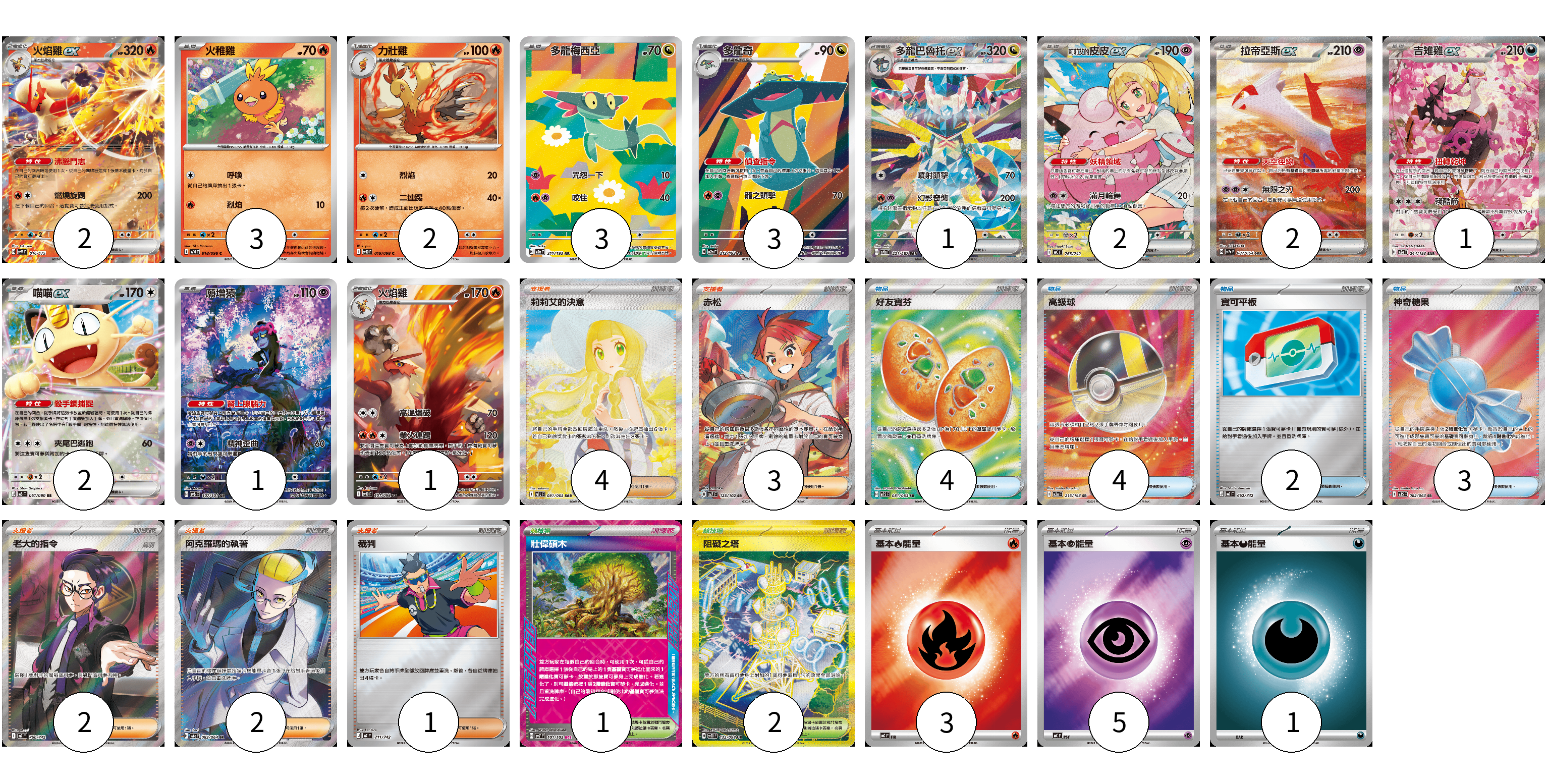 牌組構築方案 以此牌組為基礎新構築牌組 顯示卡面 顯示列表 寶可夢卡(23) 2 3 2 3 3 1 2 2 1 2 1 1 物品卡(13) 4 4 2 3 支援者卡(12) 4 3 2 2 1 競技場卡(3) 1 2 能量卡(9) 3 5 1 寶可夢卡(23) 卡牌名稱 張數 卡牌名稱 張數 火焰雞ex SVM 016/175 02 火稚雞 SV10 018/098 03 力壯雞 SV10 019/098 02 多龍梅西亞 M2a 211/193 03 多龍奇 M2a 212/193 03 多龍巴魯托ex SV8a 221/187 01 莉莉艾的皮皮ex MC 765/742 02 拉帝亞斯ex SV7a 087/064 02 吉雉雞ex M2a 244/193 01 喵喵ex M3 061/080 02 願增猿 SV6 107/101 01 火焰雞 SV10 101/098 01 物品卡(13) 卡牌名稱 張數 卡牌名稱 張數 好友寶芬 M1S 081/063 04 高級球 M2a 216/193 04 寶可平板 MC 662/742 02 神奇糖果 M1S 082/063 03 支援者卡(12) 卡牌名稱 張數 卡牌名稱 張數 莉莉艾的決意 M1L 091/063 04 赤松 SV7 123/102 03 老大的指令(烏羽) MC 760/742 02 阿克羅瑪的執著 SV6a 083/064 02 裁判 MC 711/742 01 競技場卡(3) 卡牌名稱 張數 卡牌名稱 張數 壯偉碩木 SV7 101/102 01 阻礙之塔 SV10 132/098 02 能量卡(9) 卡牌名稱 張數 卡牌名稱 張數 基本【火】能量 MC FIR 03 基本【超】能量 MC PSY 05 基本【惡】能量 MC DAR 01 以此牌組為基礎新構築牌組 牌組編碼 EzEOat-AjJXjA-ktKInm copy 列印牌組單 牌組編碼已複製 分享至SNS